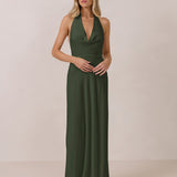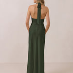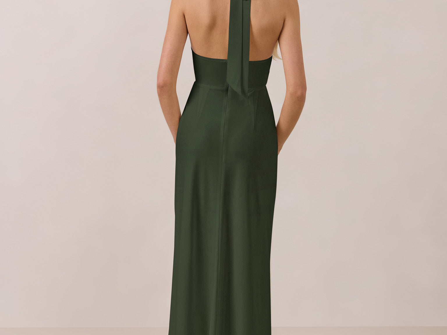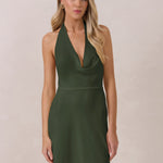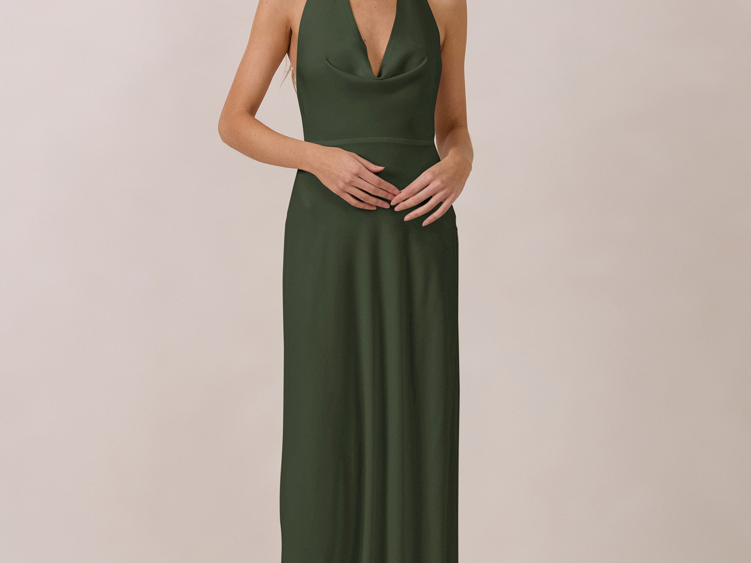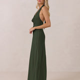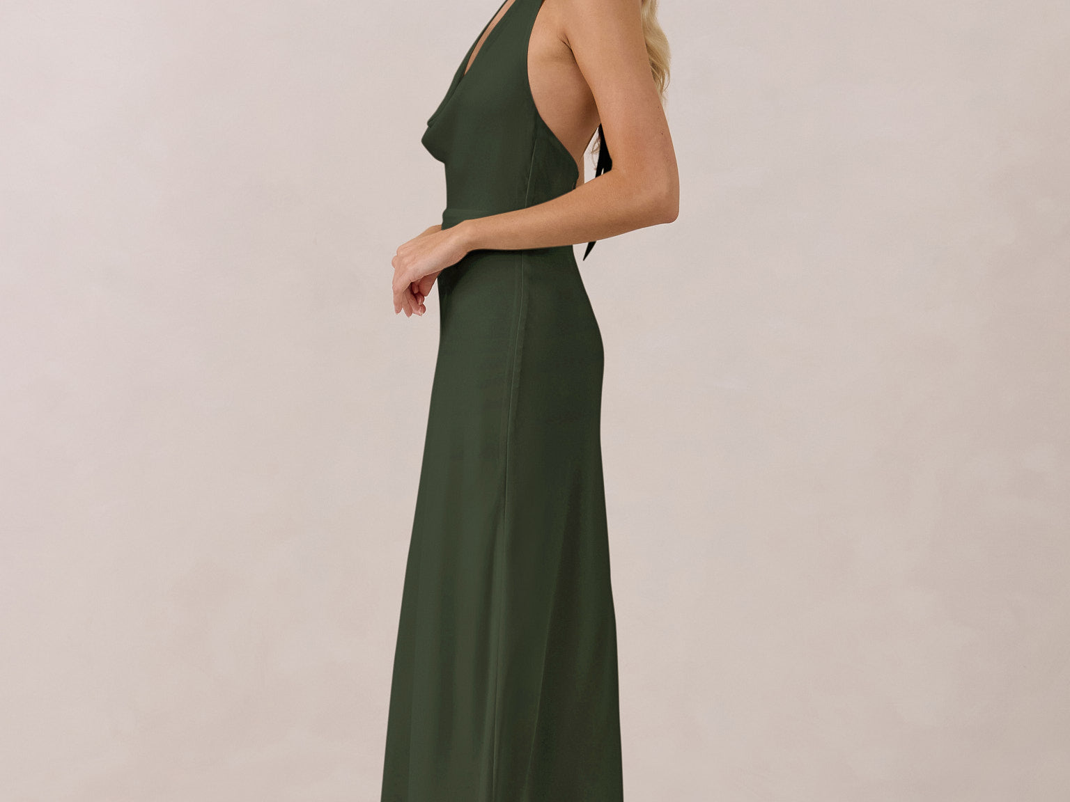 This elegant, full-length chiffon dress is designed to move gracefully, with a lustrous finish that highlights the delicate halter back and the softly draped cowl neckline. An unforgettable, timeless piece perfect for any special occasion.