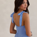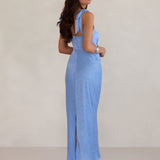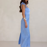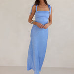 Featuring a sleek square neckline and thick tie straps, this style provides an effortless yet structured fit. The slim-fit skirt skims the body for a smooth, elongated silhouette, while an invisible back zipper ensures a seamless finish. Perfect for elevated evenings.
