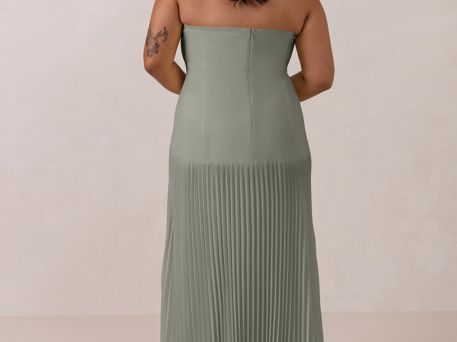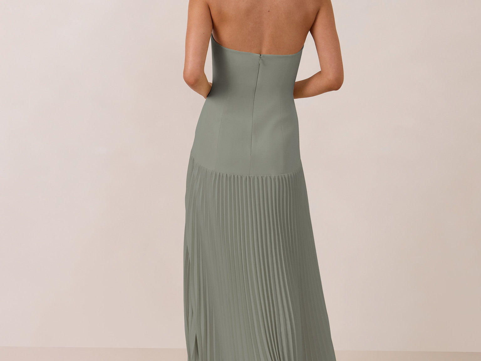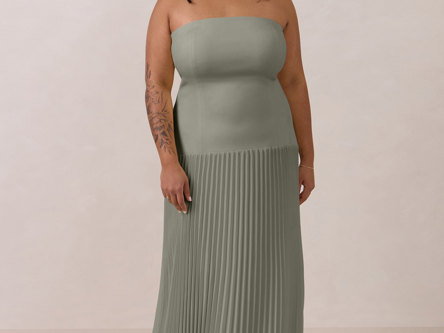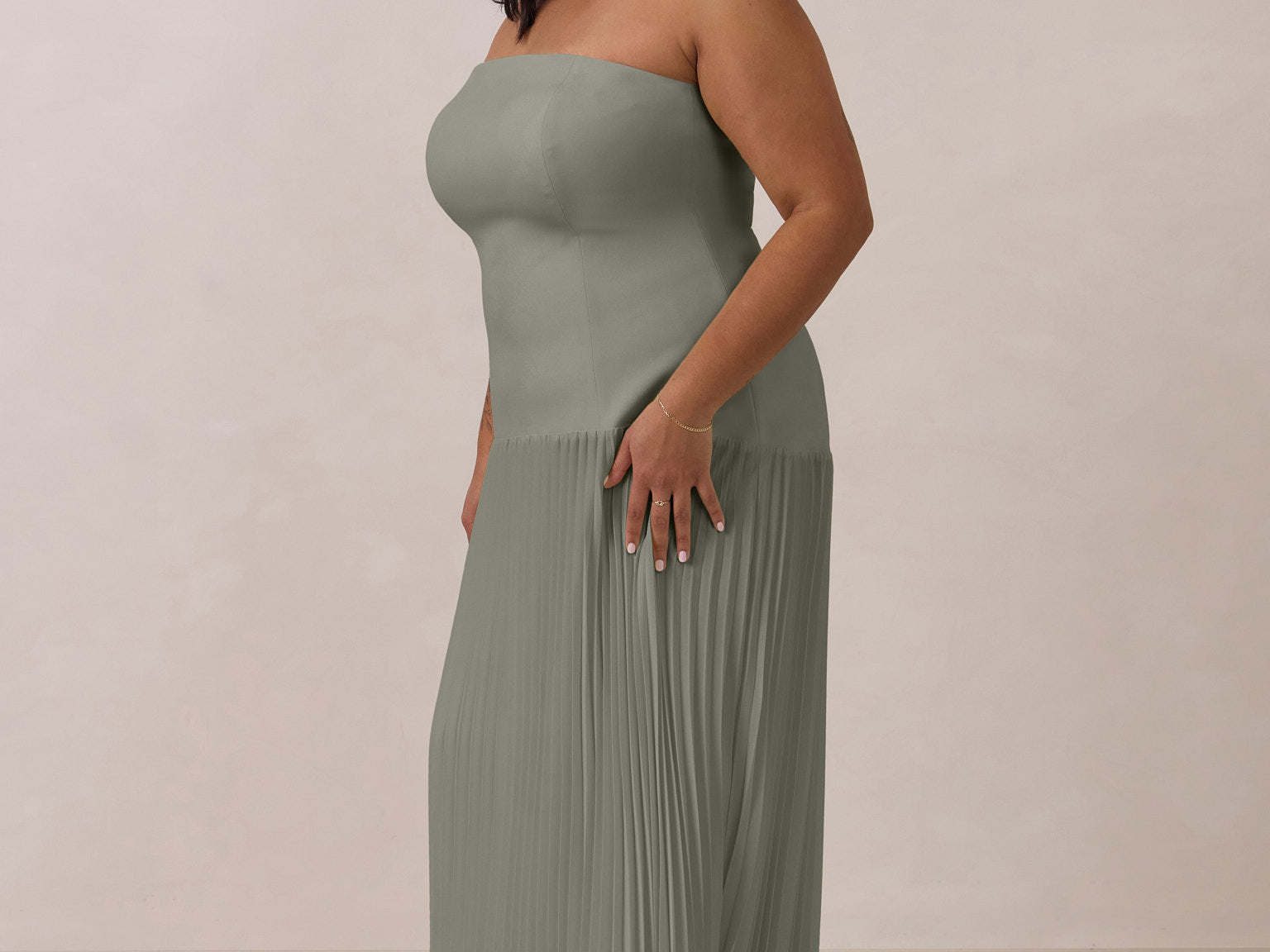 This dress captivates with its sleek stretch-crepe bodice and dreamy pleated skirt. The stretch crepe molds gently to your shape for a comfortable, supportive and flattering fit, while the lightweight skirt offers easy, effortless movement.