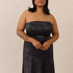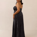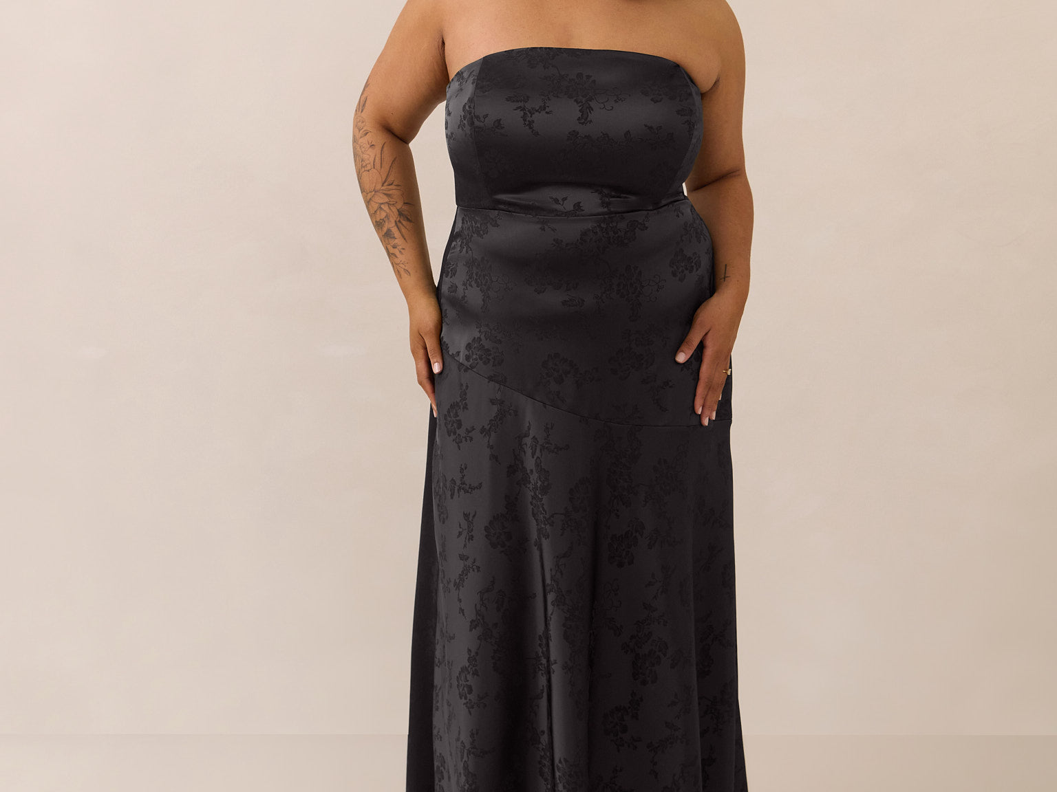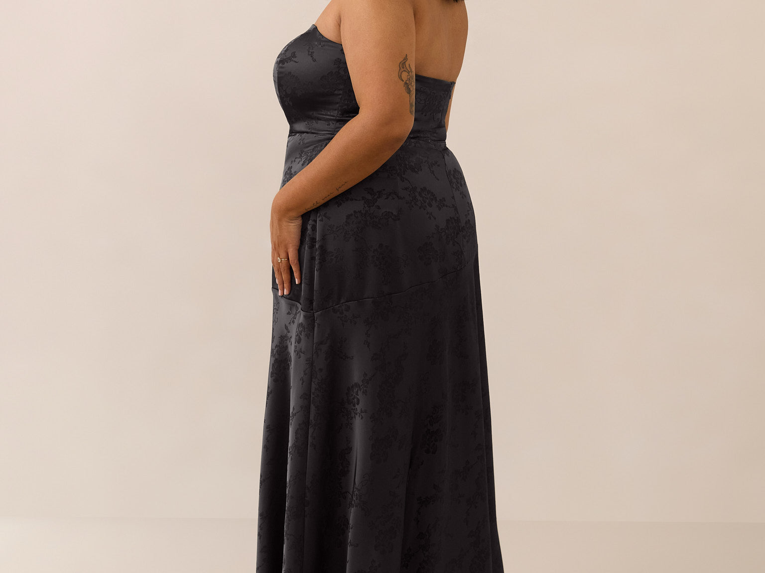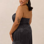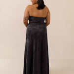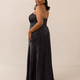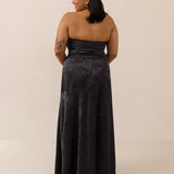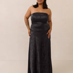 The Delaney is a full-length, strapless silhouette crafted from luxurious Jacquard satin. Clean lines and a smooth, sculpted bodice create a timeless look, while the sleek finish makes it an elevated choice for any bridal party.