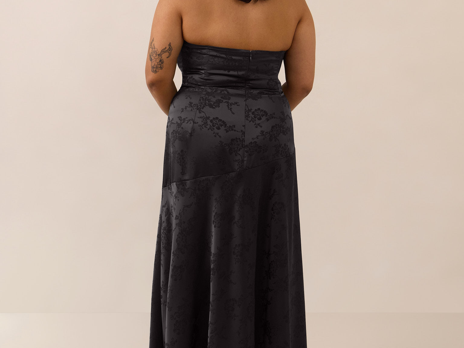 - Fitted strapless bodice with boning