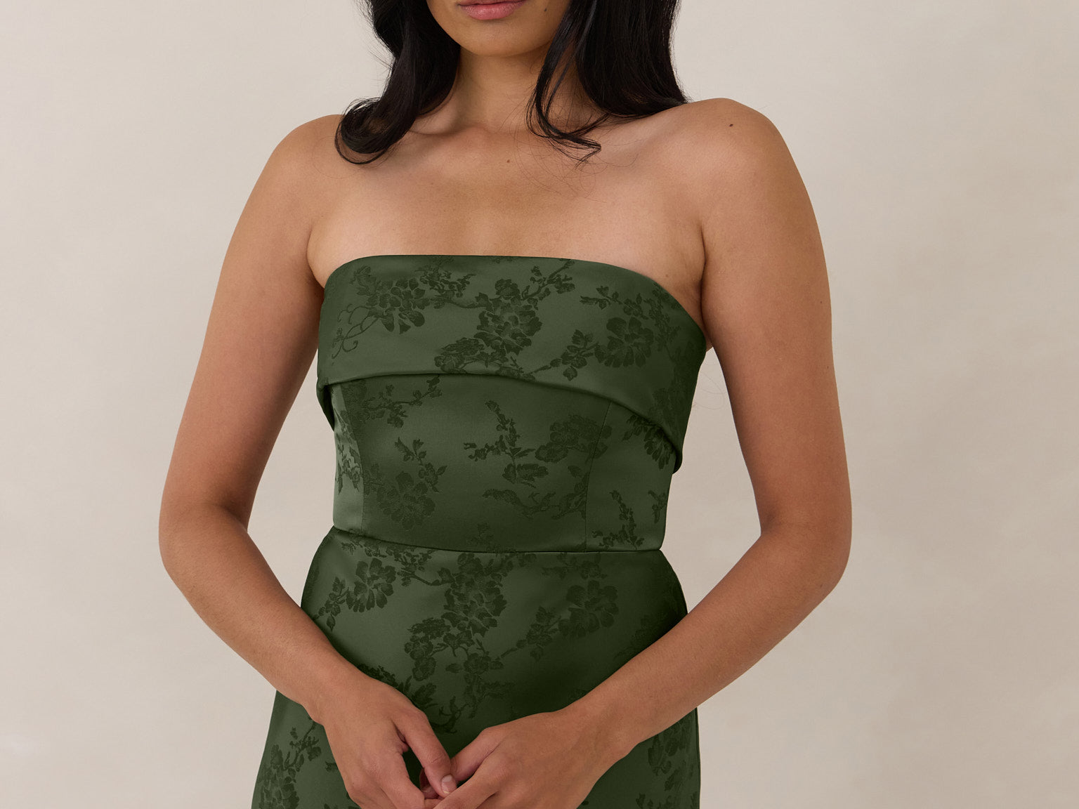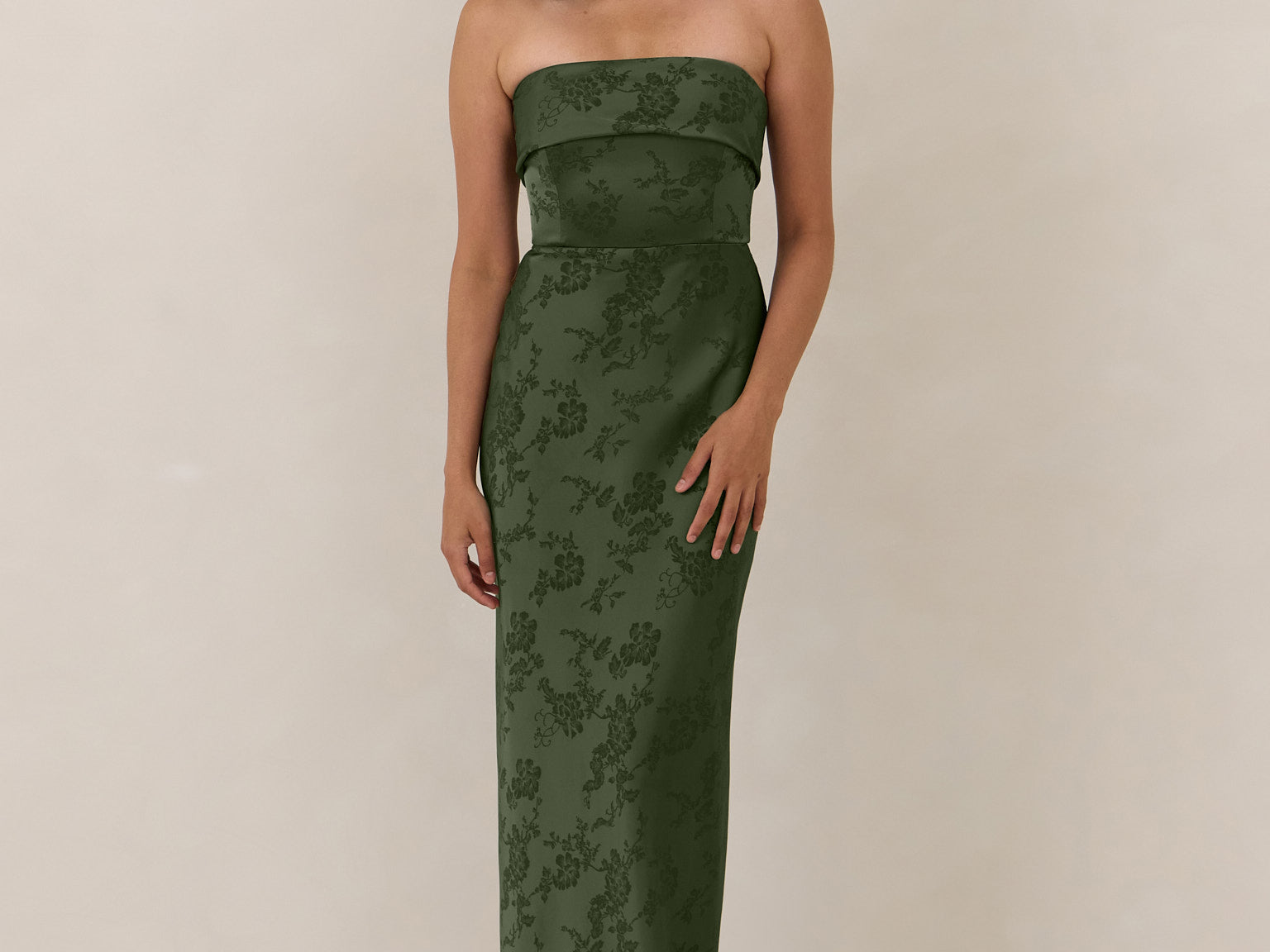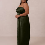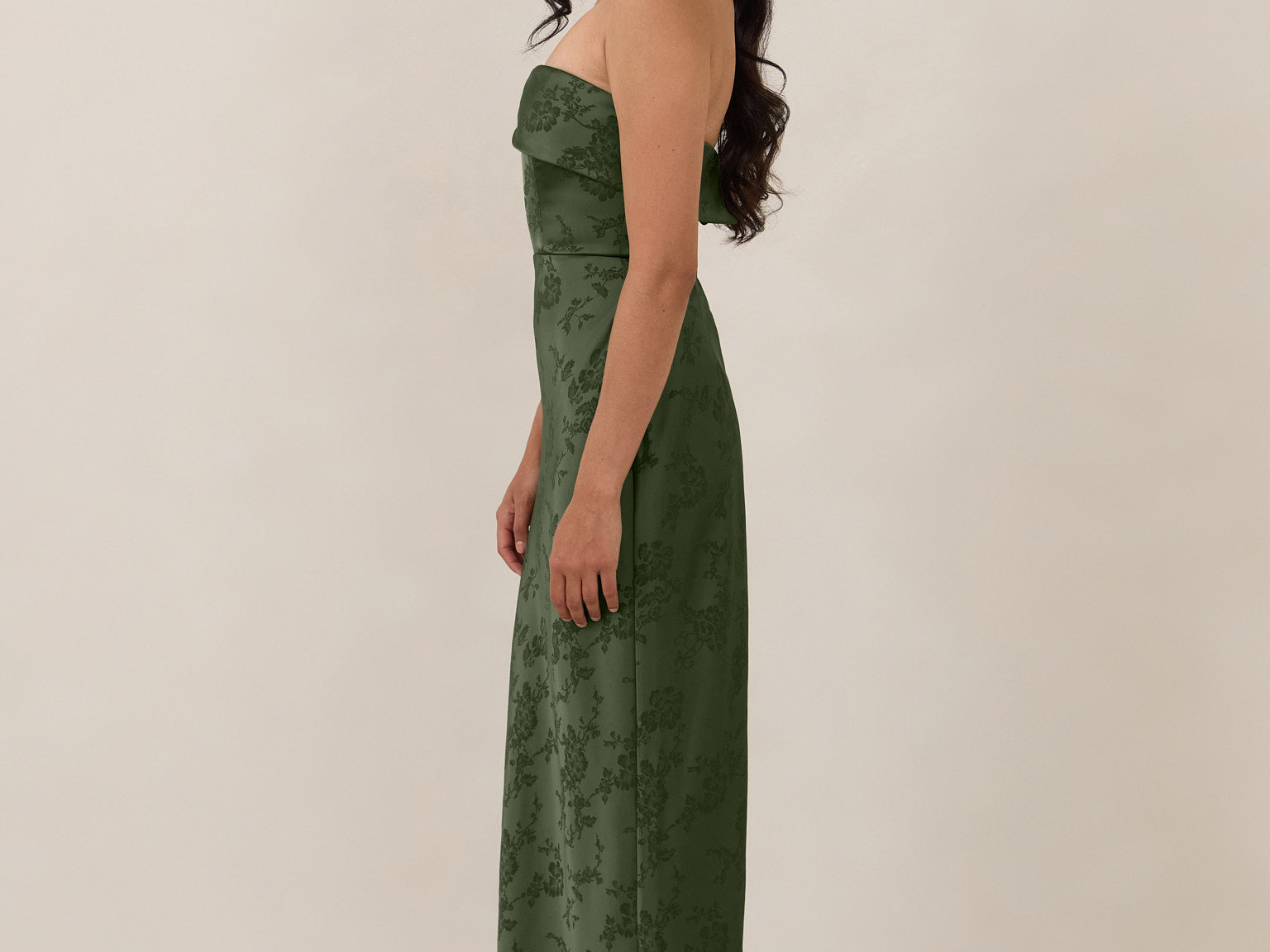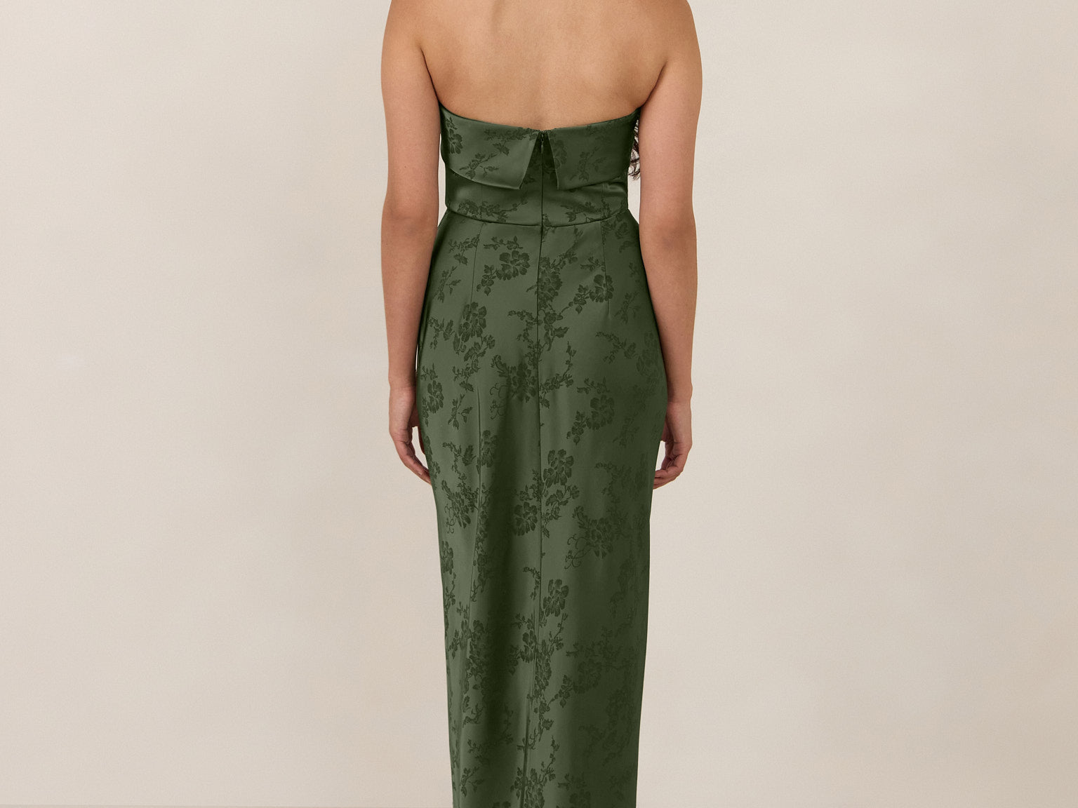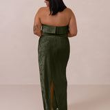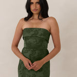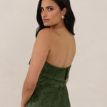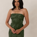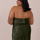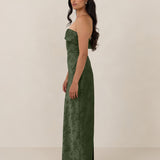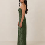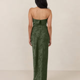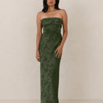 A timeless piece designed to captivate. Designed from luxe jacquard fabric with a subtle sheen and intricate texture, this dress exudes understated glamour. The structured, folded strapless neckline adds a modern sculptural element, gracefully framing the shoulders.
