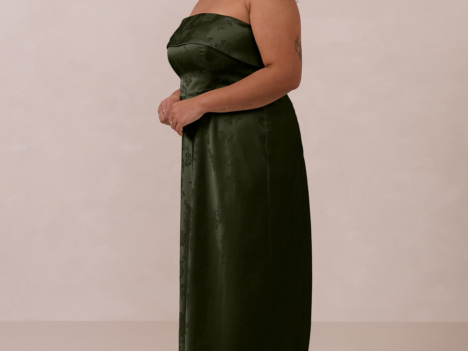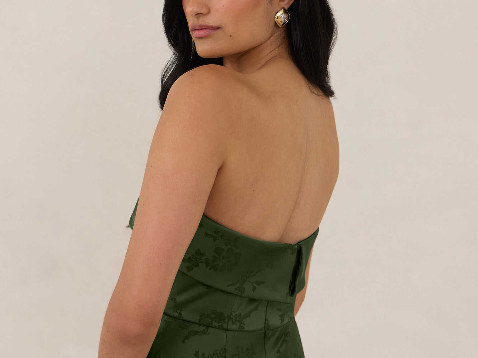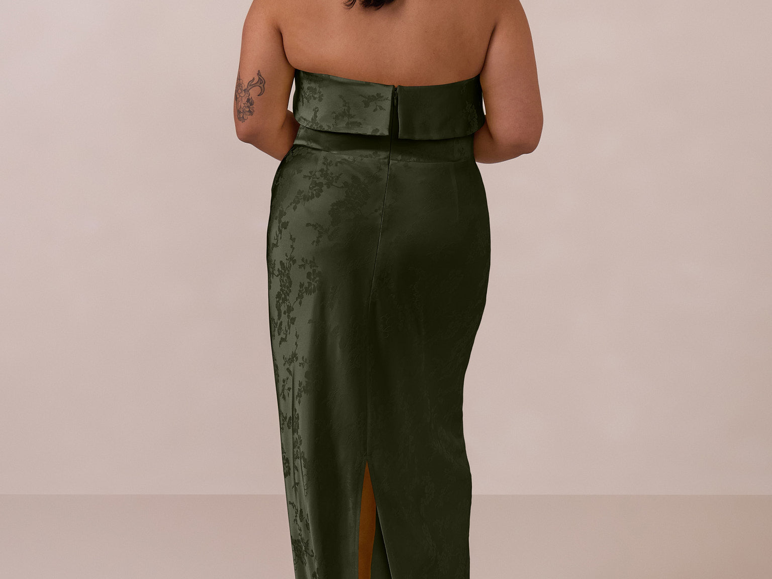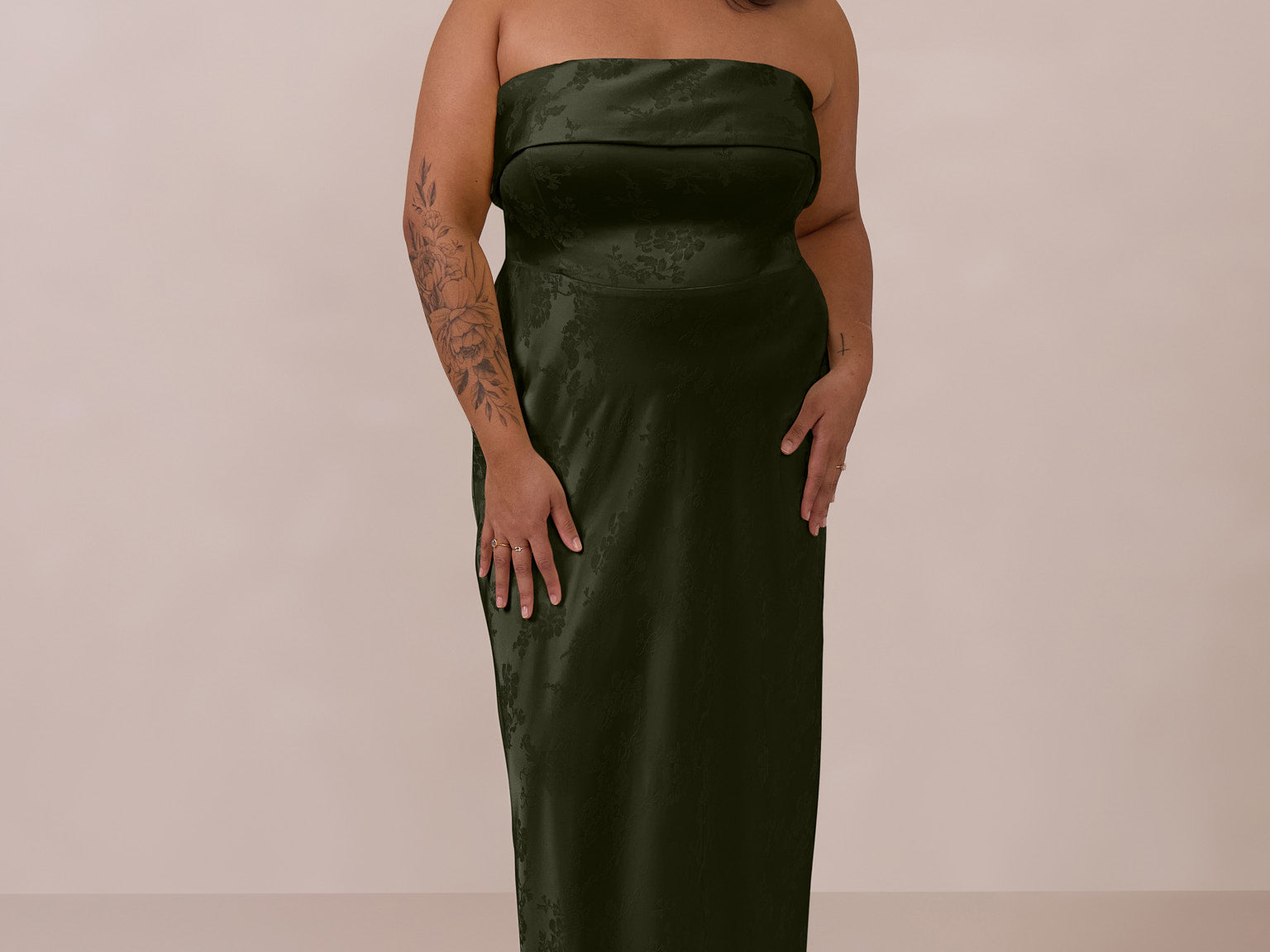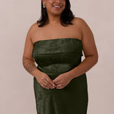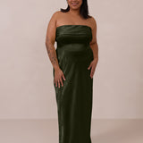 A timeless piece designed to captivate. Designed from luxe jacquard fabric with a subtle sheen and intricate texture, this dress exudes understated glamour. The structured, folded strapless neckline adds a modern sculptural element, gracefully framing the shoulders.