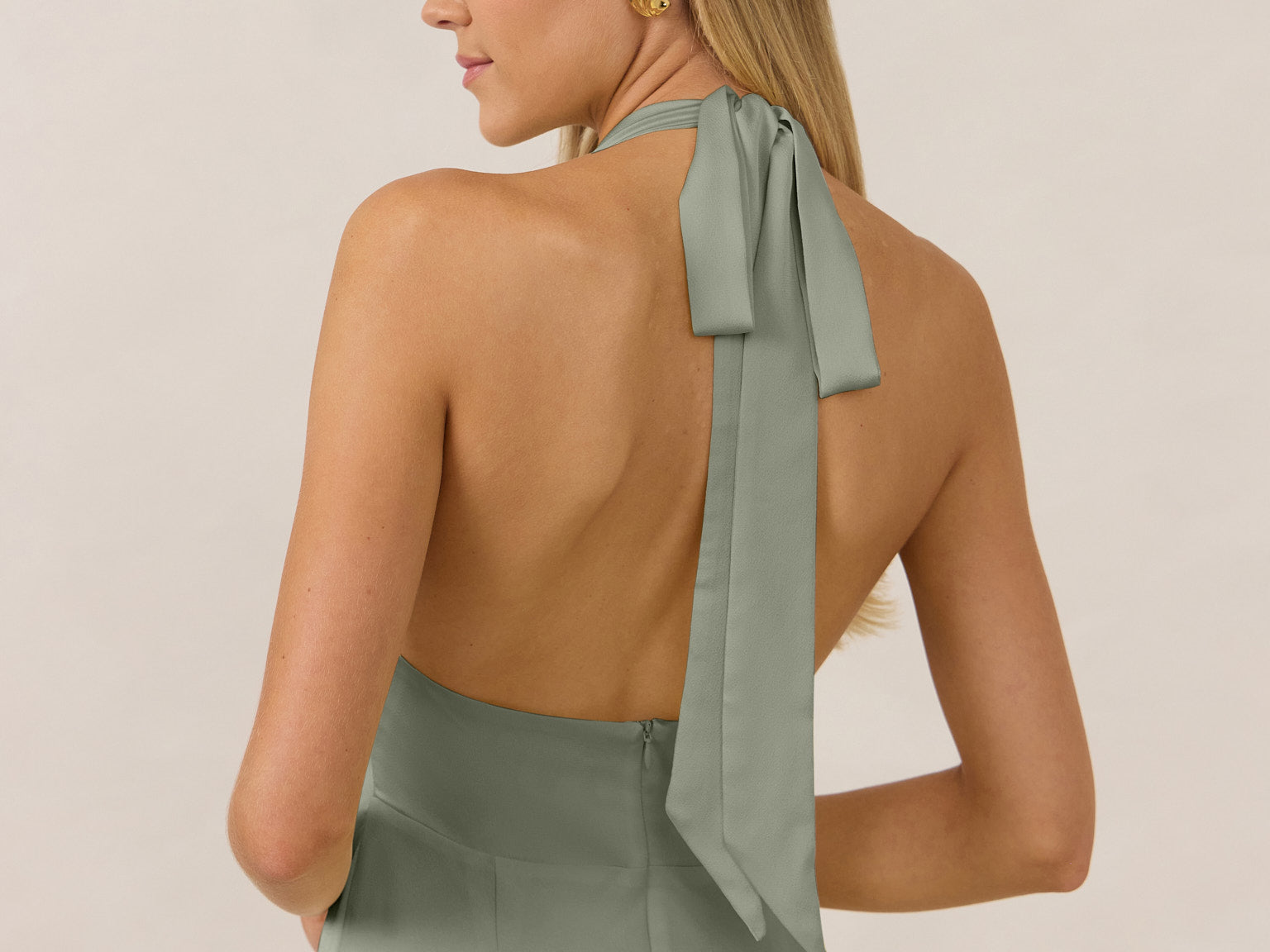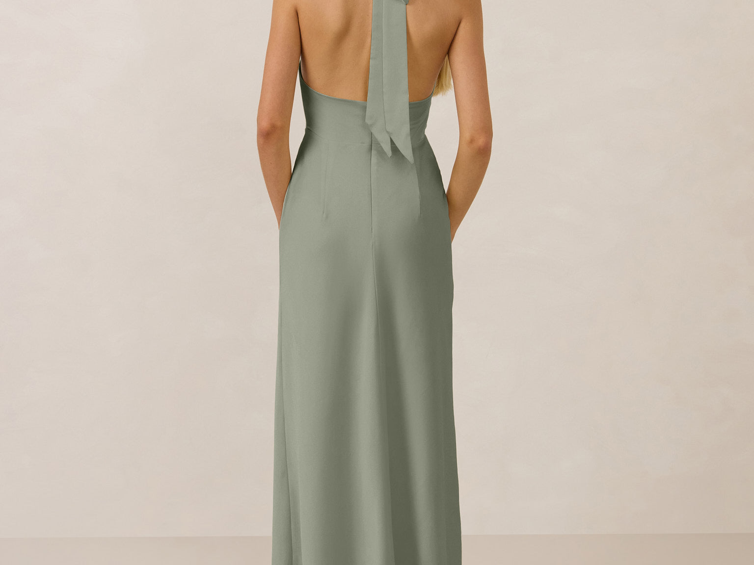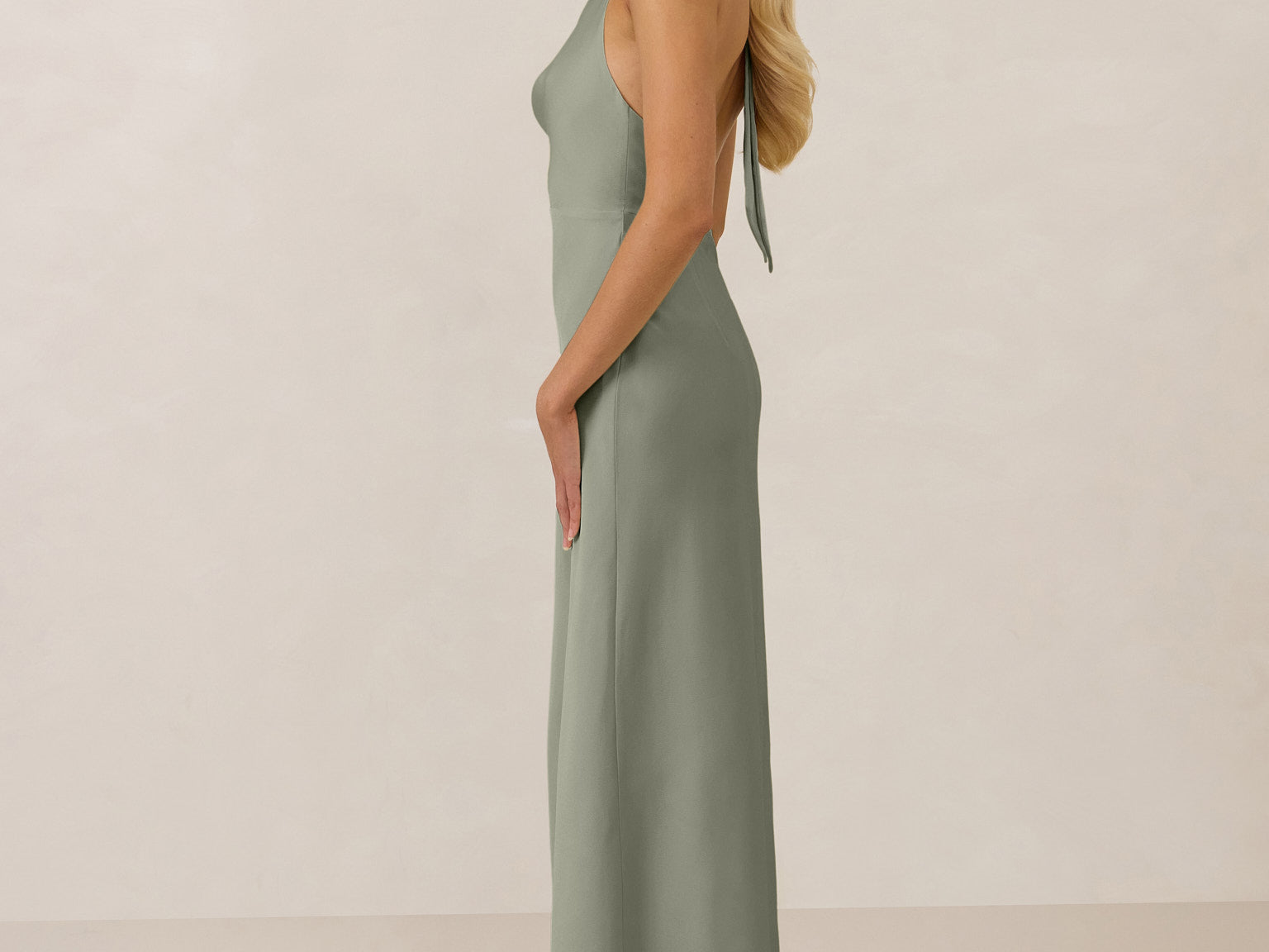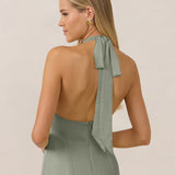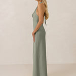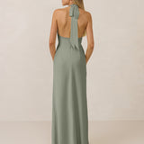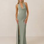 Effortlessly elegant, this bias-cut satin maxi dress features a fluid skirt with a curved thigh-high slit and a draped cowl neckline. A delicate halter back completes the look. Perfect for any occasion, it's glossy and flattering.