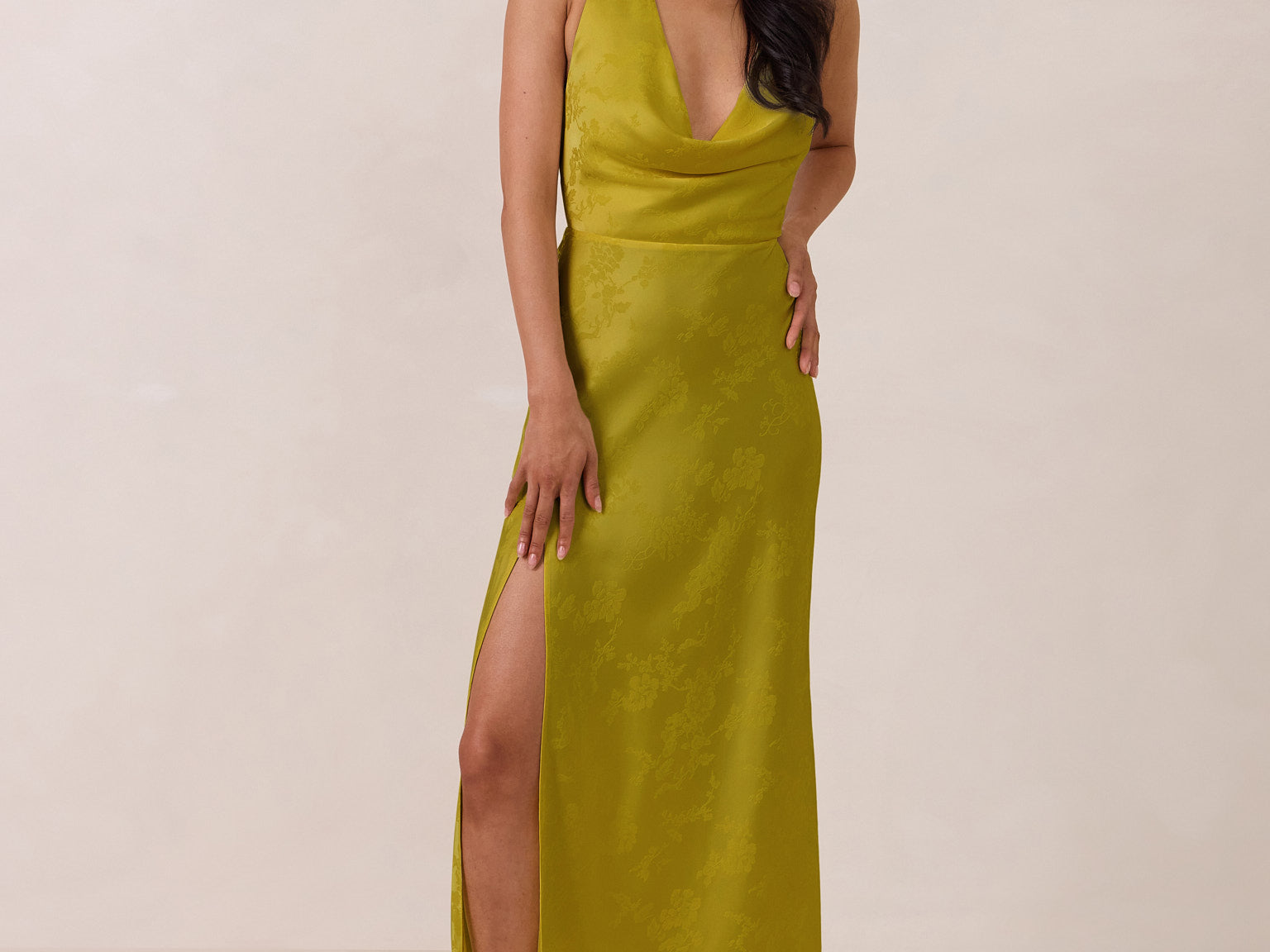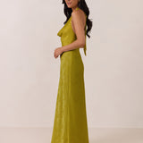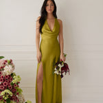 Effortlessly elegant, this bias-cut satin maxi dress features a fluid skirt with a curved thigh-high slit and a draped cowl neckline. A delicate halter back completes the look. Perfect for any occasion, it's glossy and flattering.