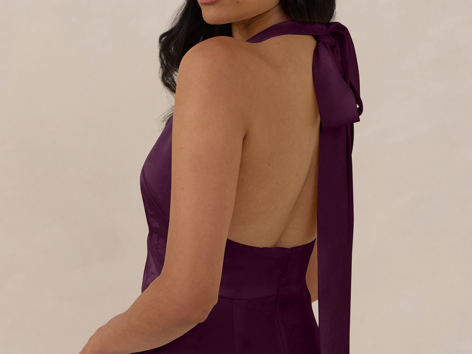 A sleek and versatile silhouette crafted in luxurious Jacquard for a touch of texture and sophistication. Designed for effortless elegance, it features a halter neckline with a dramatic open back and long ties that can be styled as a scarf or knotted for a custom halter look. The bias-cut skirt flows beautifully into a flattering maxi length, creating graceful movement with every step.