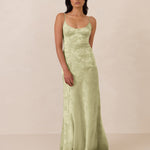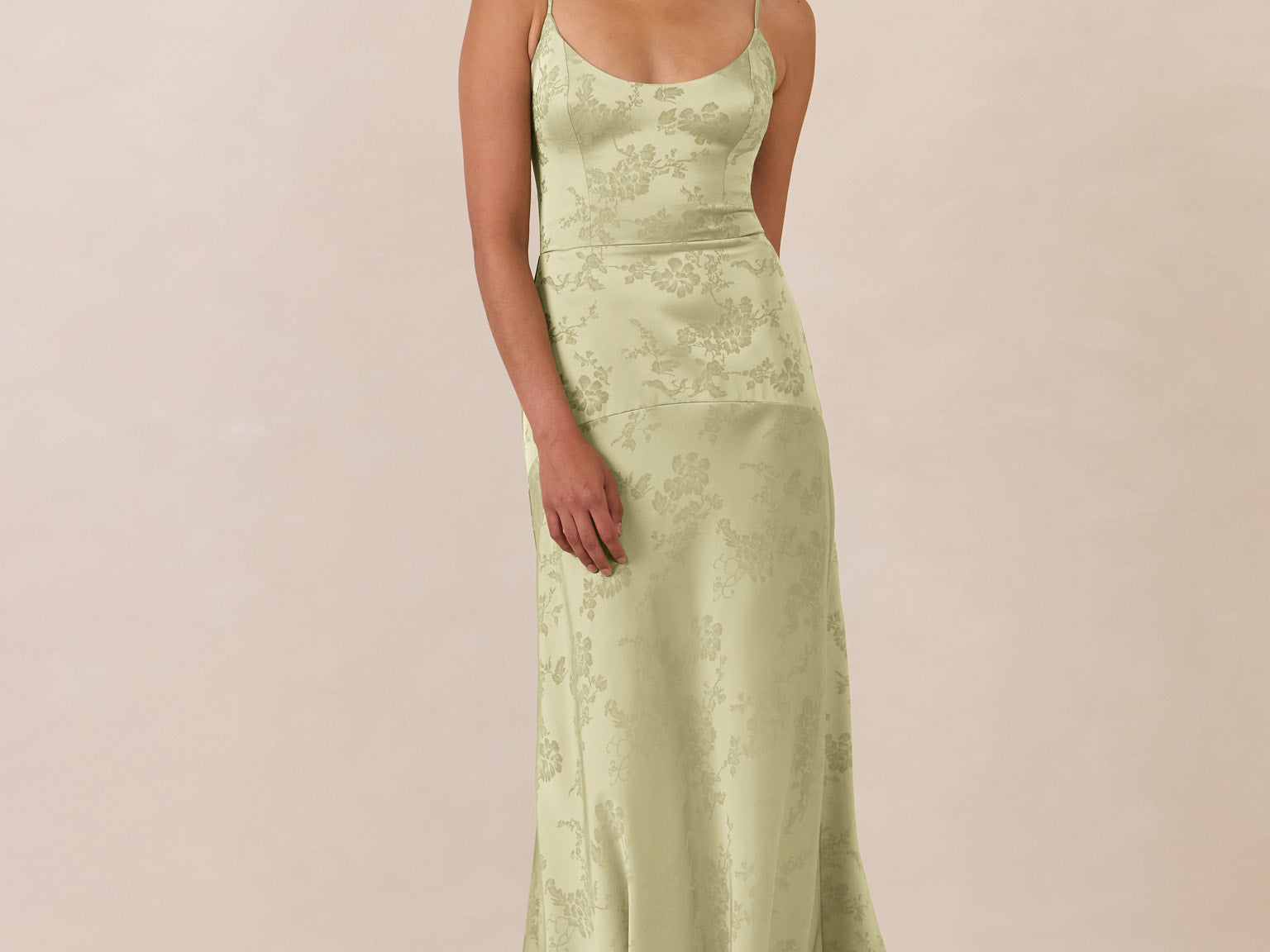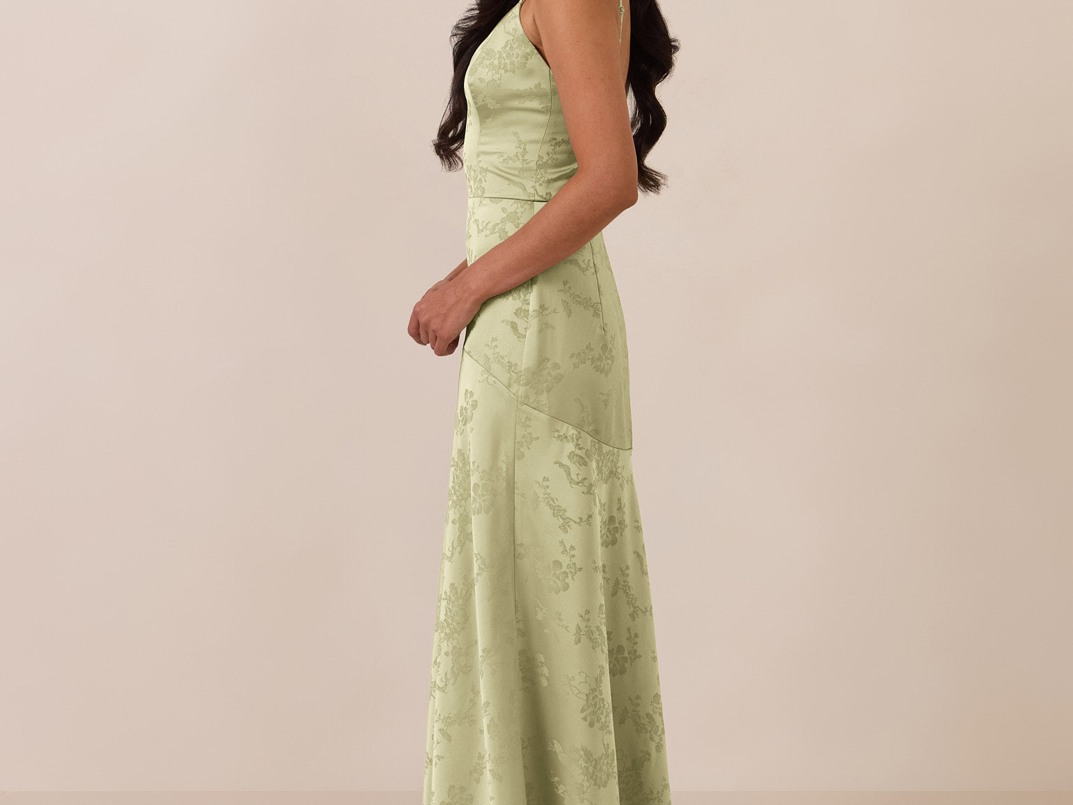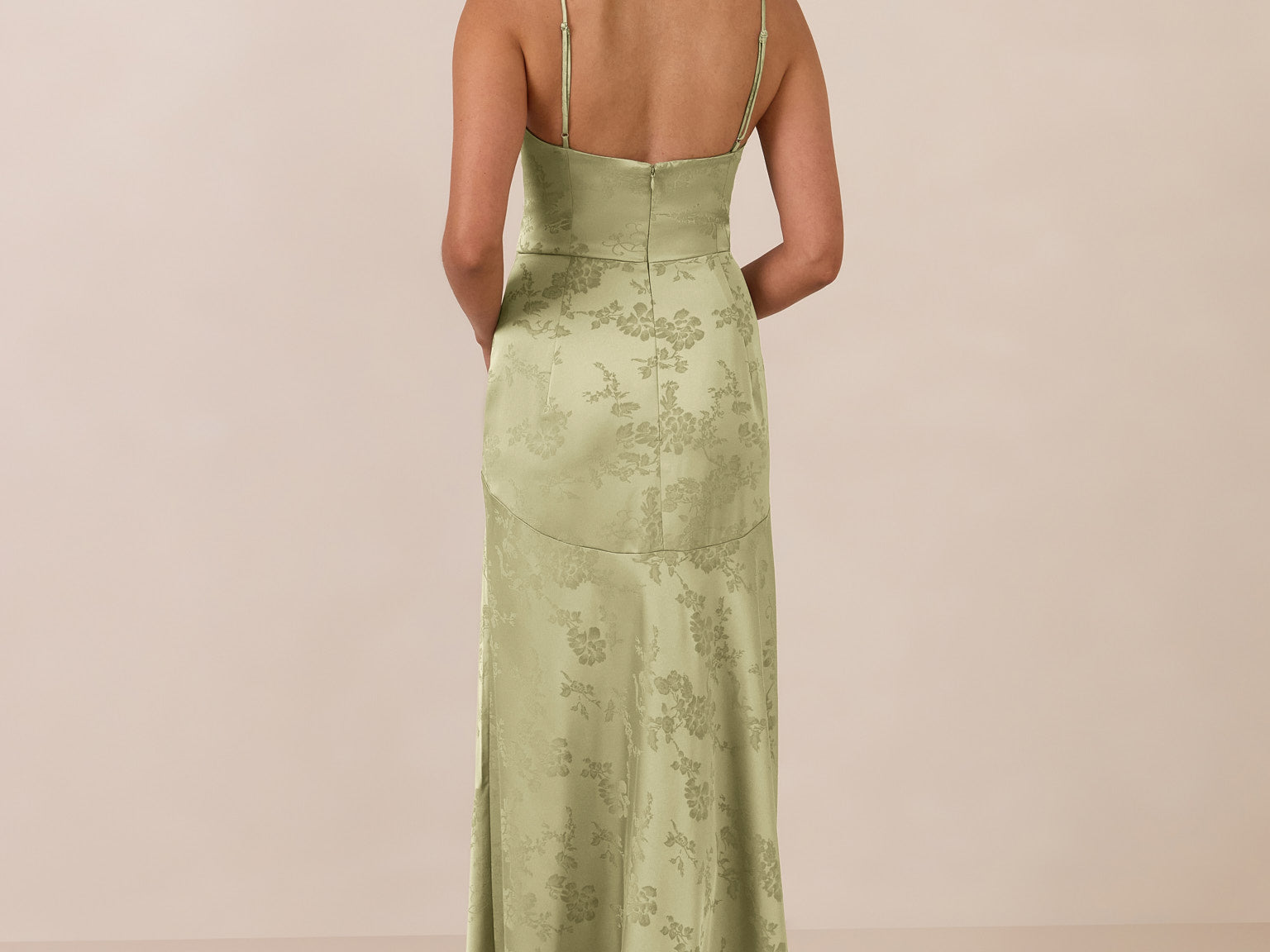 Crafted from luxurious Jacquard satin, this full-length dress features adjustable straps and a flattering drop waist, creating an elegant silhouette with timeless appeal. The scoop neckline and back add a delicate, feminine touch, while the bias-cut skirt flows gracefully to the floor, combining sophistication and comfort for a truly captivating look.