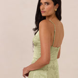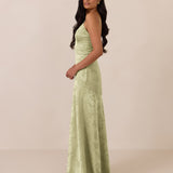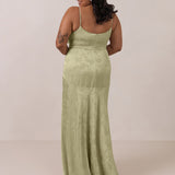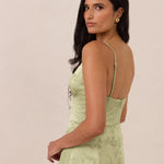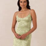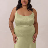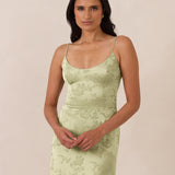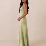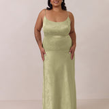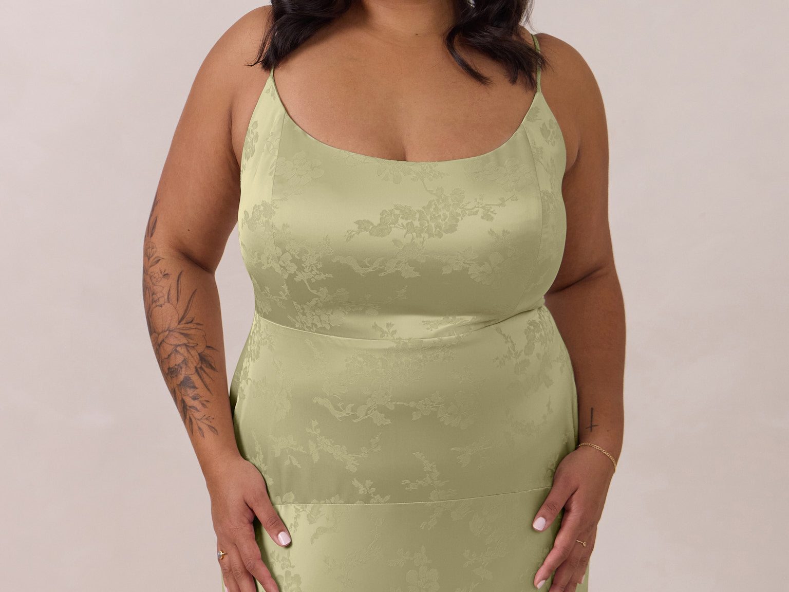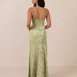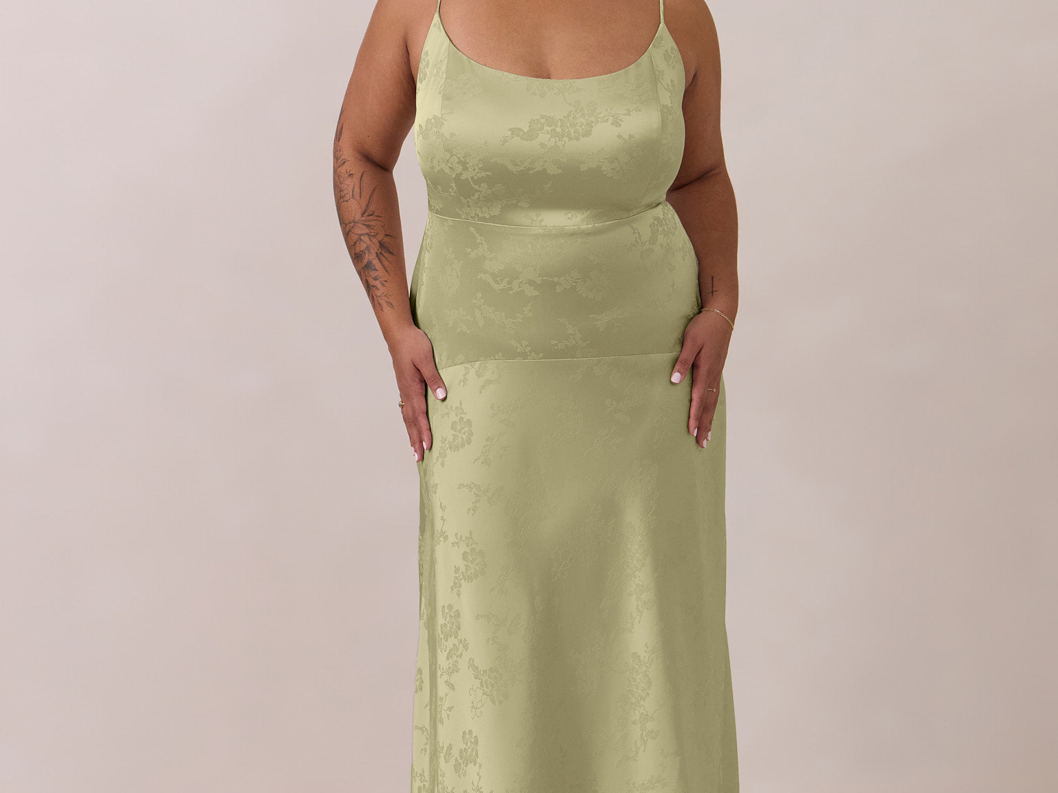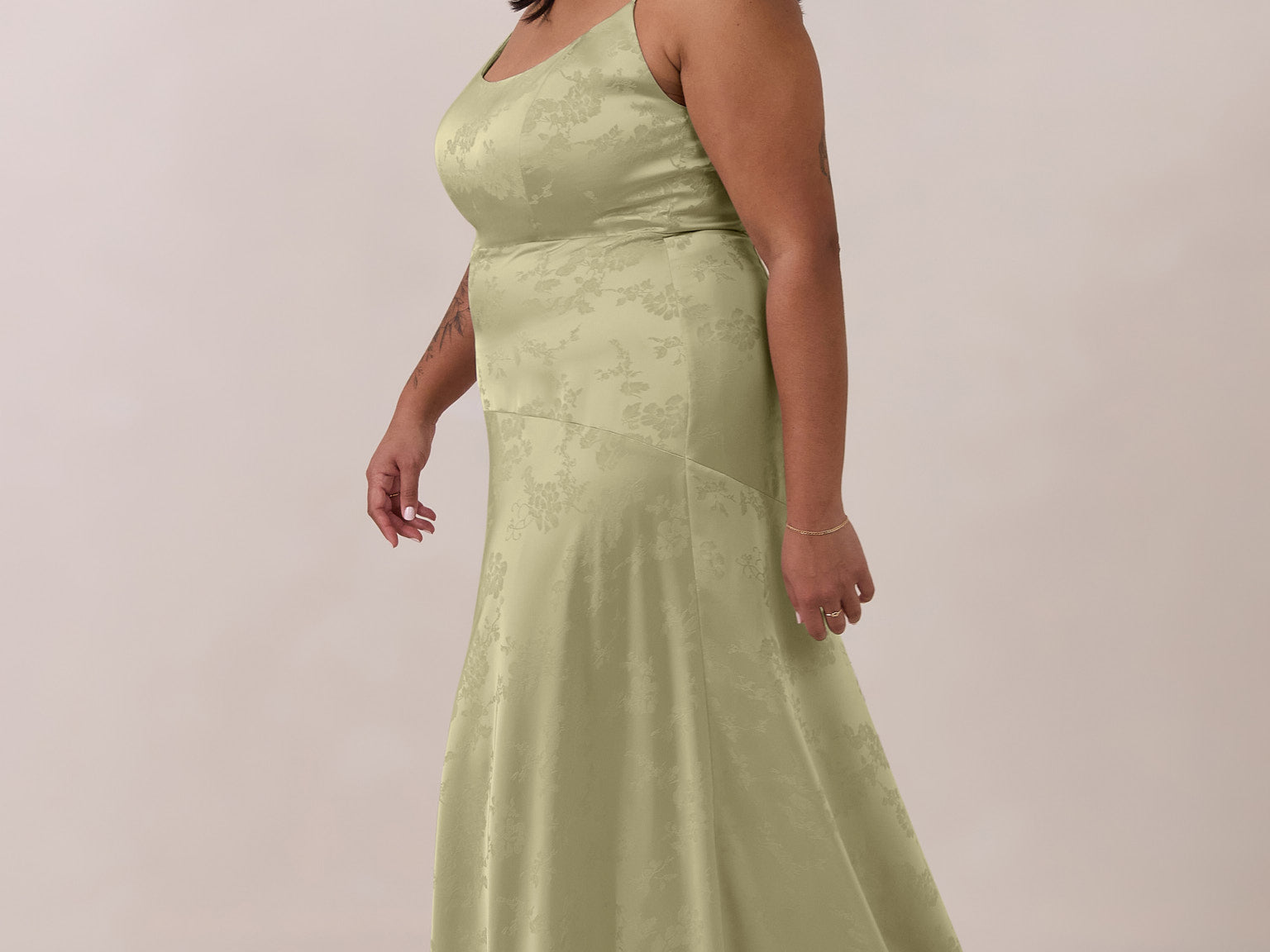 Crafted from luxurious Jacquard satin, this full-length dress features adjustable straps and a flattering drop waist, creating an elegant silhouette with timeless appeal. The scoop neckline and back add a delicate, feminine touch, while the bias-cut skirt flows gracefully to the floor, combining sophistication and comfort for a truly captivating look.