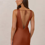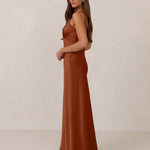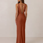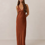 Featuring a flattering V-neckline, gathering at the bust, and an open back, this bias-cut dress offers a sleek, elongating silhouette. The clean lines and minimalist design make it the perfect choice for any special occasion.