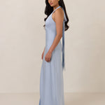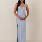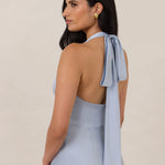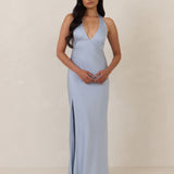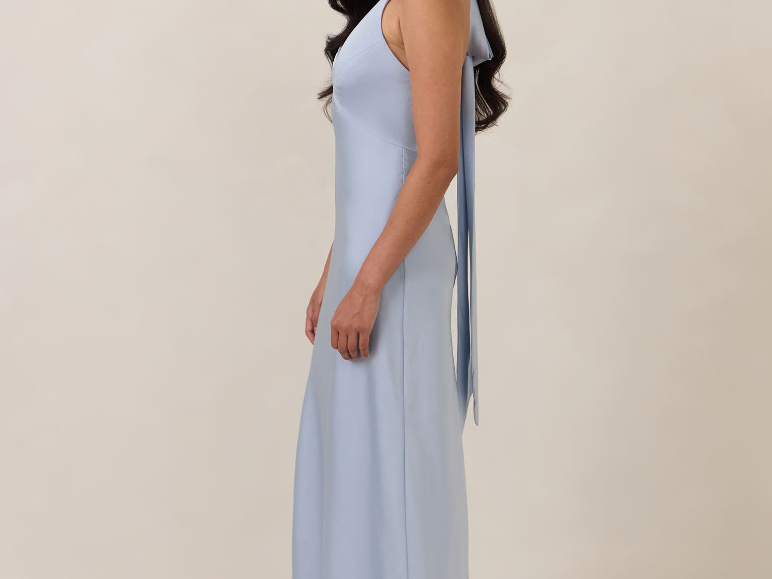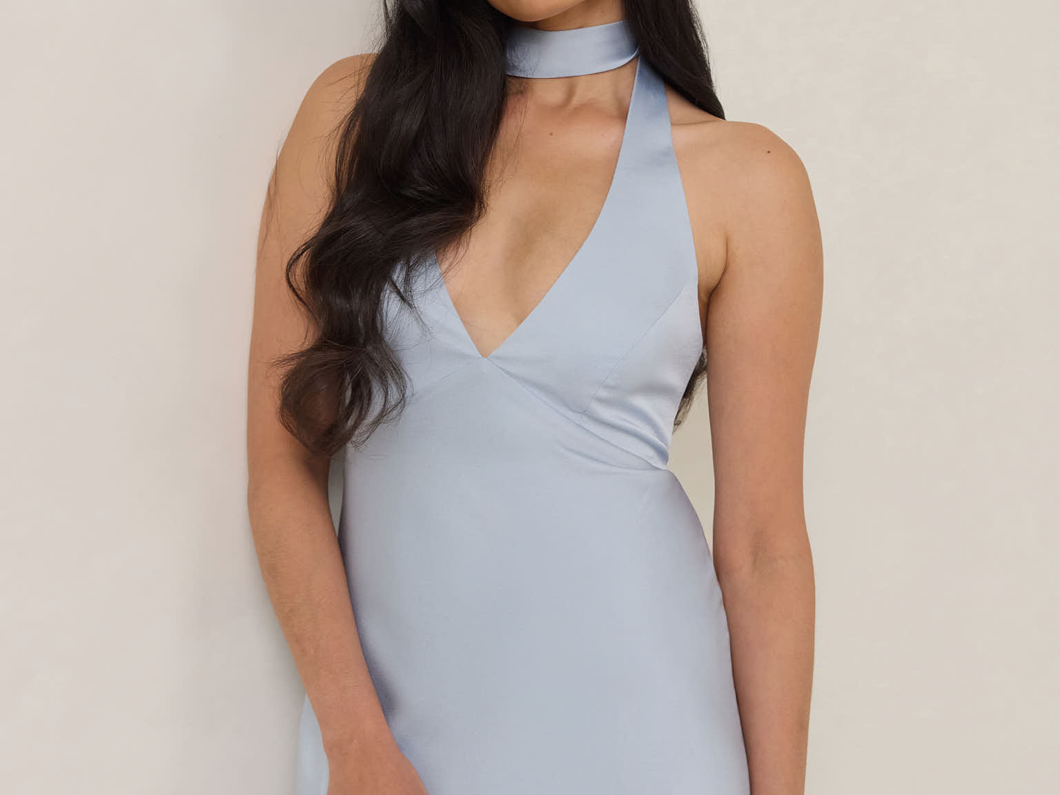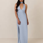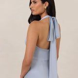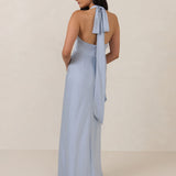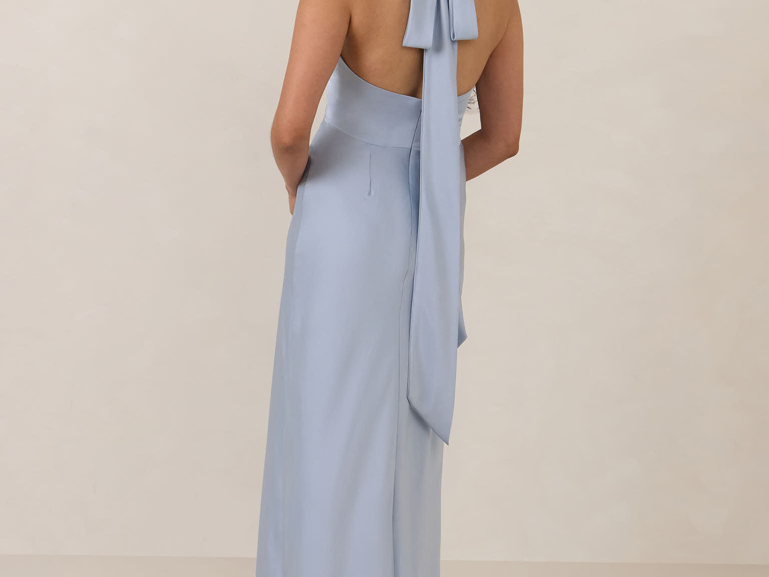 Designed to turn heads. Crafted from our smooth satin, this bust-friendly halter style features long, versatile ties that can be styled in a bow or worn as a neck scarf for a modern touch. Finished with a bias-cut skirt and a subtle slit, this dress effortlessly balances elegance with a bold edge.