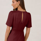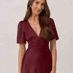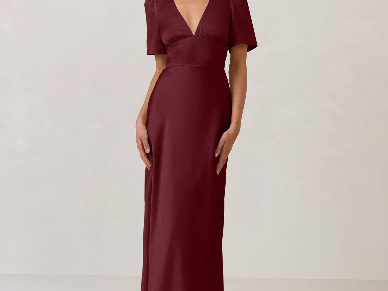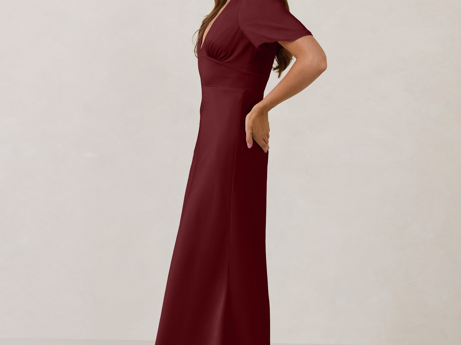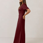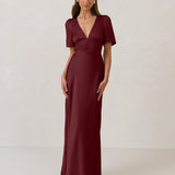 This full-length satin dress features a romantic V neckline, short sleeves, and a bias-cut skirt for an effortlessly feminine silhouette. A subtle keyhole back and delicate button closure add unexpected detail. Finished in silky satin with a soft, light-catching sheen.