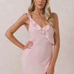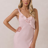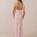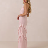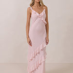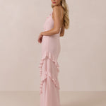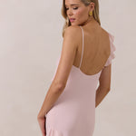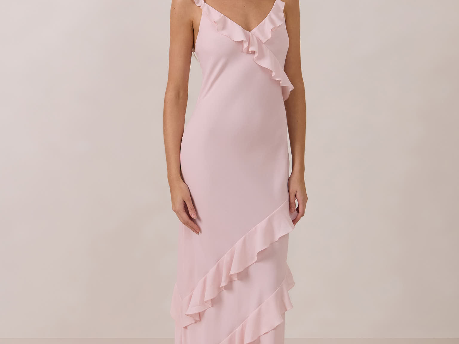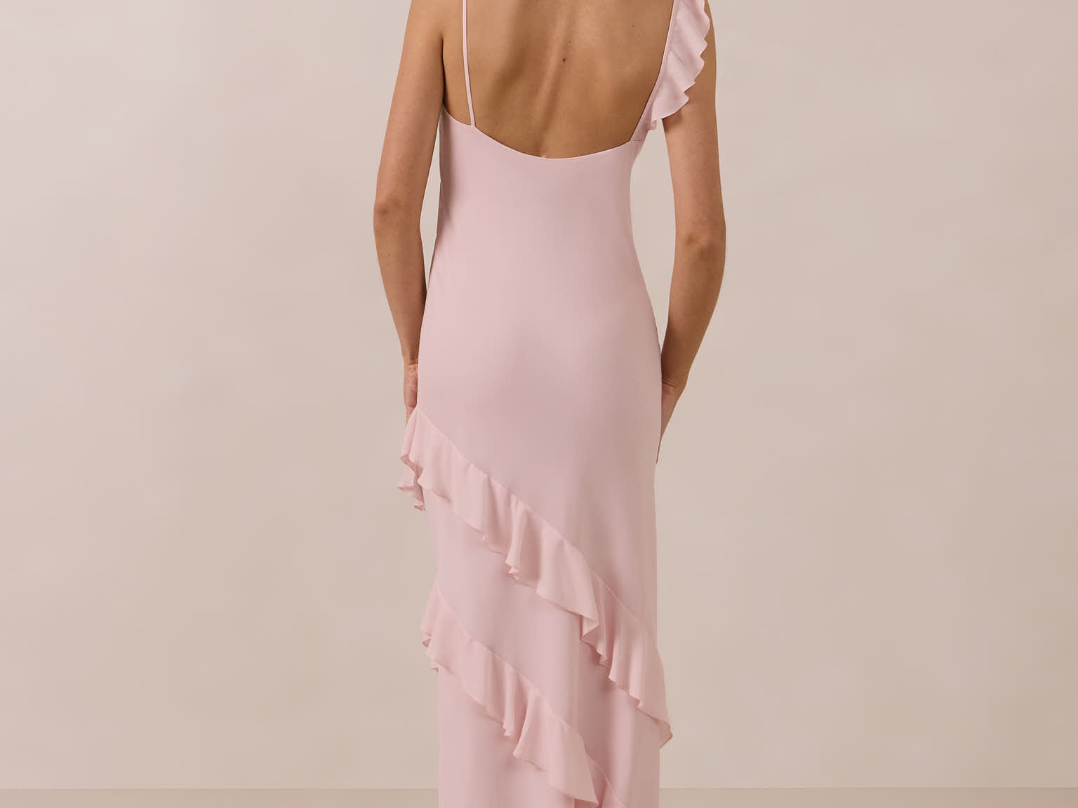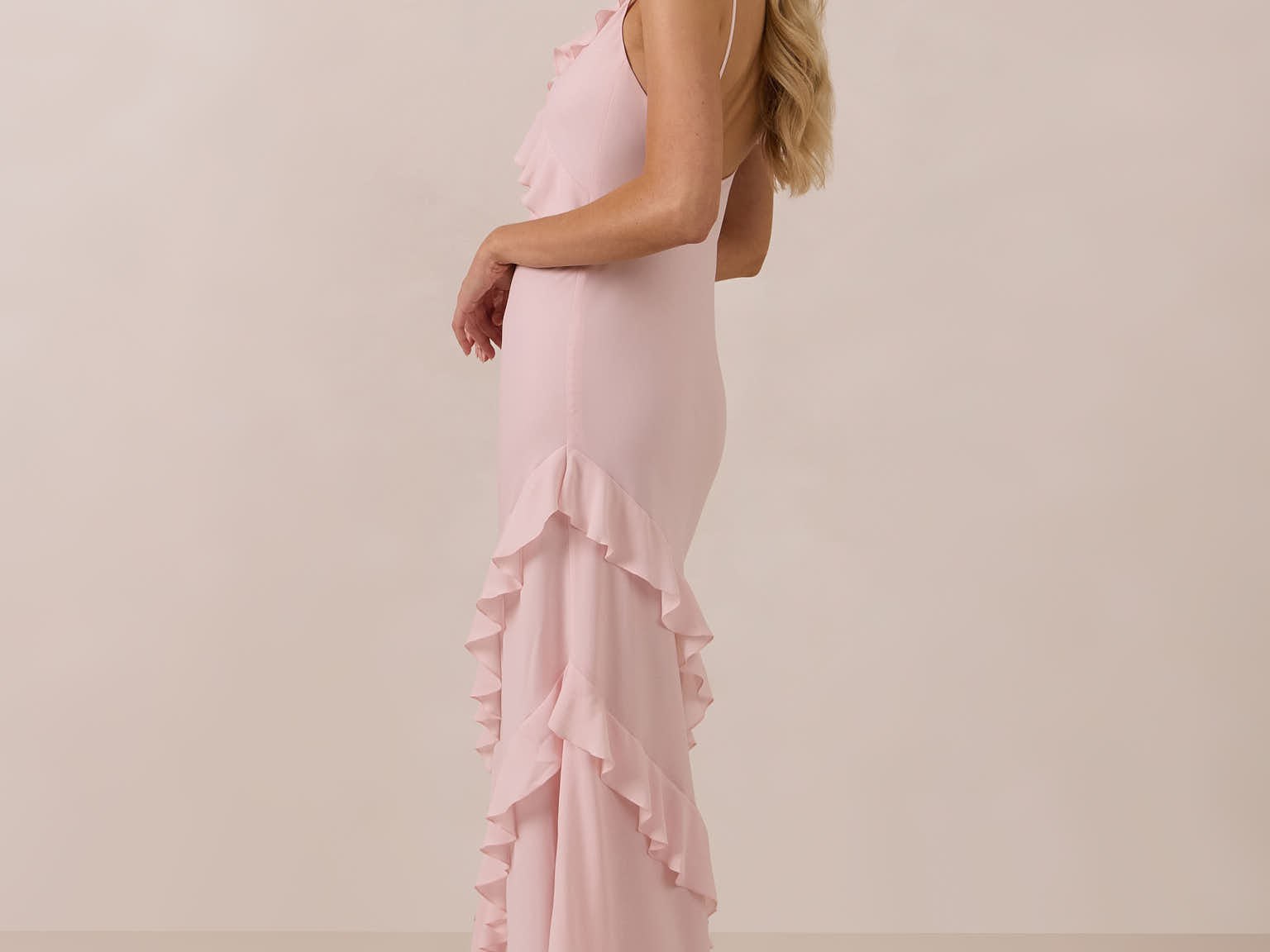A standout silhouette with romantic edge. Designed with a plunging V-neckline and open scoop back, this full-length dress features delicate spaghetti straps accented with soft ruffle details.