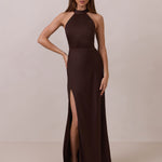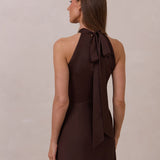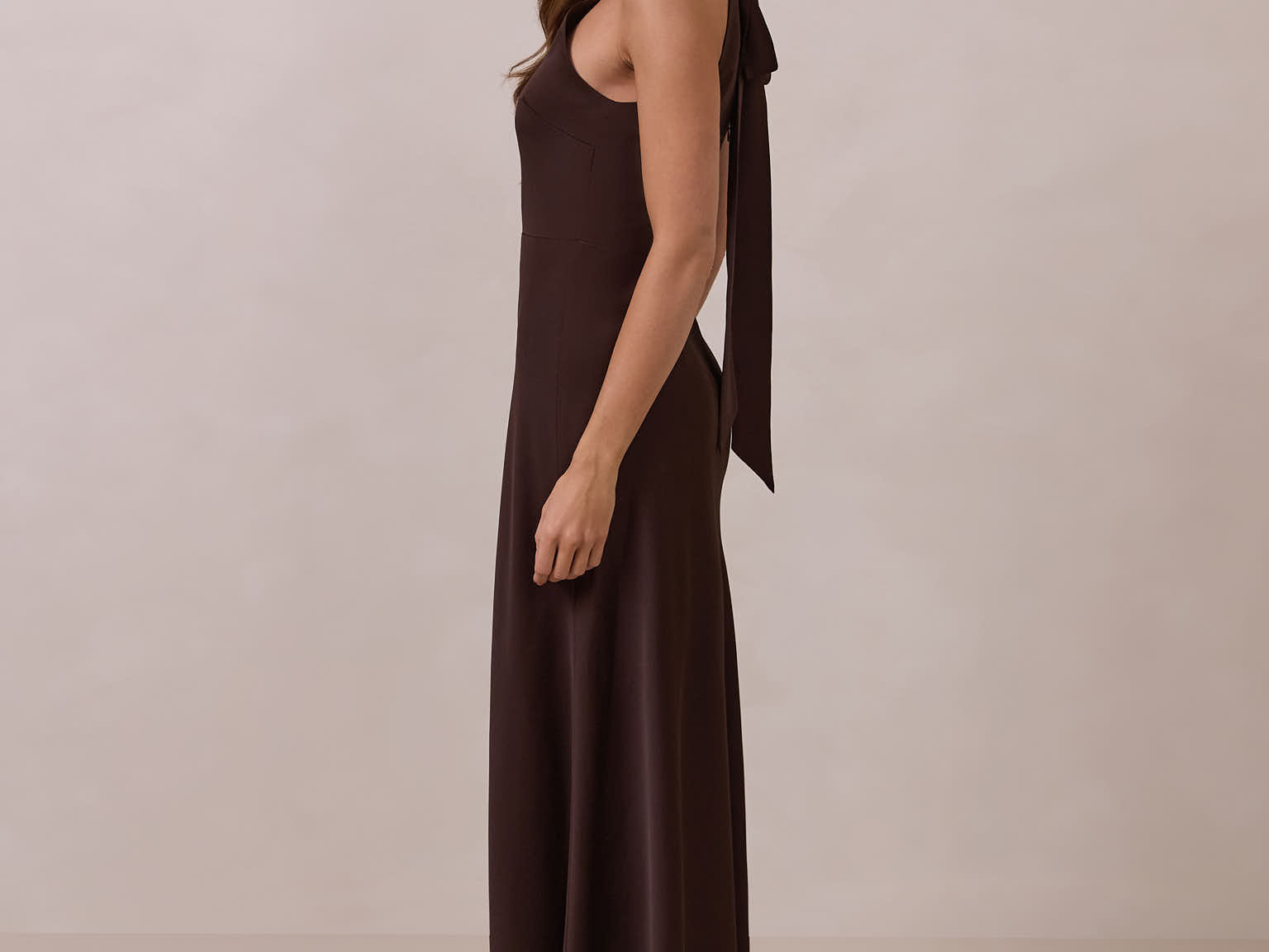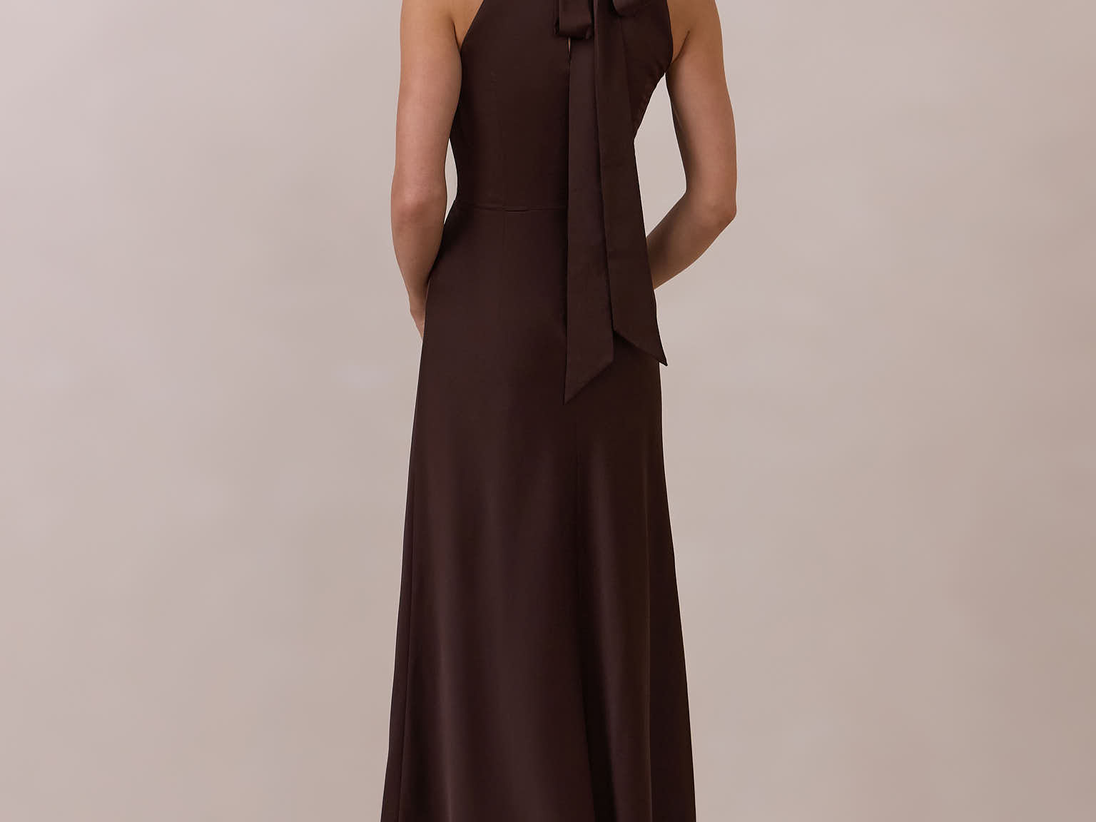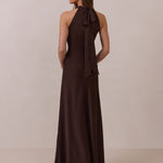 Meet the Porter Dress—a full-length satin gown designed with effortless elegance in mind. The sleek high neckline features an elongated self-tie that can be styled in a knot or left to drape for a refined, minimal look. Cut in fluid satin that skims the body, the gown falls into a straight silhouette finished with a front slit for easy movement. Timeless, polished, and made for any moment that calls for something elevated.