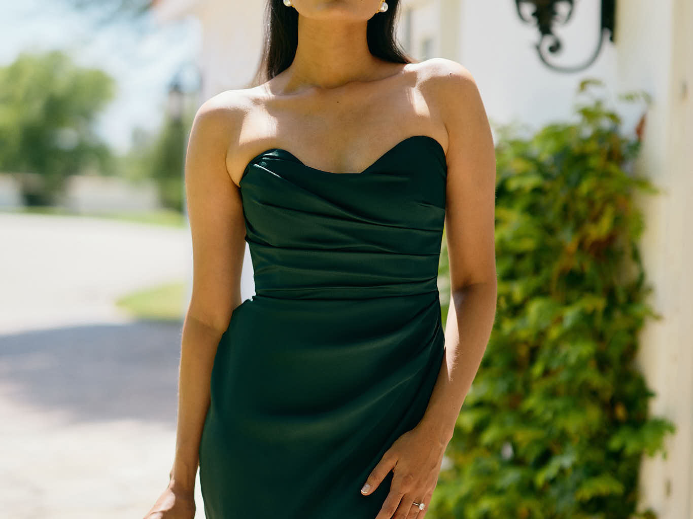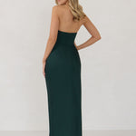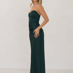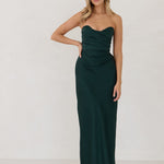 Designed with a scoop sweetheart neckline and soft pleating through the boned bodice and skirt, this dress creates a sleek, feminine silhouette. Elegant and timeless, it’s an ideal choice for weddings, receptions, or any formal occasion.