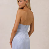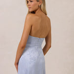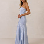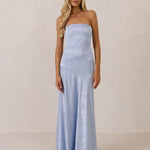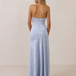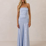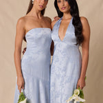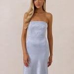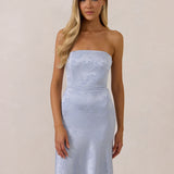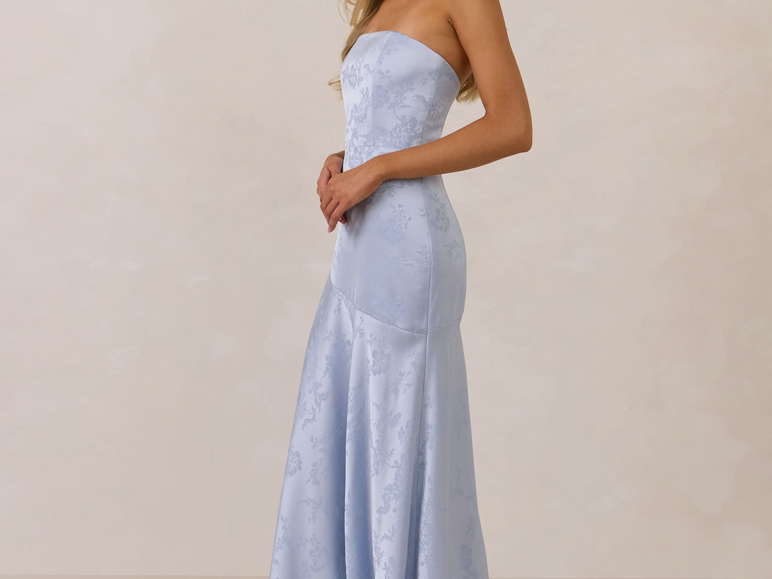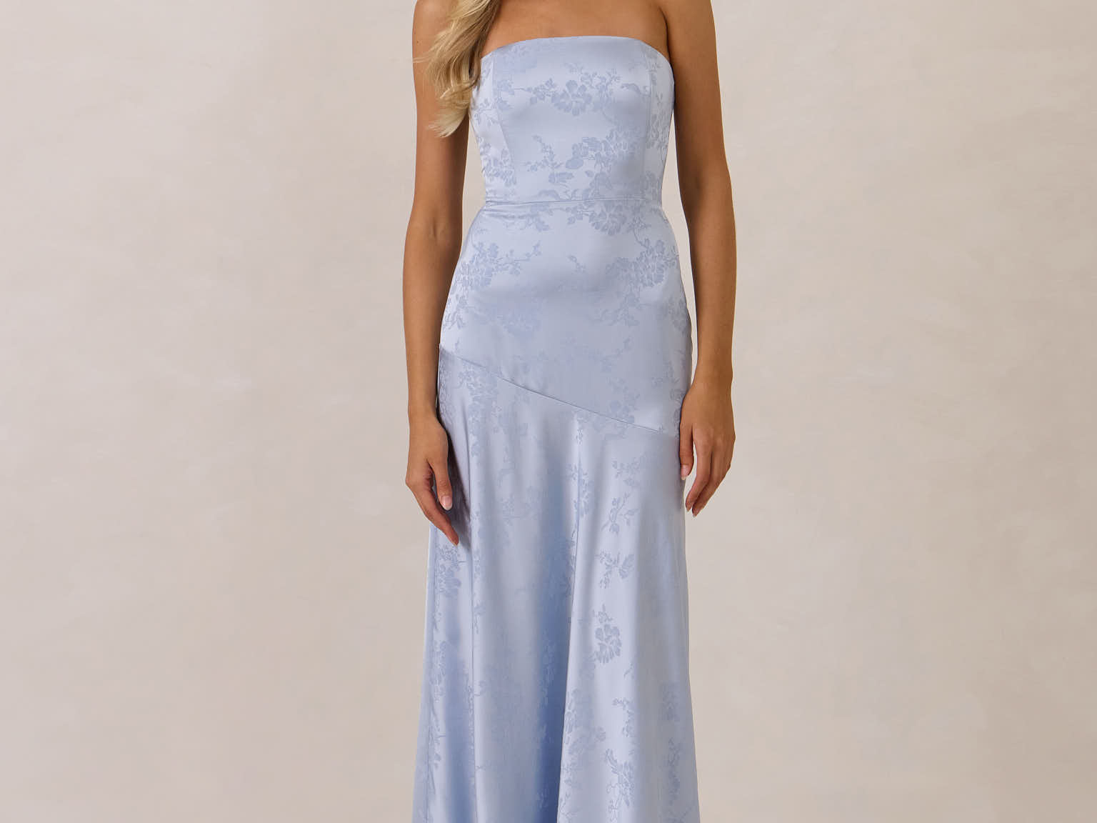 The Delaney is a full-length, strapless silhouette crafted from luxurious Jacquard satin. Clean lines and a smooth, sculpted bodice create a timeless look, while the sleek finish makes it an elevated choice for any bridal party.