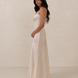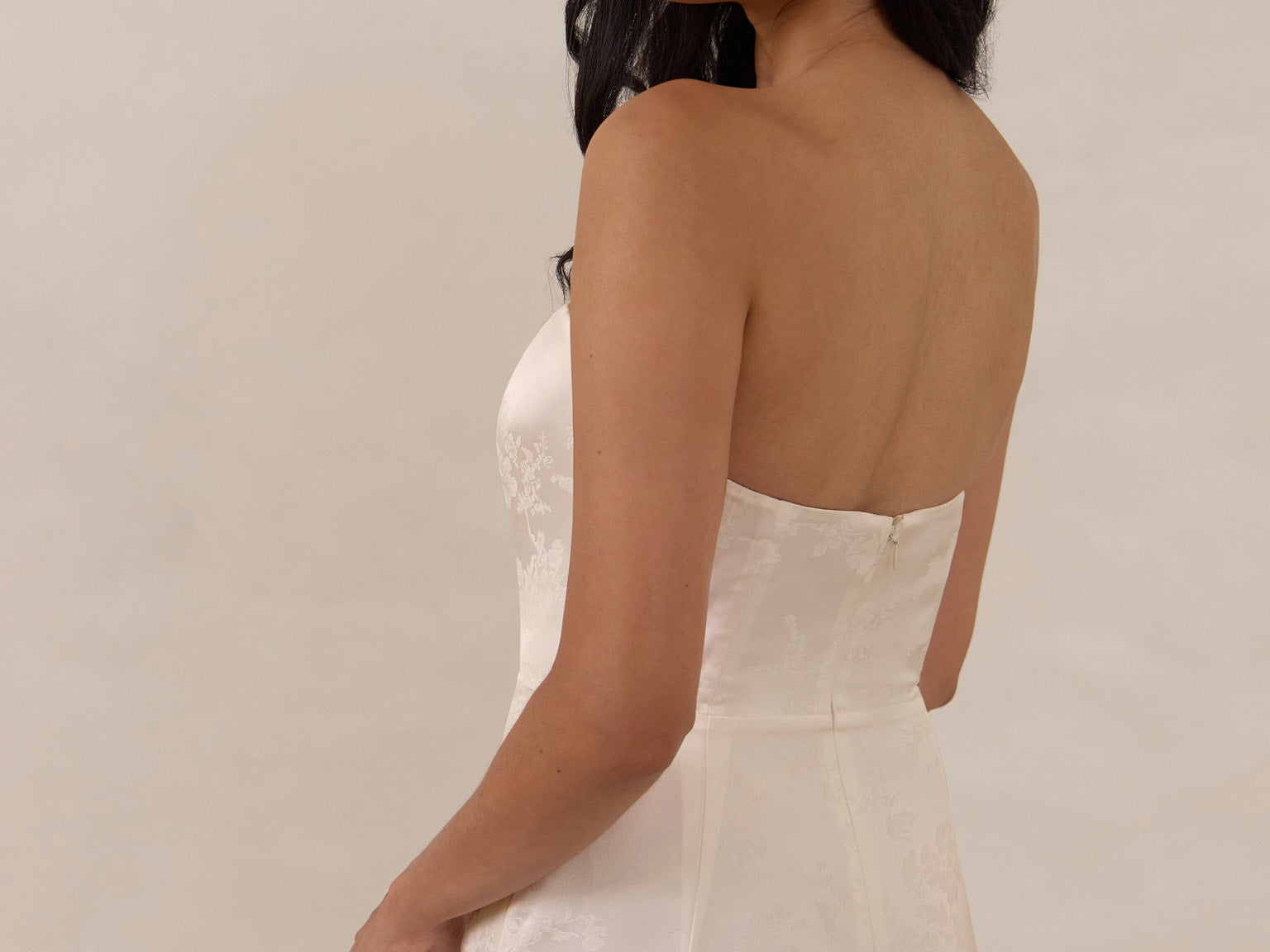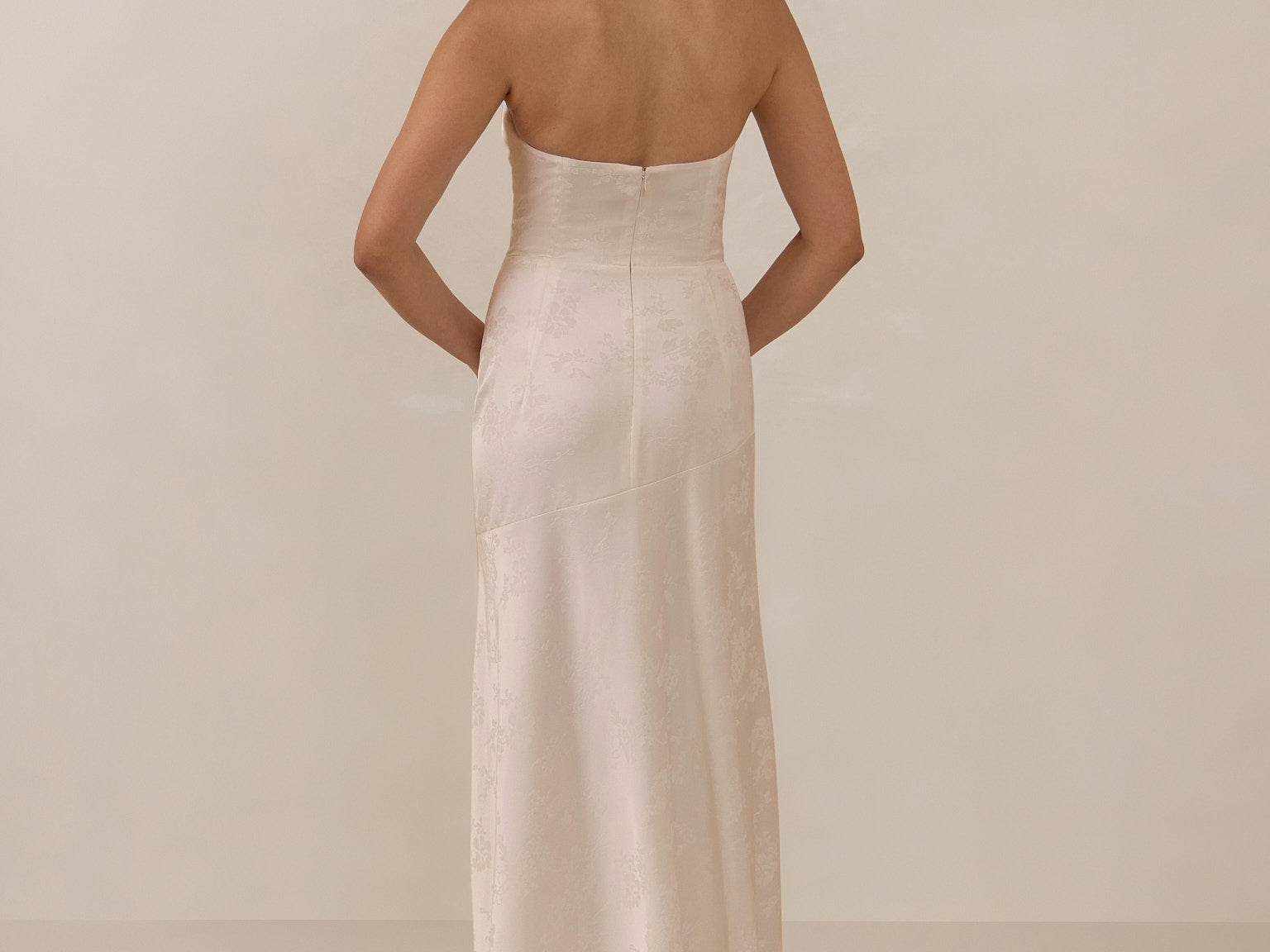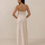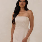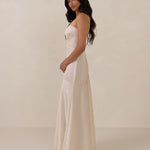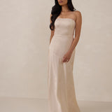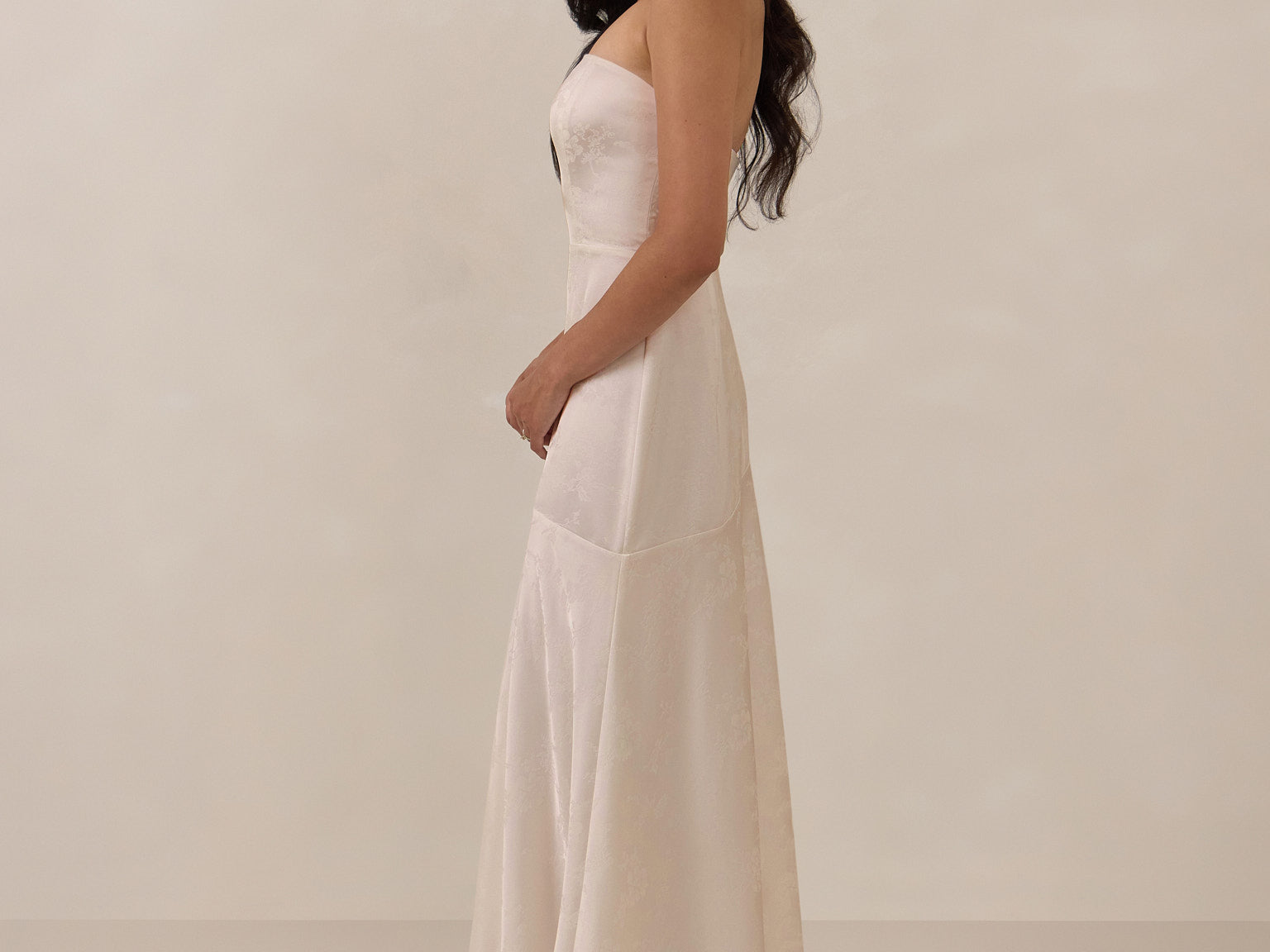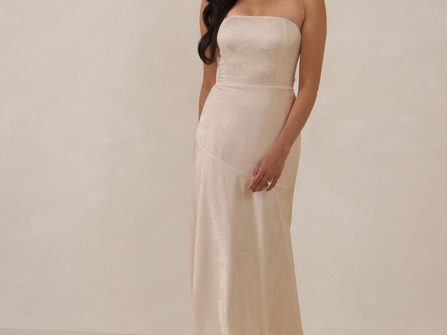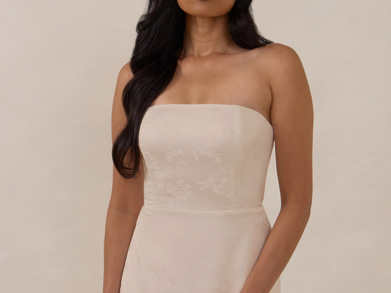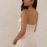 The Delaney is a full-length, strapless silhouette crafted from luxurious Jacquard satin. Clean lines and a smooth, sculpted bodice create a timeless look, while the sleek finish makes it an elevated choice for any bridal party.