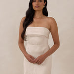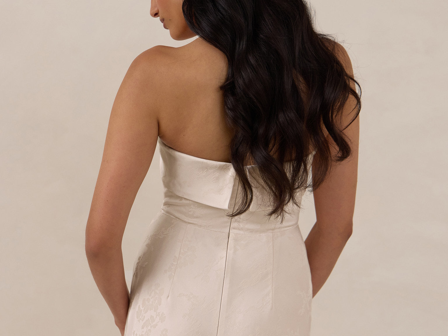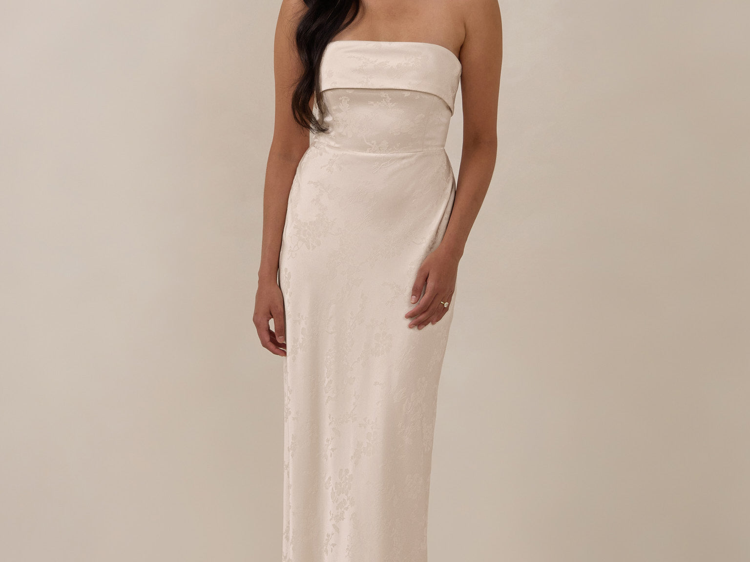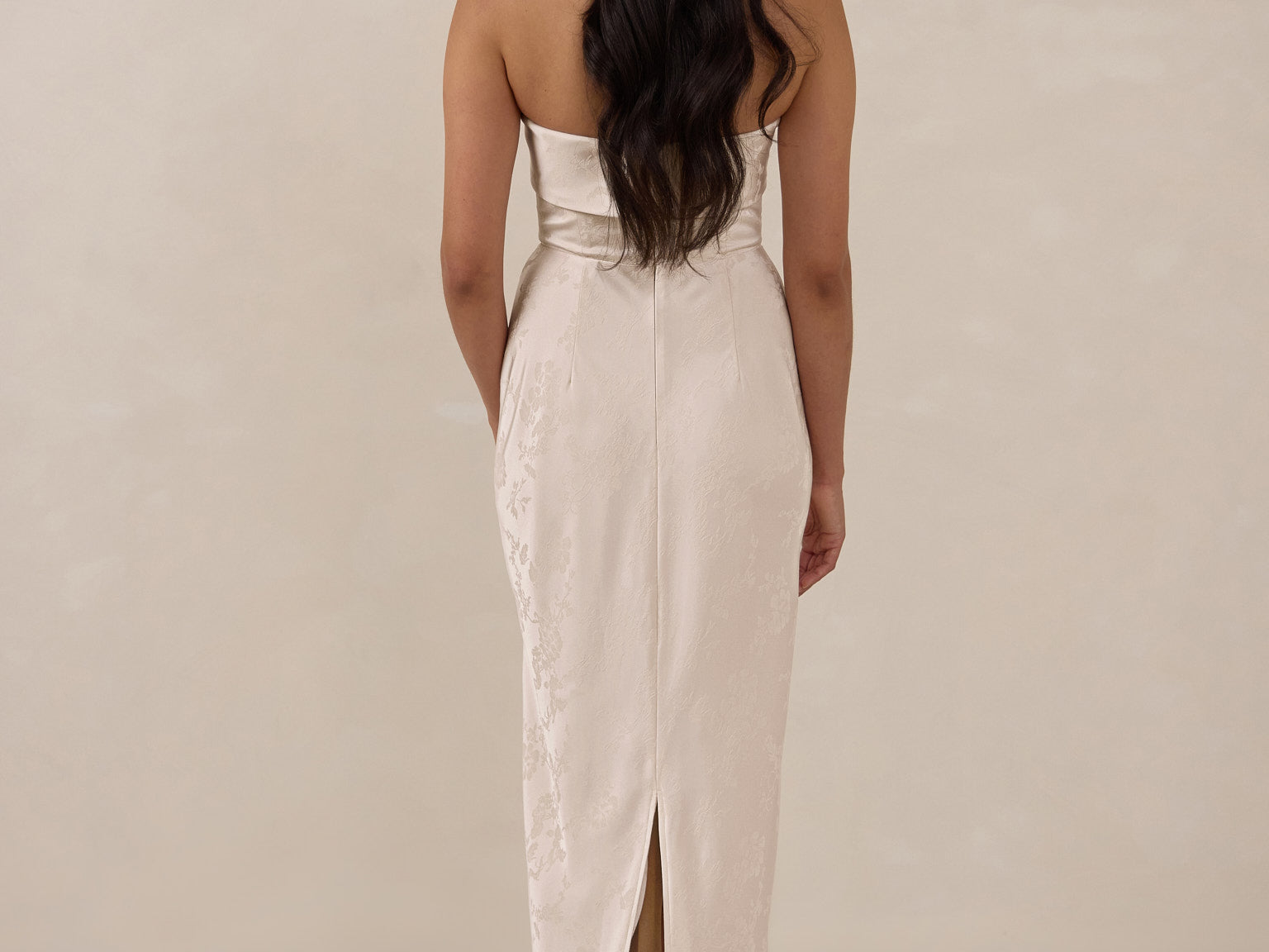 A timeless piece designed to captivate. Designed from luxe jacquard fabric with a subtle sheen and intricate texture, this dress exudes understated glamour. The structured, folded strapless neckline adds a modern sculptural element, gracefully framing the shoulders.