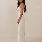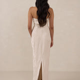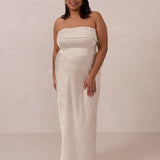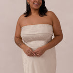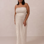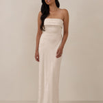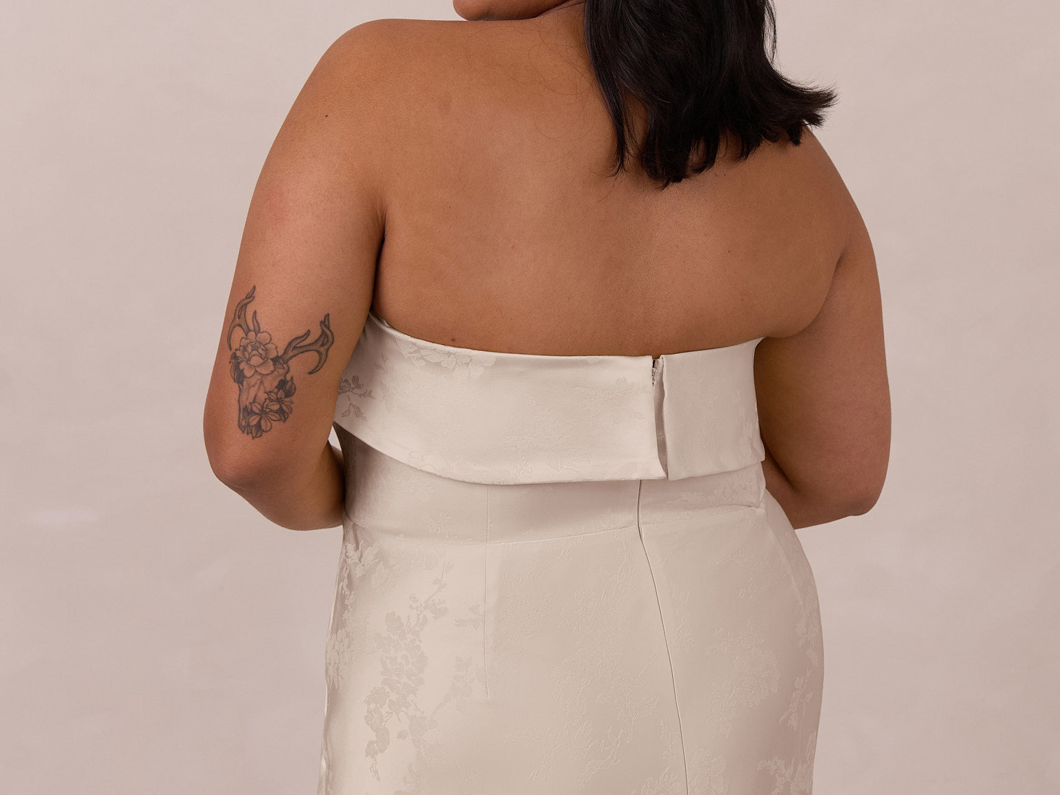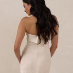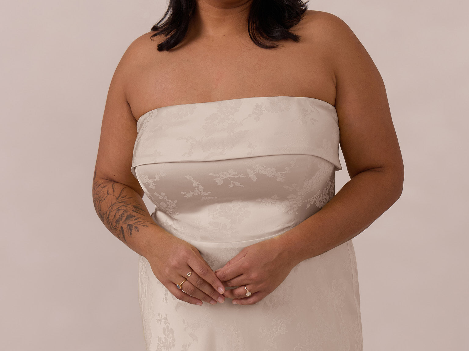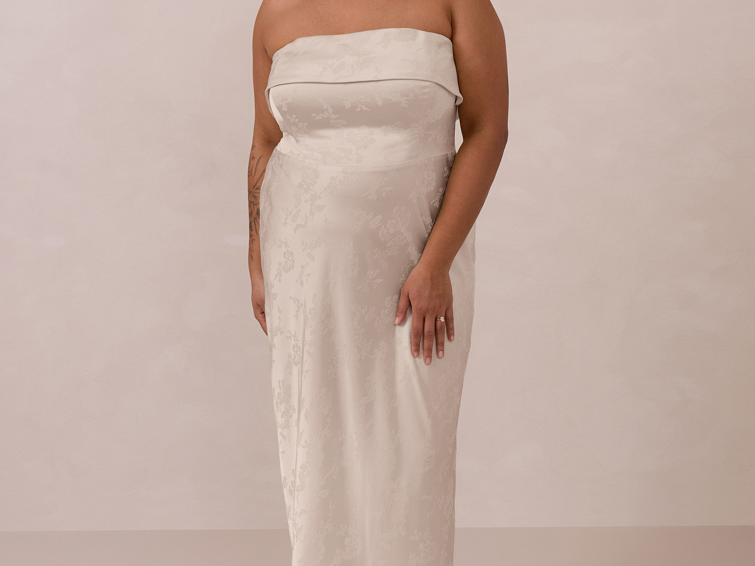 A timeless piece designed to captivate. Designed from luxe jacquard fabric with a subtle sheen and intricate texture, this dress exudes understated glamour. The structured, folded strapless neckline adds a modern sculptural element, gracefully framing the shoulders.