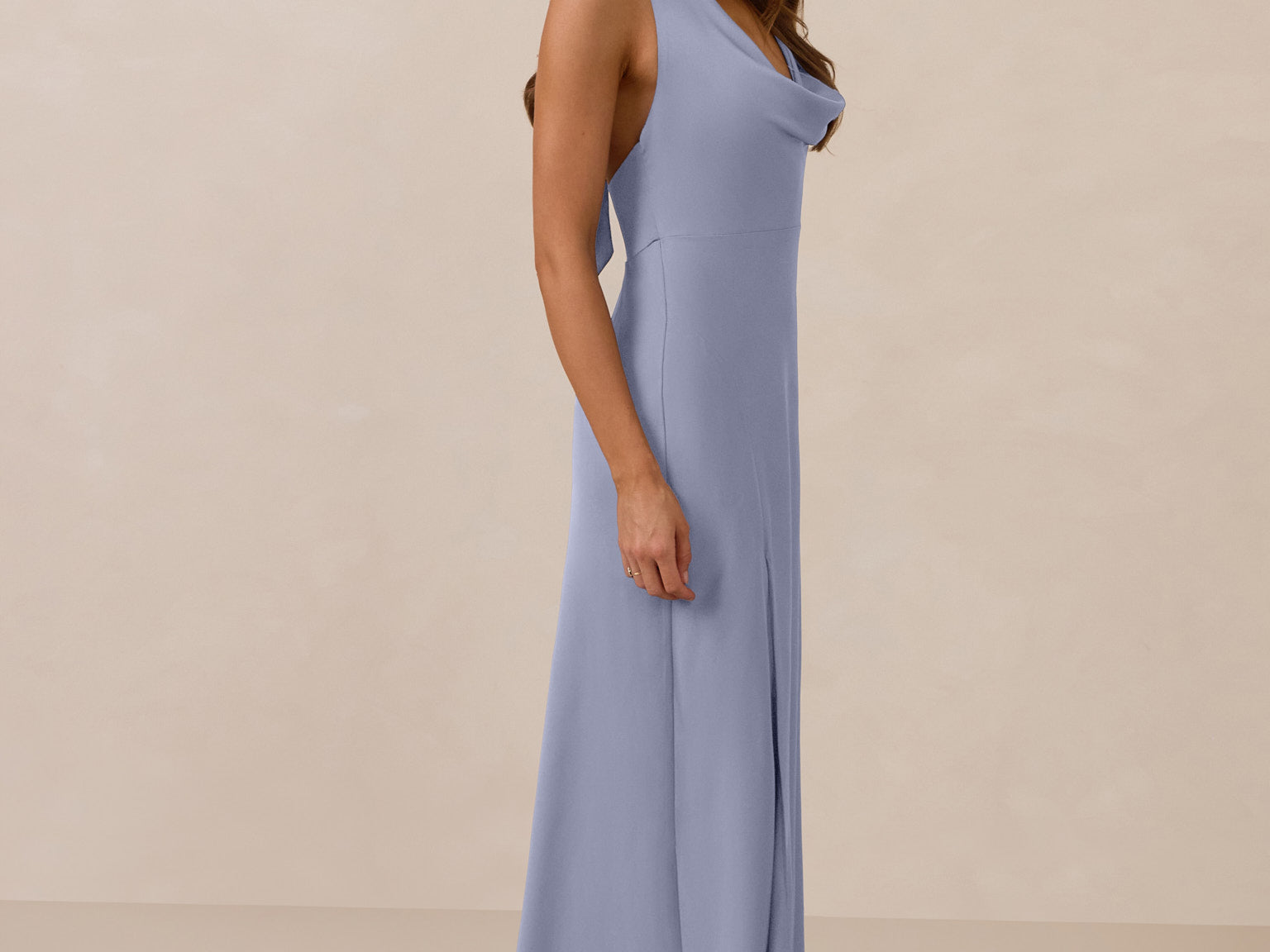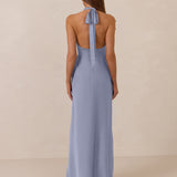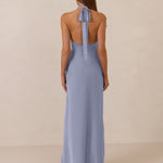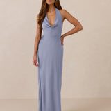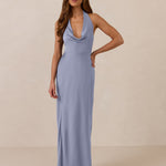 Effortlessly elegant, this bias-cut satin maxi dress features a fluid skirt with a curved thigh-high slit and a draped cowl neckline. A delicate halter back completes the look. Perfect for any occasion, it's glossy and flattering.
