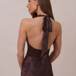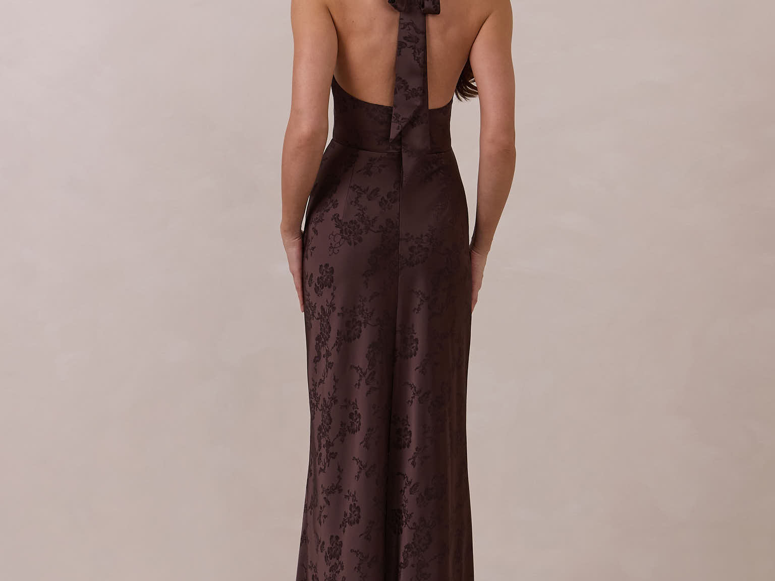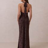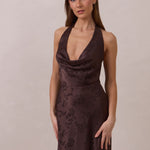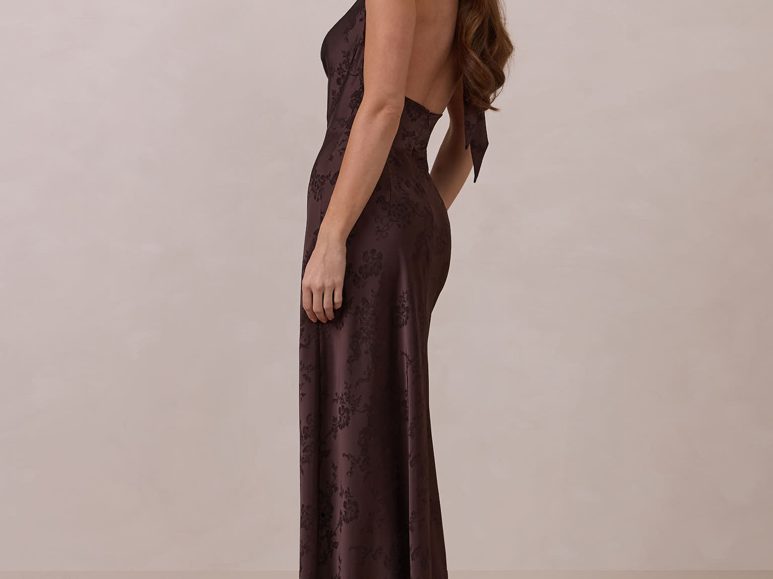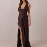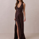 Effortlessly elegant, this bias-cut satin maxi dress features a fluid skirt with a curved thigh-high slit and a draped cowl neckline. A halter tie and open back complete the look. Perfect for any formal occasion, it's glossy and flattering.