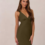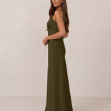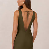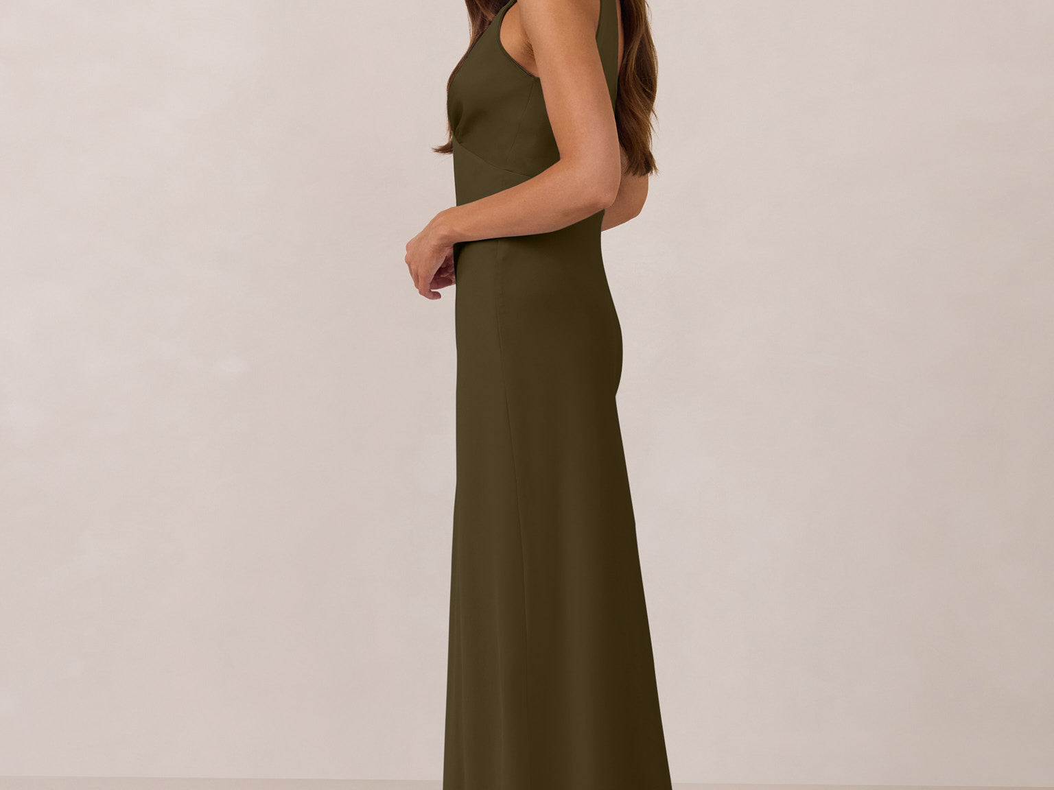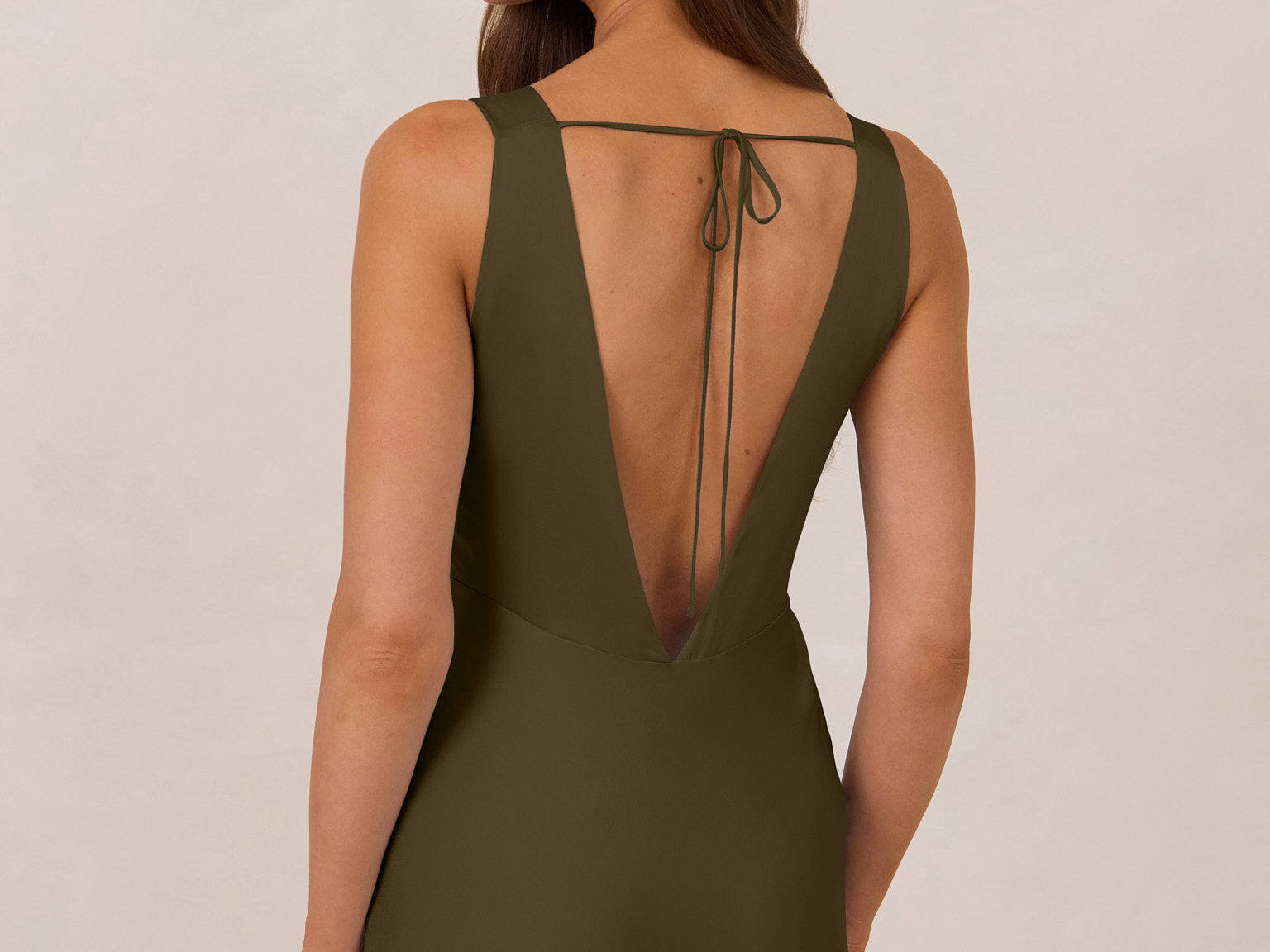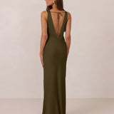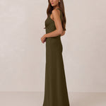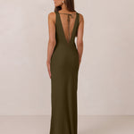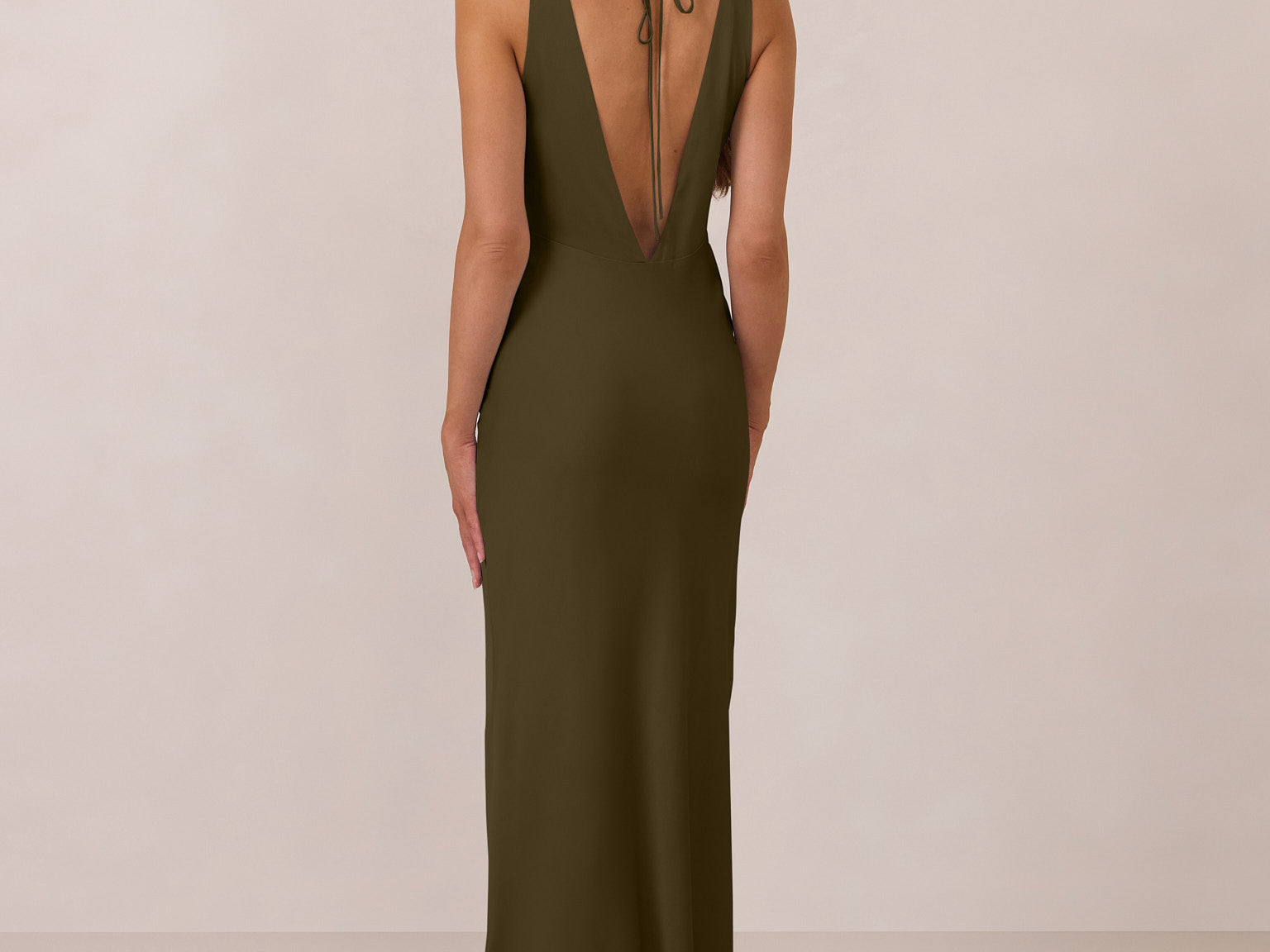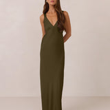 Featuring a flattering V-neckline, gathering at the bust, and an open back, this bias-cut dress offers a sleek, elongating silhouette. The clean lines and minimalist design make it the perfect choice for any special occasion.
