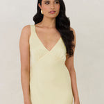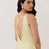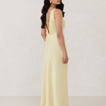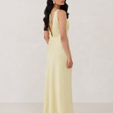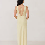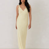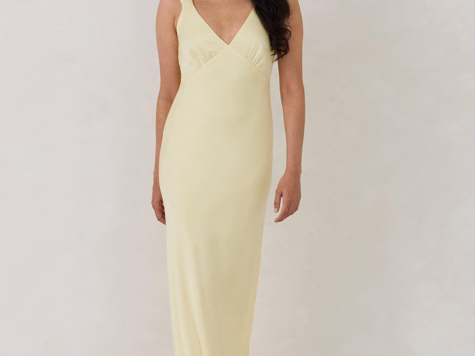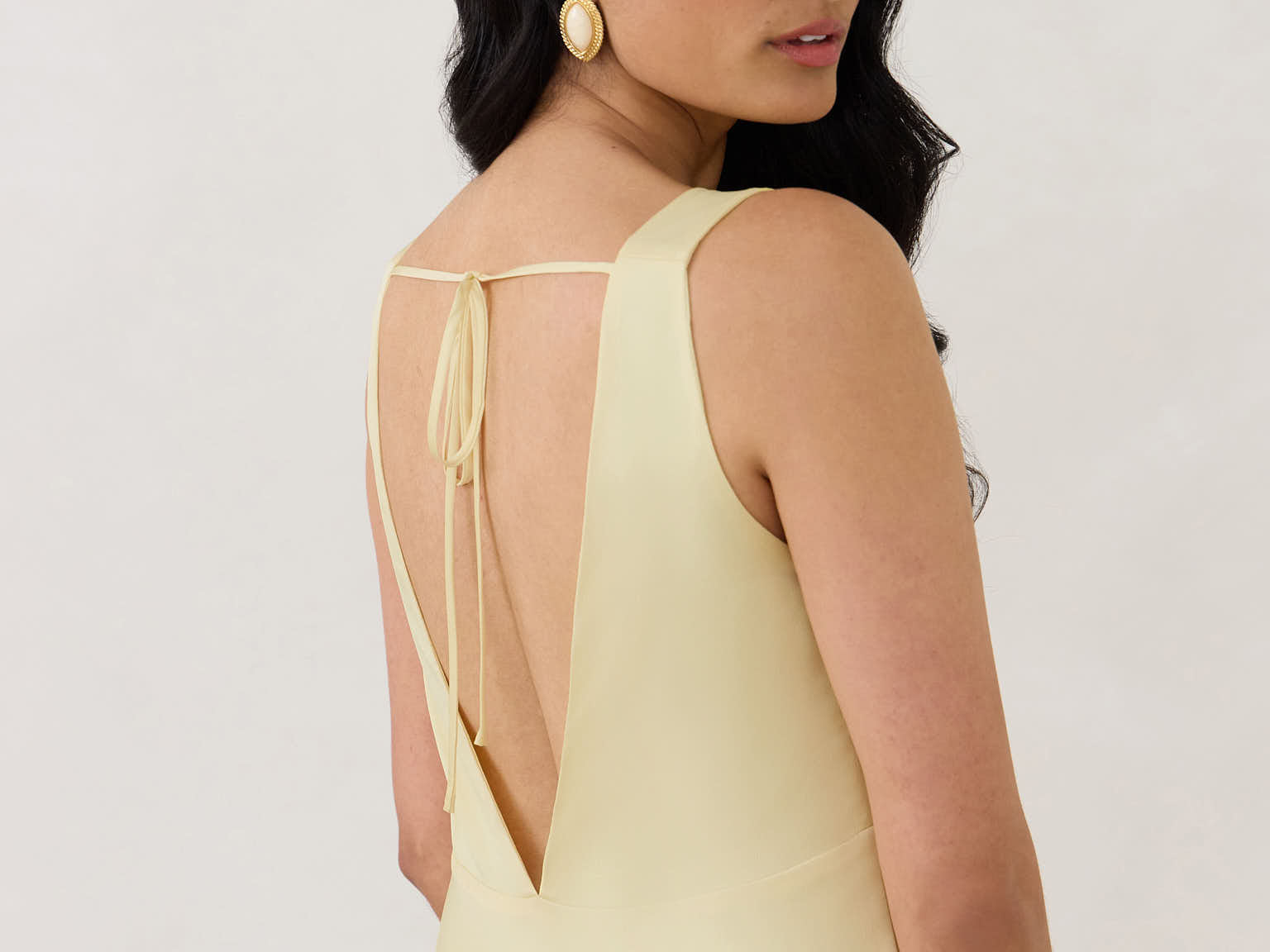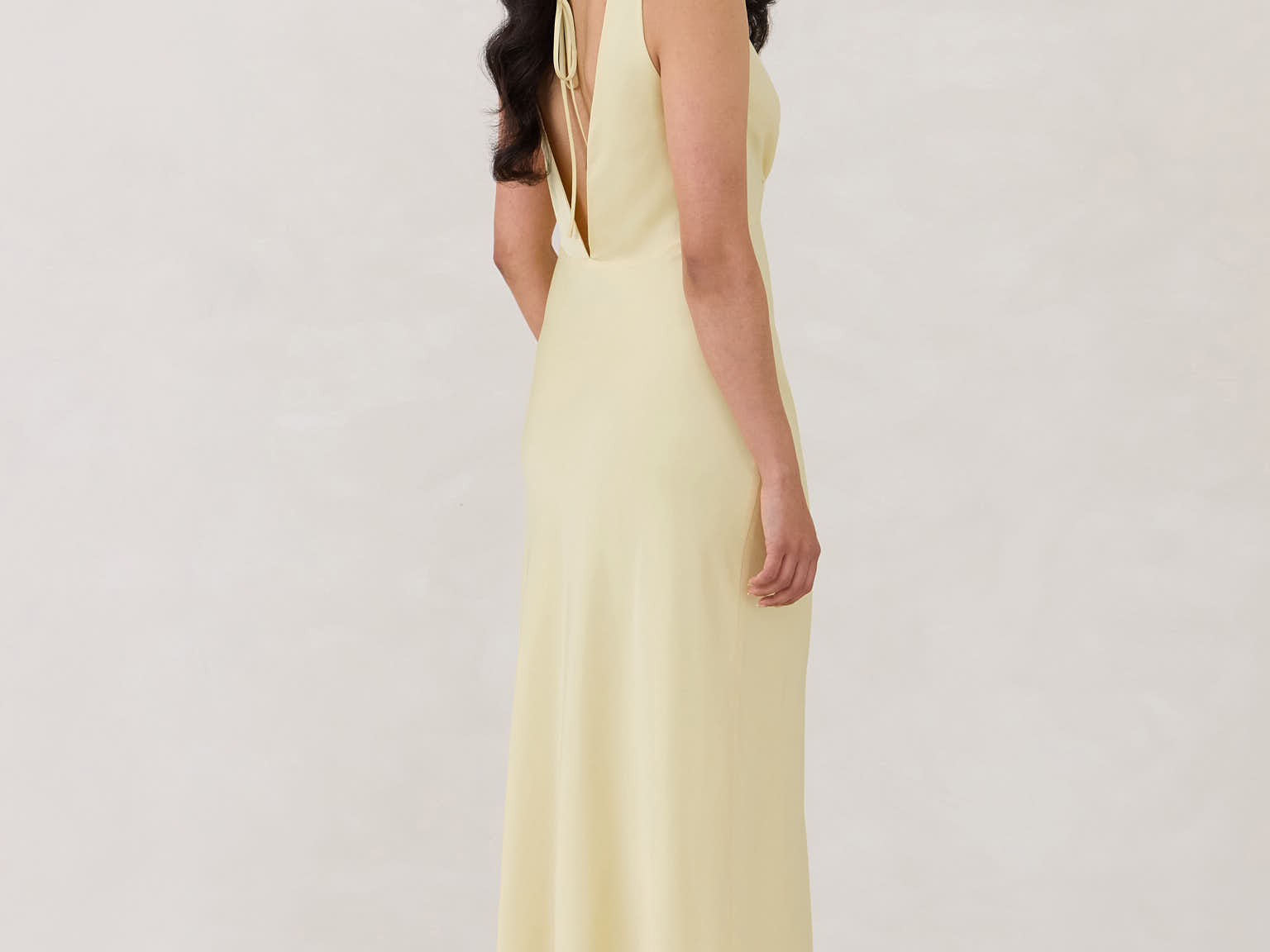 Featuring a flattering V-neckline, gathering at the bust, and an open back, this bias-cut dress offers a sleek, elongating silhouette. The clean lines and minimalist design make it the perfect choice for any special occasion.