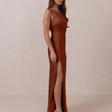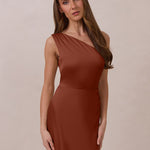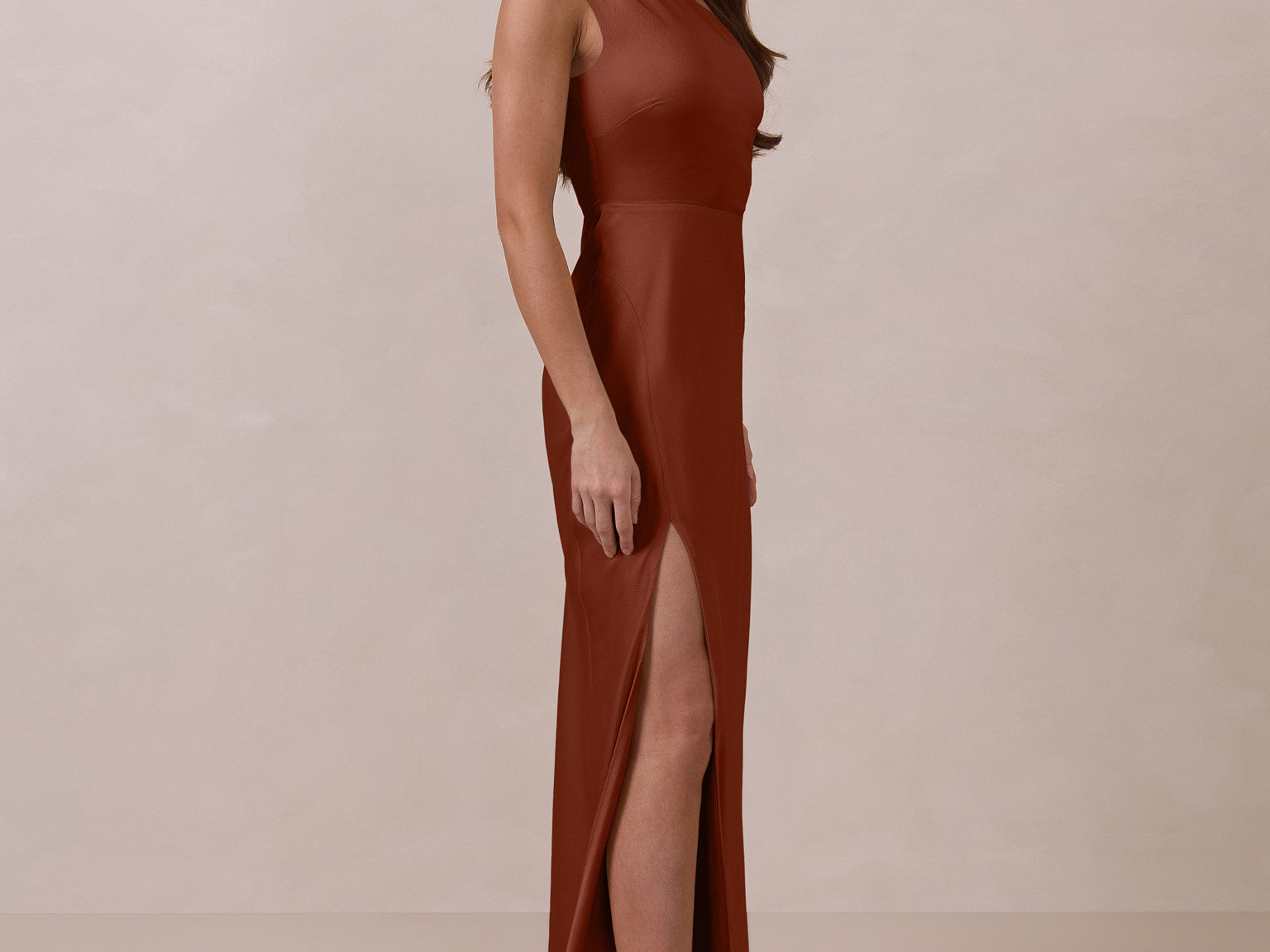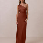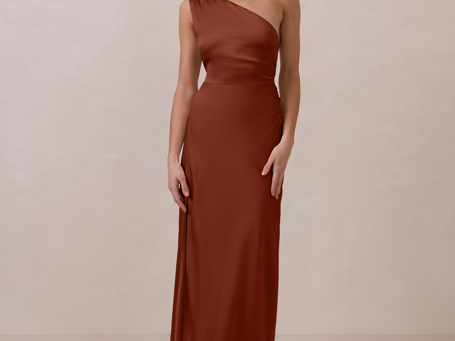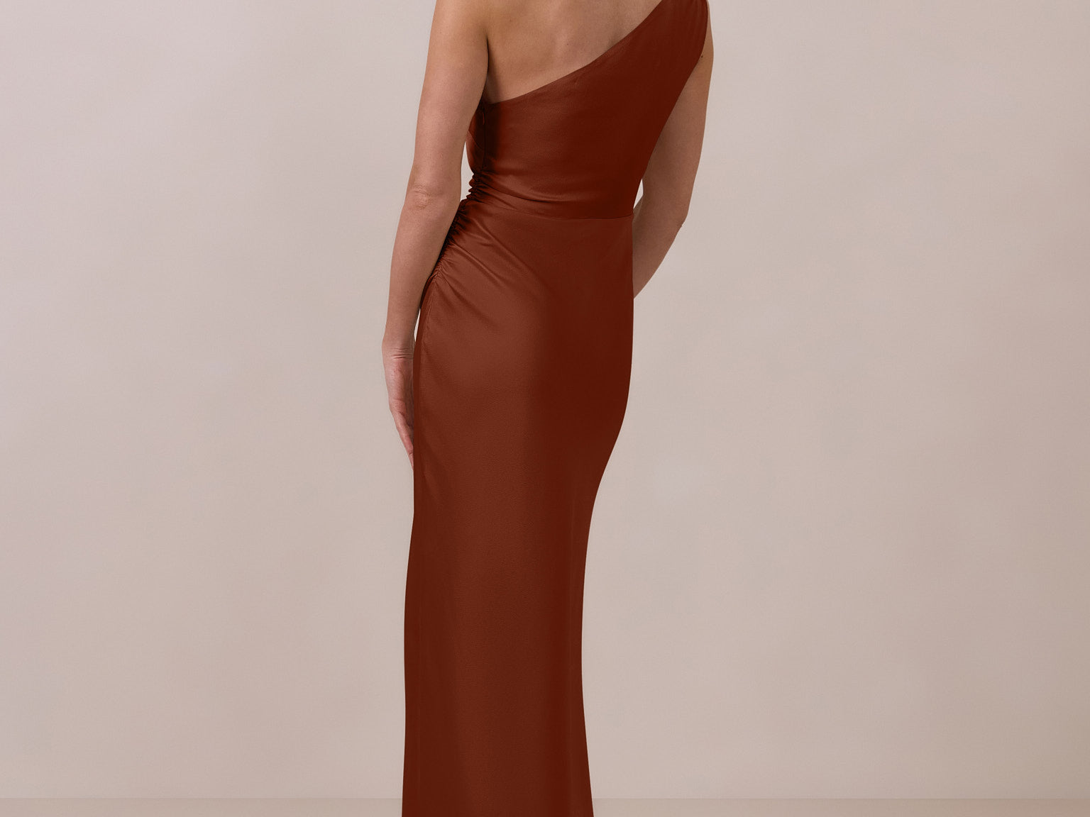 The Hartley dress offers modern minimalism and effortless charm. Made from soft, silky satin, this full-length silhouette drapes beautifully. Delicate ruching on the one-shoulder strap and right side seam adds subtle texture and enhances the figure-hugging fit. A sleek side slit completes the look, offering just the right amount of movement and allure.