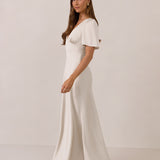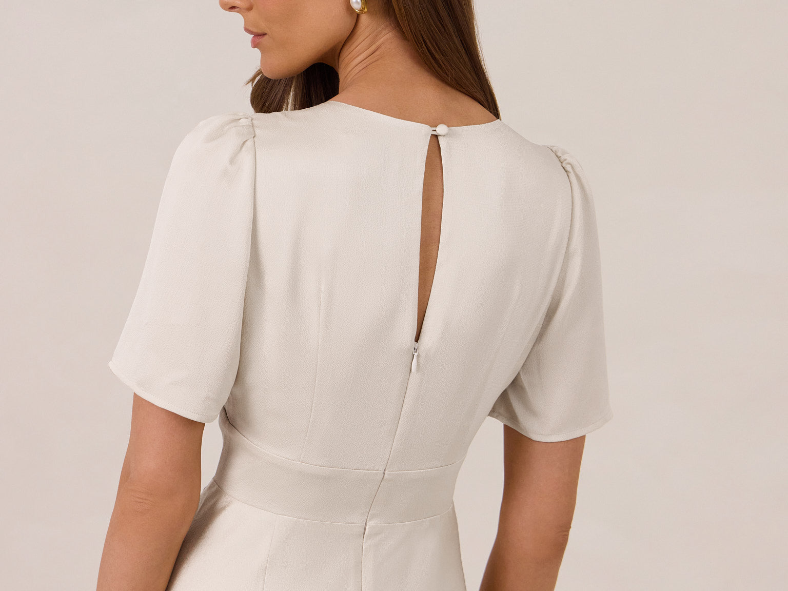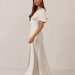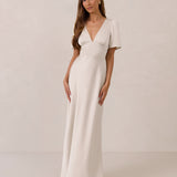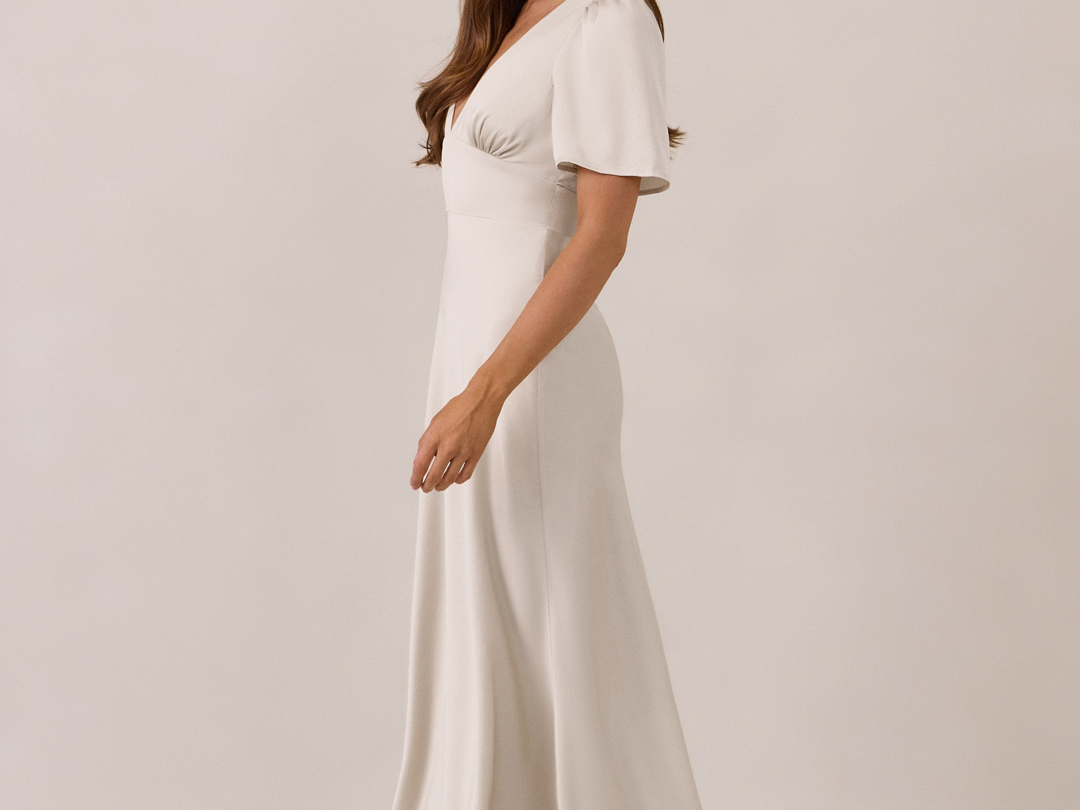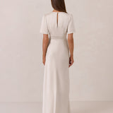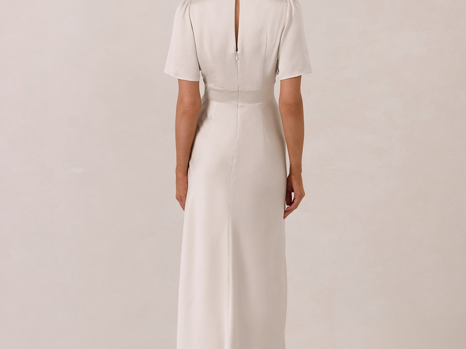 This full-length satin dress features a romantic V neckline, short sleeves, and a bias-cut skirt for an effortlessly feminine silhouette. A subtle keyhole back and delicate button closure add unexpected detail. Finished in silky satin with a soft, light-catching sheen.