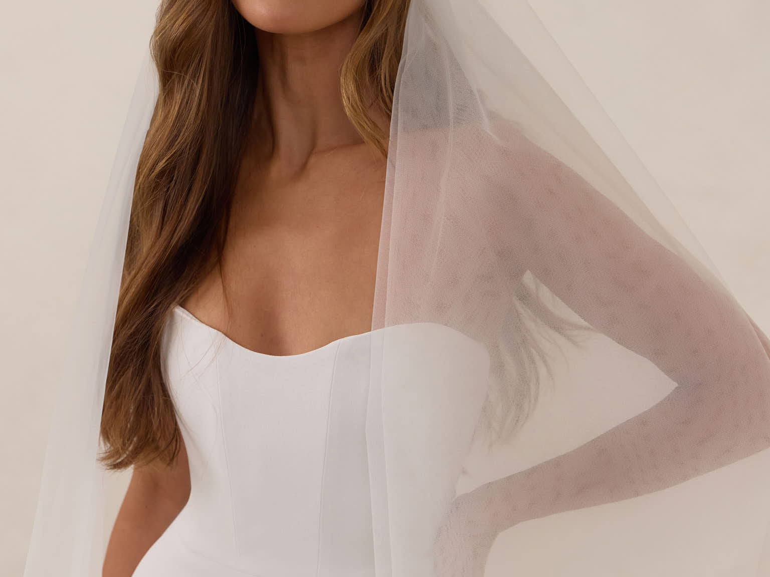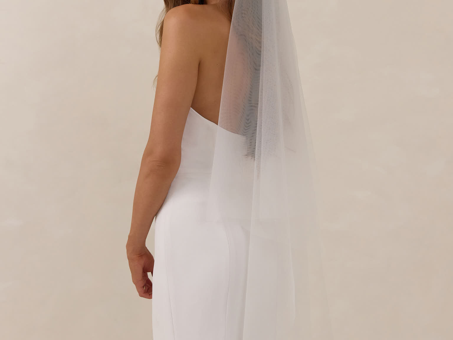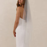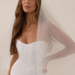 This delicate, fingertip-length veil, crafted from lightweight, airy tulle, adds a touch of timeless romance to any bridal look.Its graceful drape creates an ethereal silhouette that beautifully complements your wedding gown, while the attached blusher lends classic, vintage-inspired charm, perfect for your ceremony.