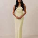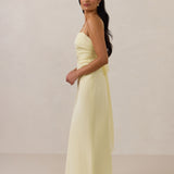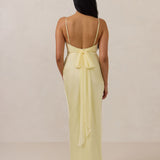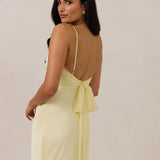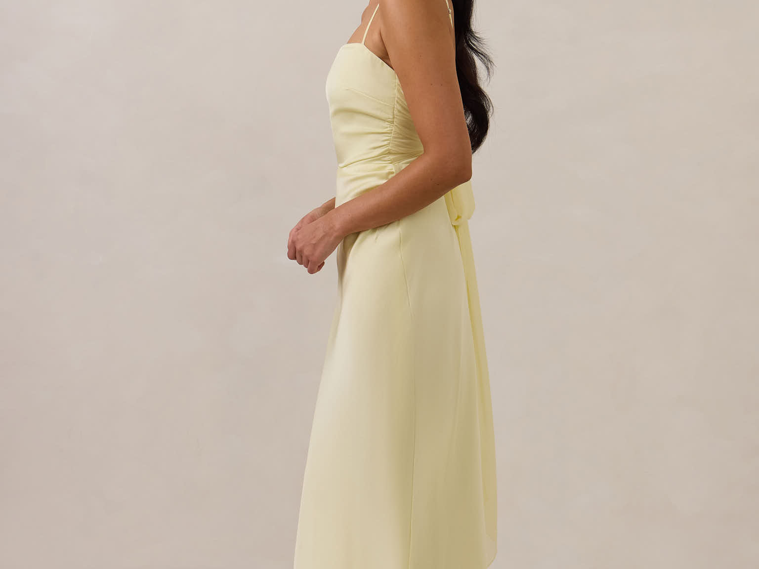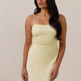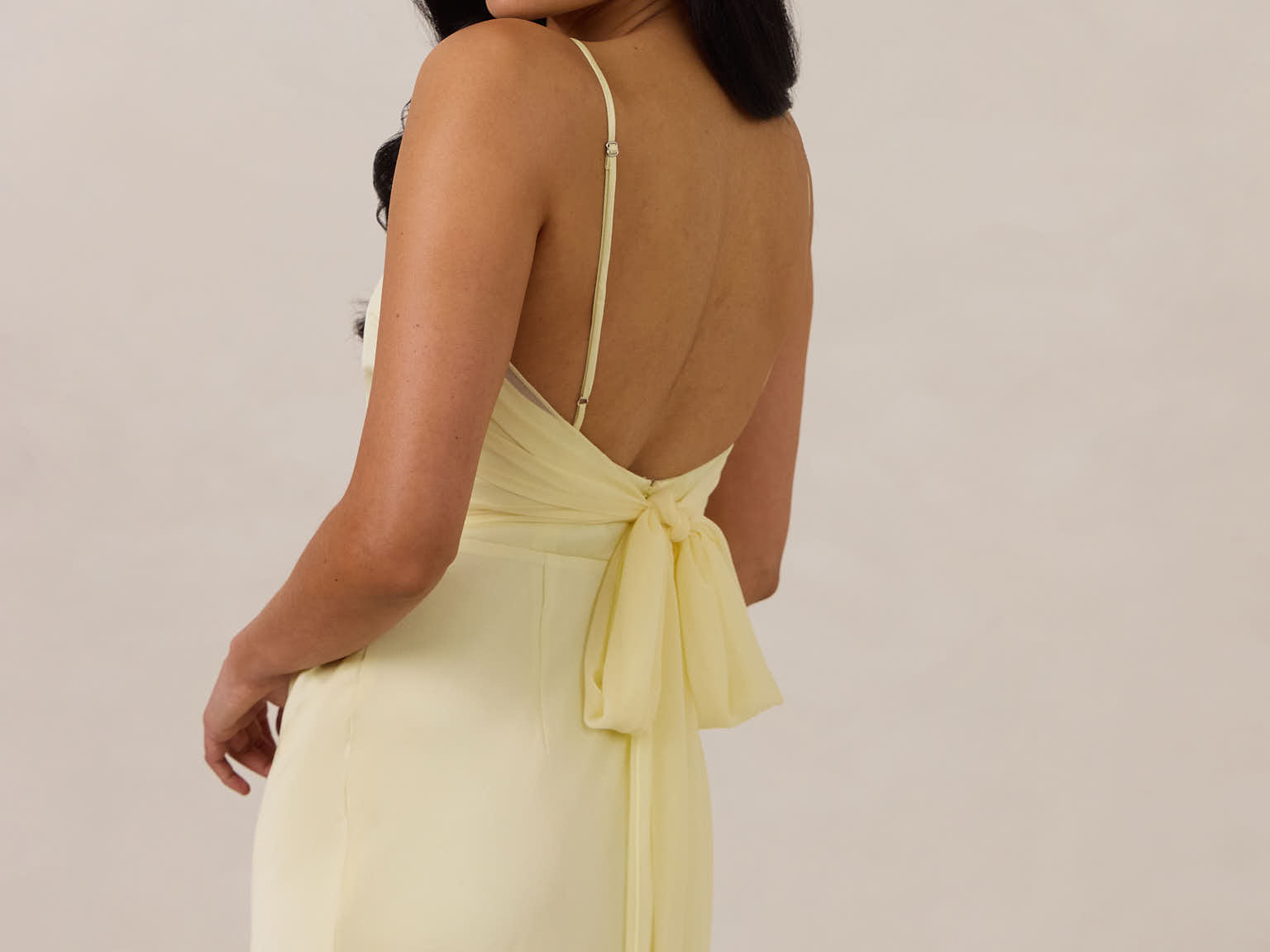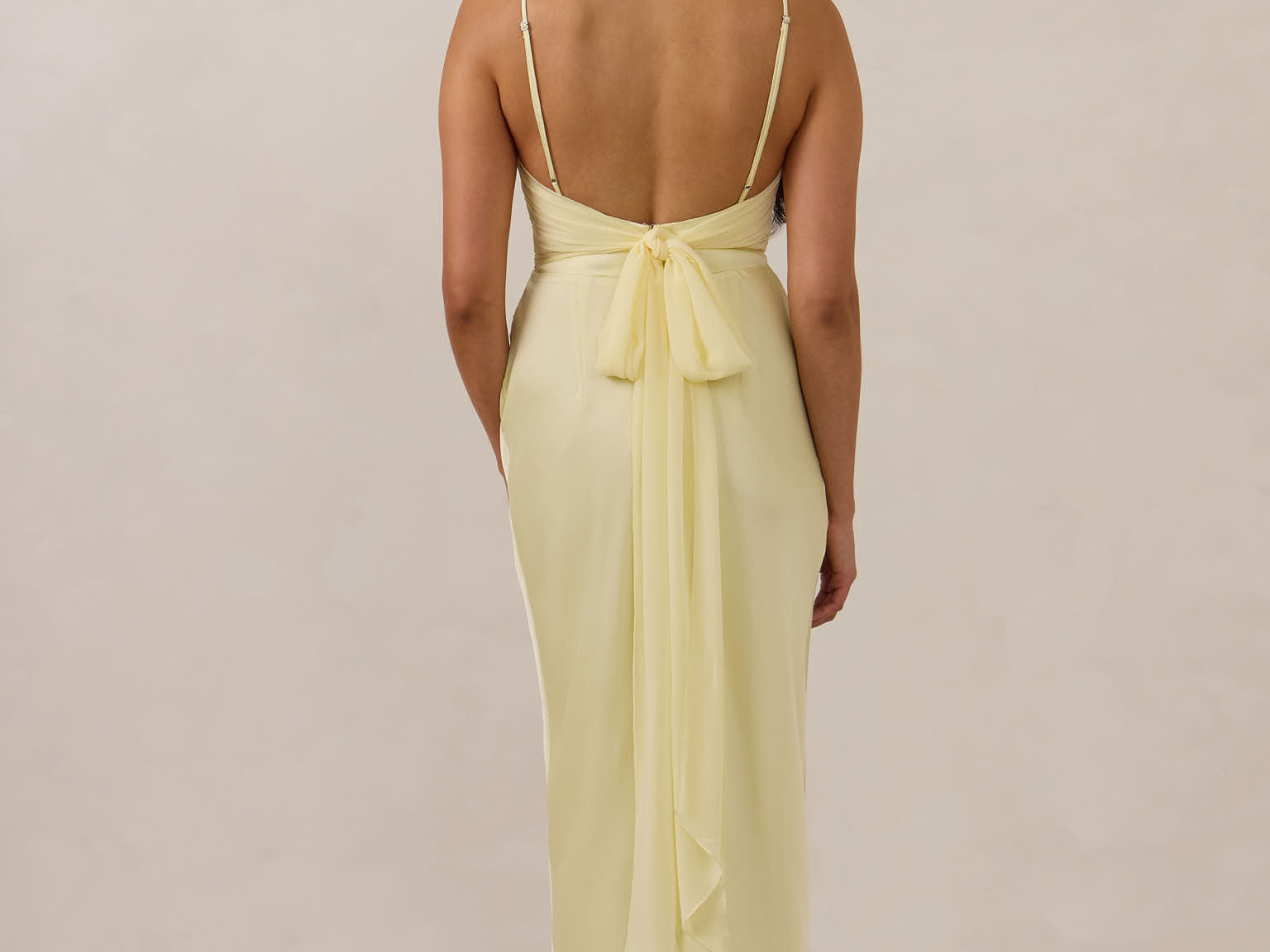 Meet your new occasion essential. This satin midi dress features a clean straight neckline and a fluid, body-skimming silhouette. The open back is finished with a soft stretch-chiffon bow, adding a romantic touch.