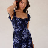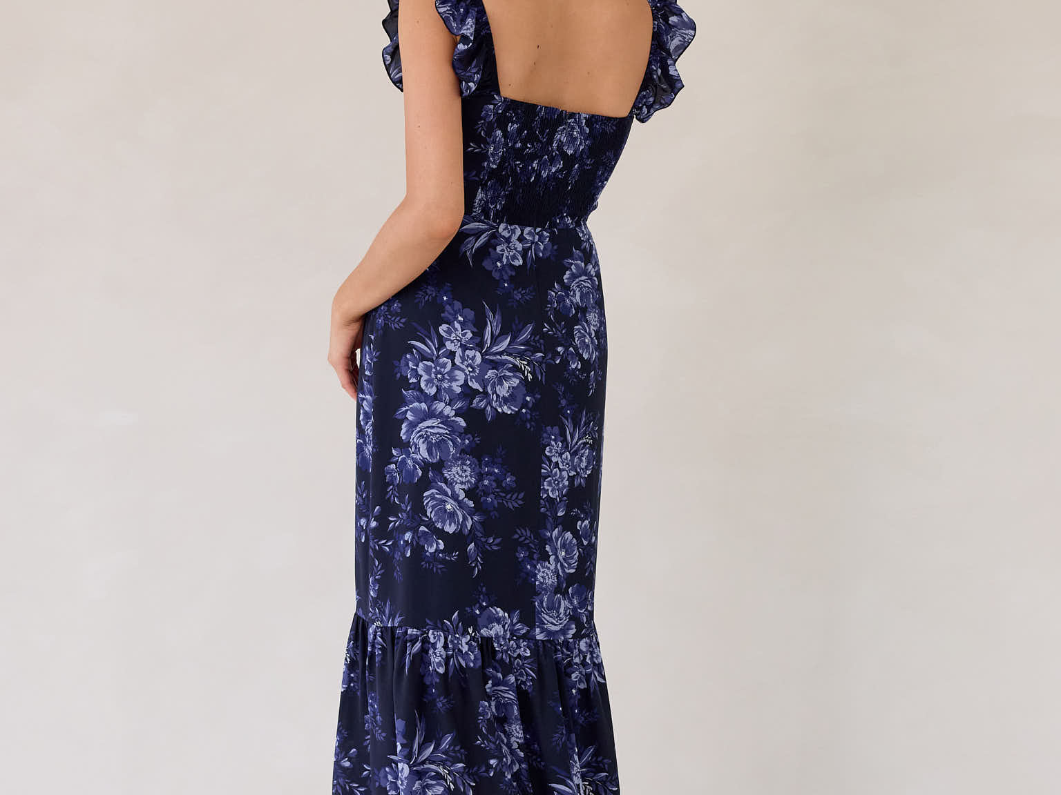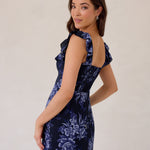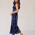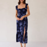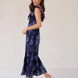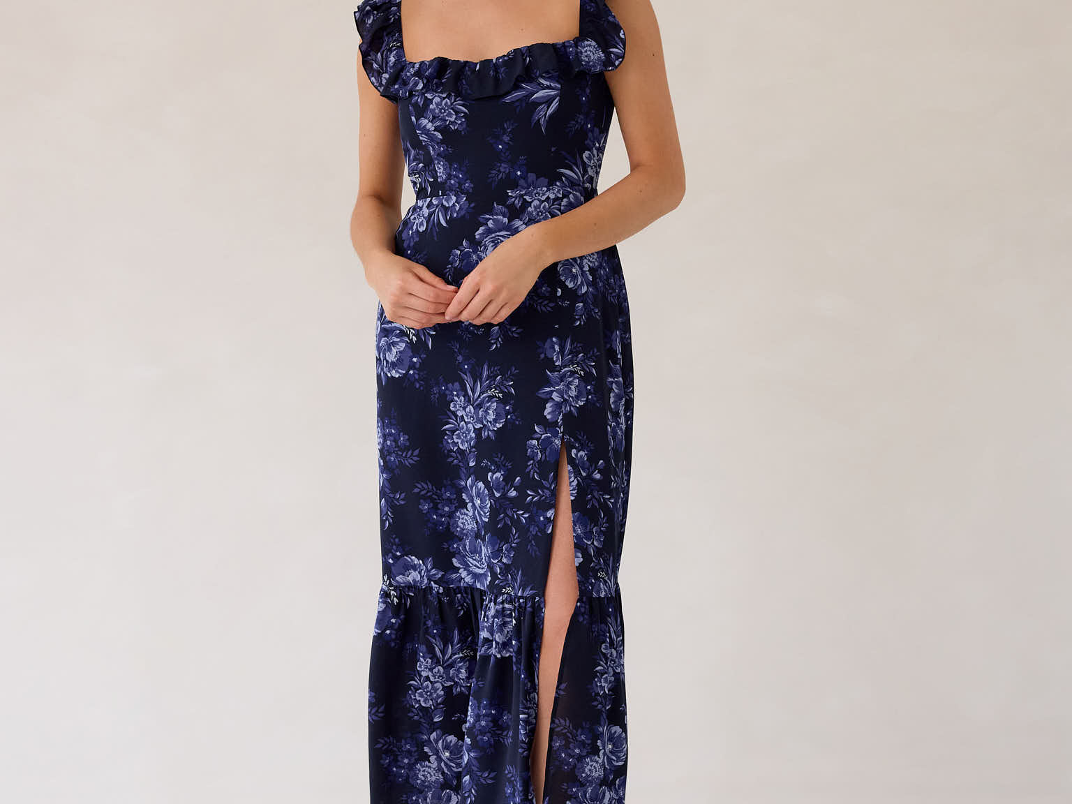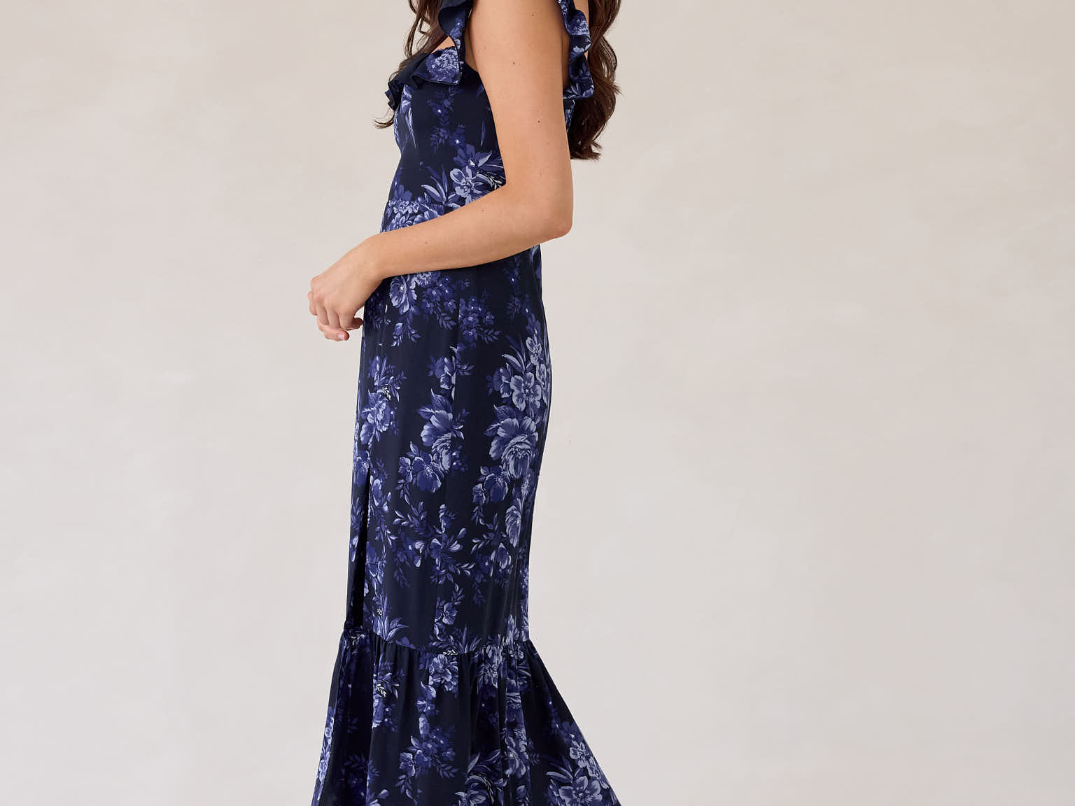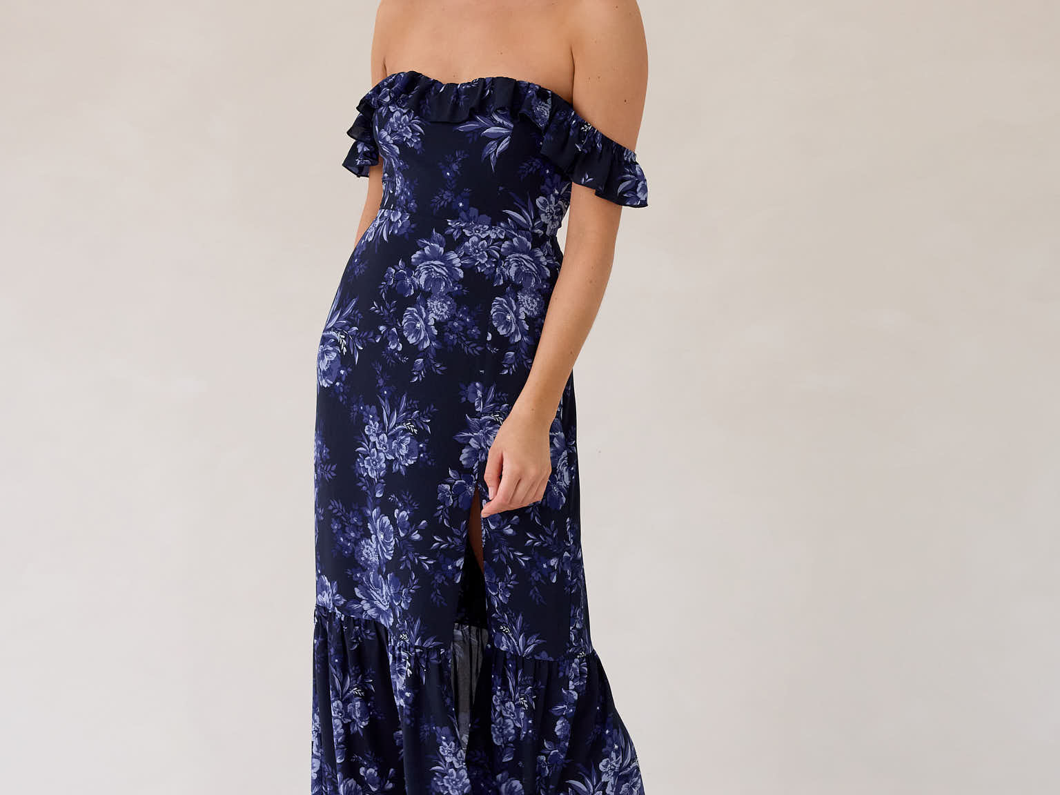 Designed with a soft ruffle neckline that can be worn off-the-shoulder or as straps, this silhouette features a fitted bodice that flows into a breezy skirt with a thigh-high slit. A subtle ruffle hem adds movement, making it perfect for weddings and special occasions.