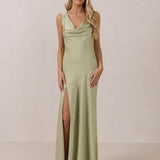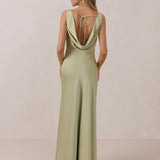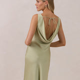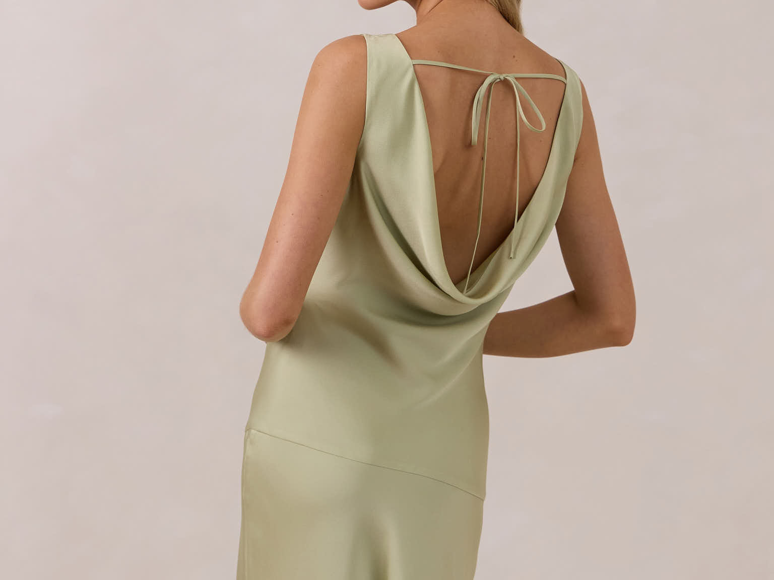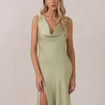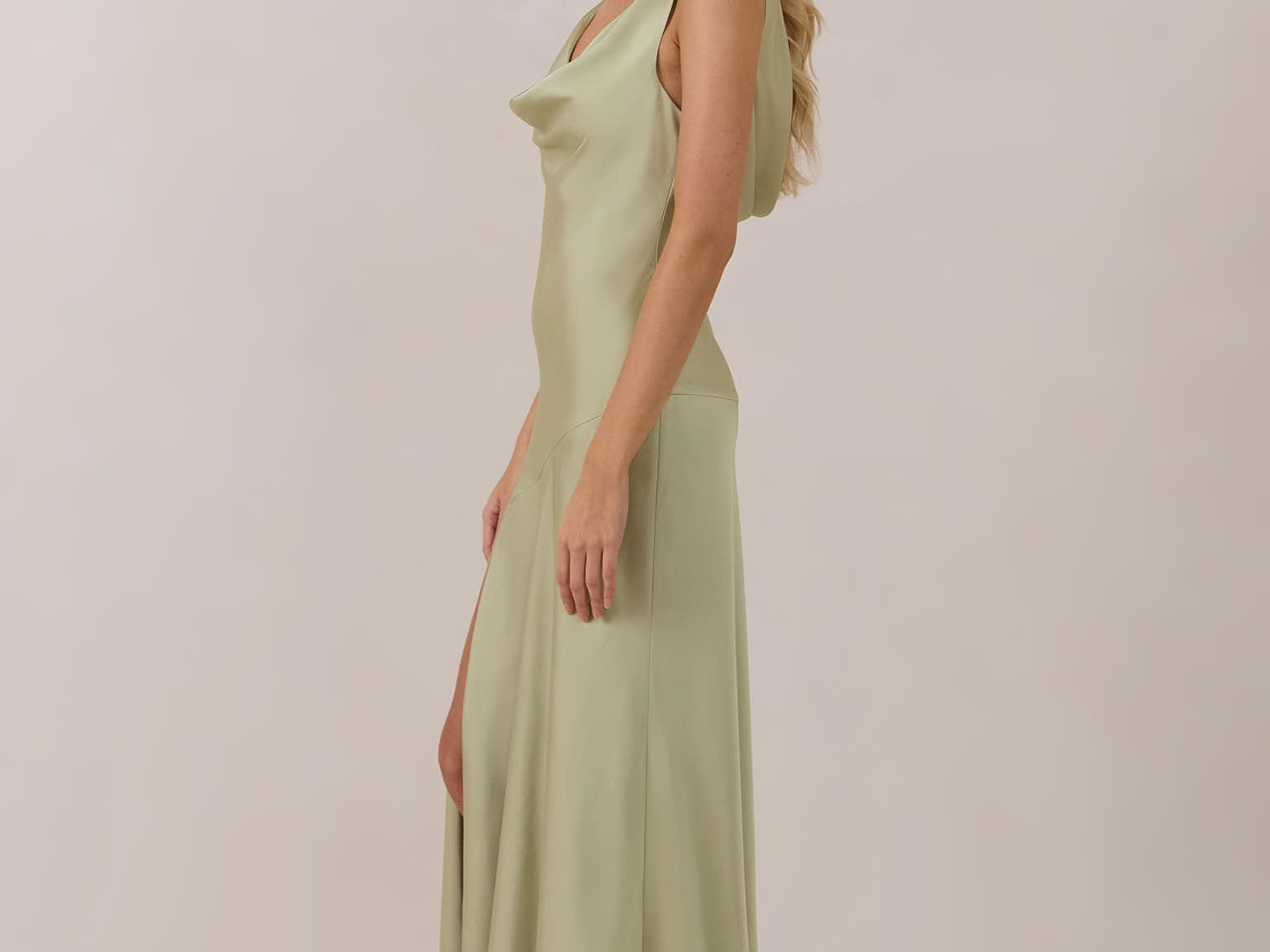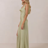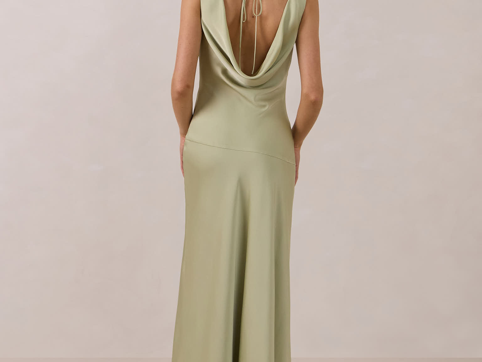 Crafted from soft satin, this full-length dress blends timeless ease with understated drama. A draped cowl neckline and low, open back create an elegant balance of structure and fluidity. The bodice is cut on the bias for a flattering fit, flowing into a fuller skirt with a front slit for a subtle hint of movement.