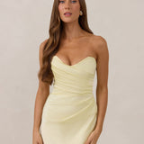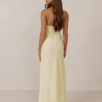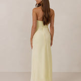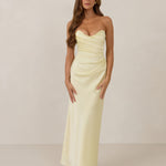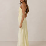 Designed with a scoop sweetheart neckline and soft pleating through the boned bodice and skirt, this dress creates a sleek, feminine silhouette. Elegant and timeless, it’s an ideal choice for weddings, receptions, or any formal occasion.