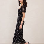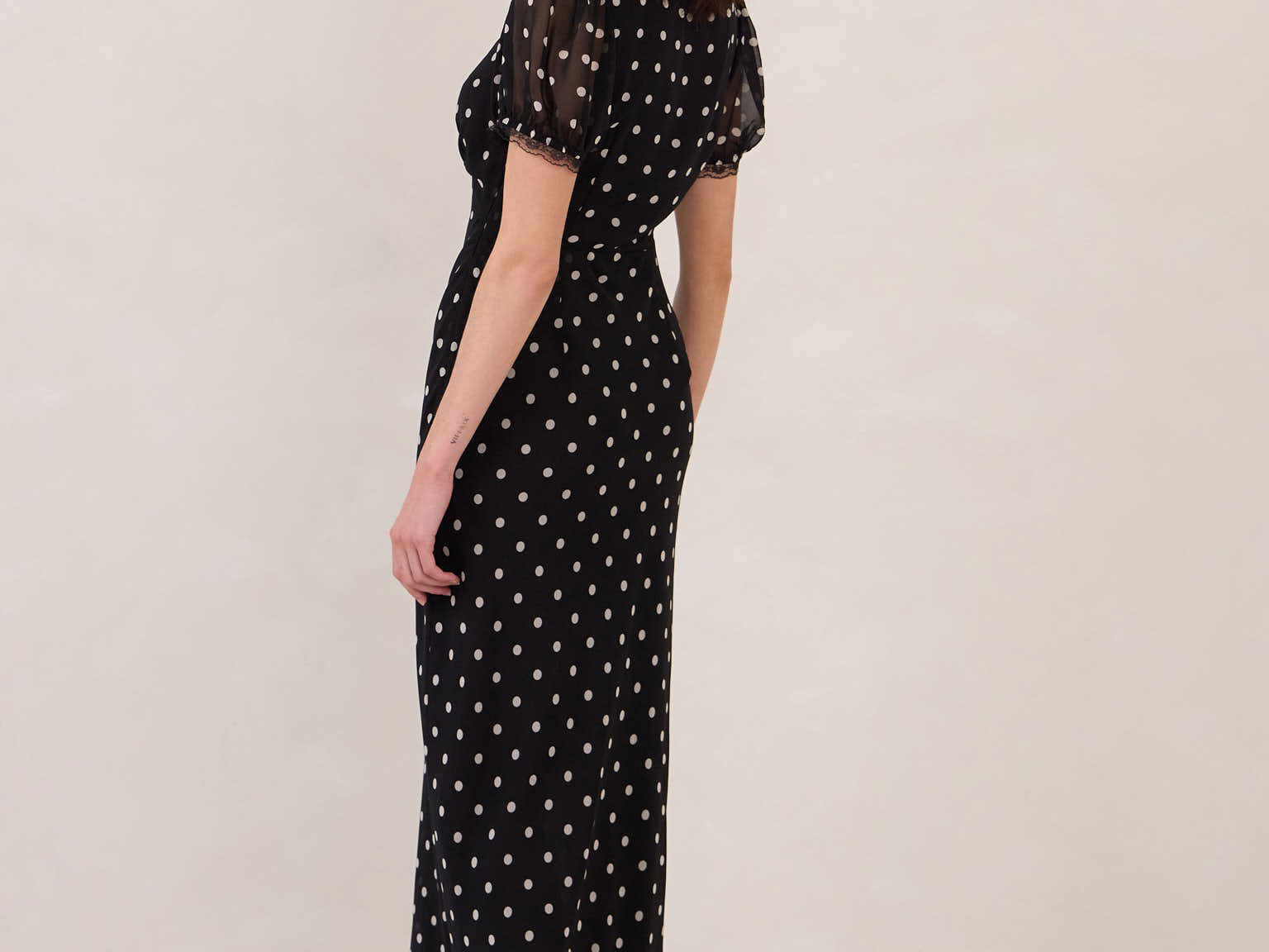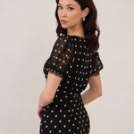 The perfect combination of sexy and cute. Made with chiffon, and a delicate lace lined detail around the neckline and sleeves, The Bowery masters the transition from day to night in this effortless polka dot dress.