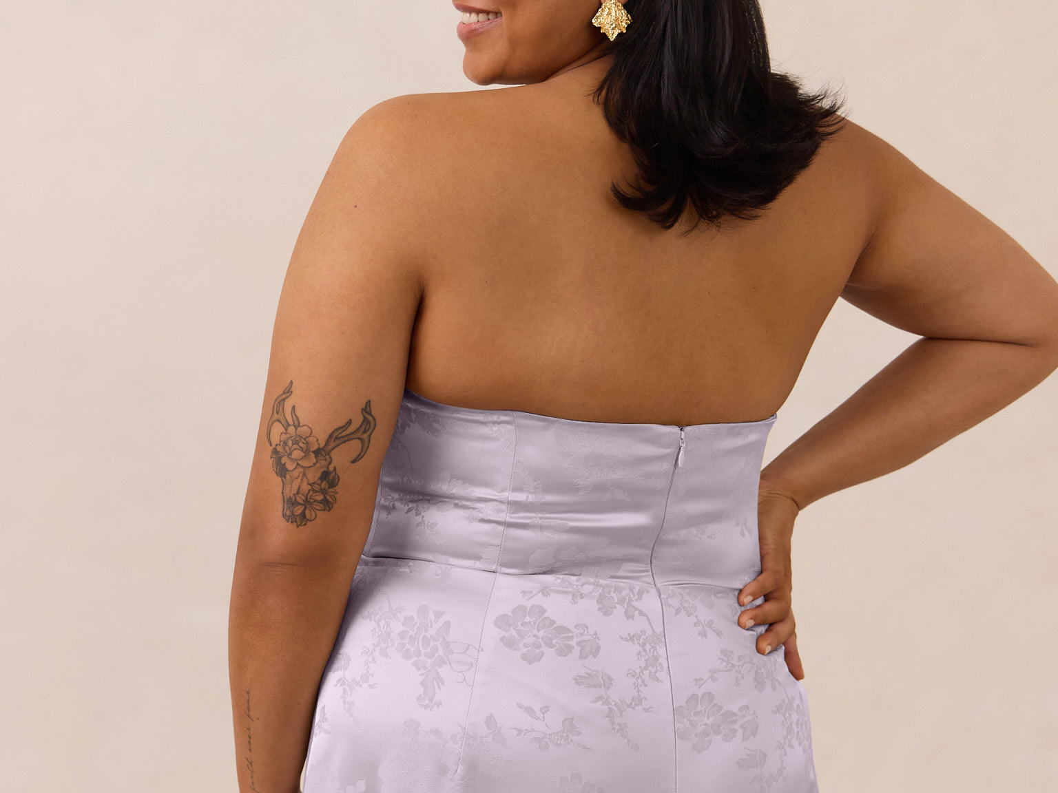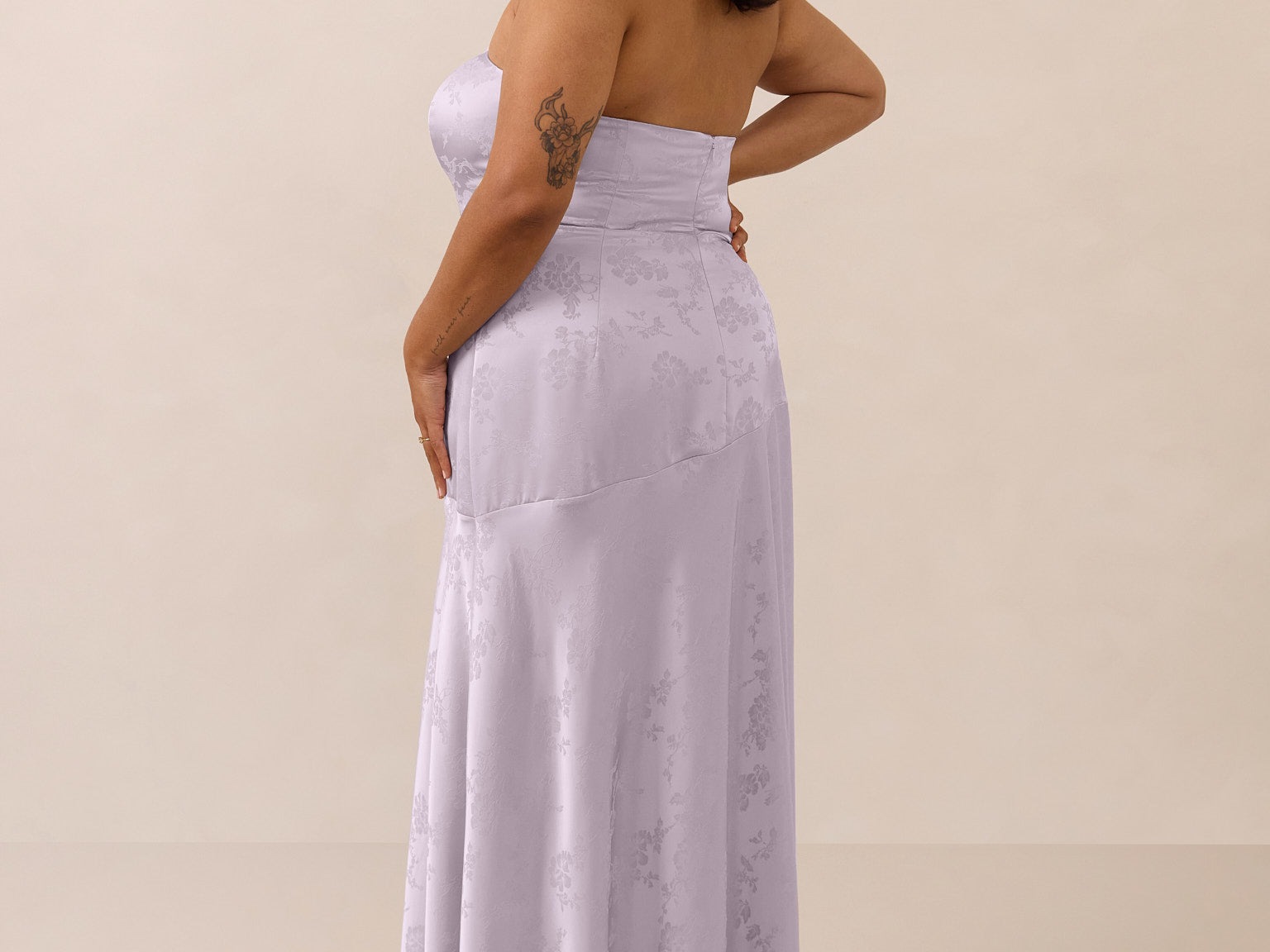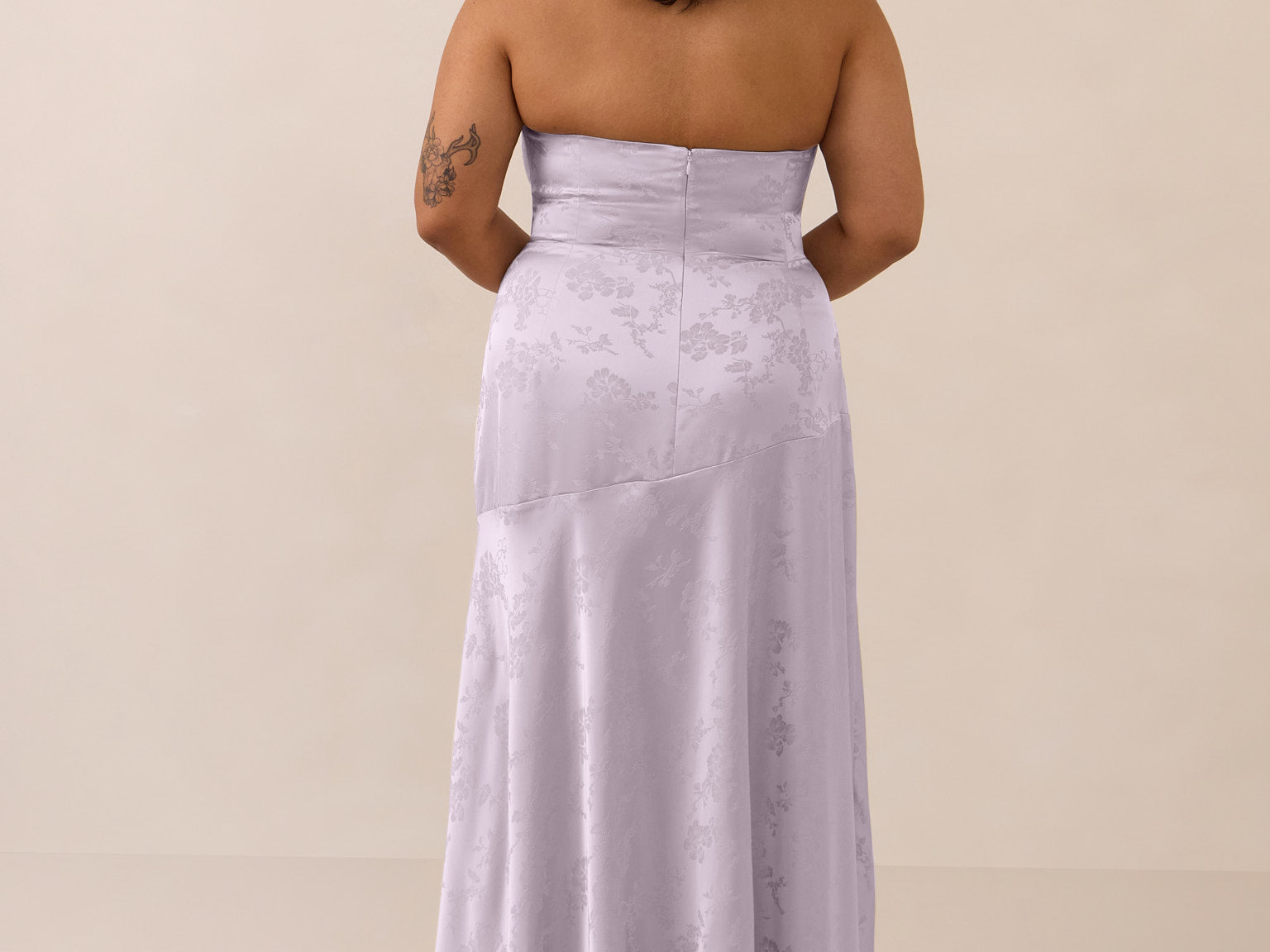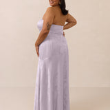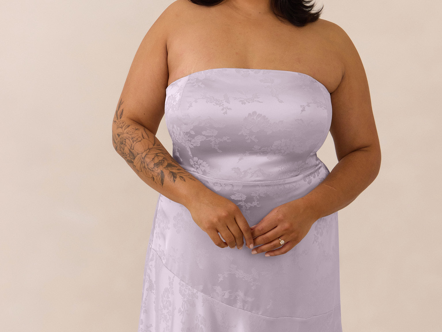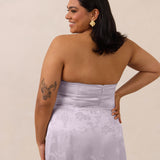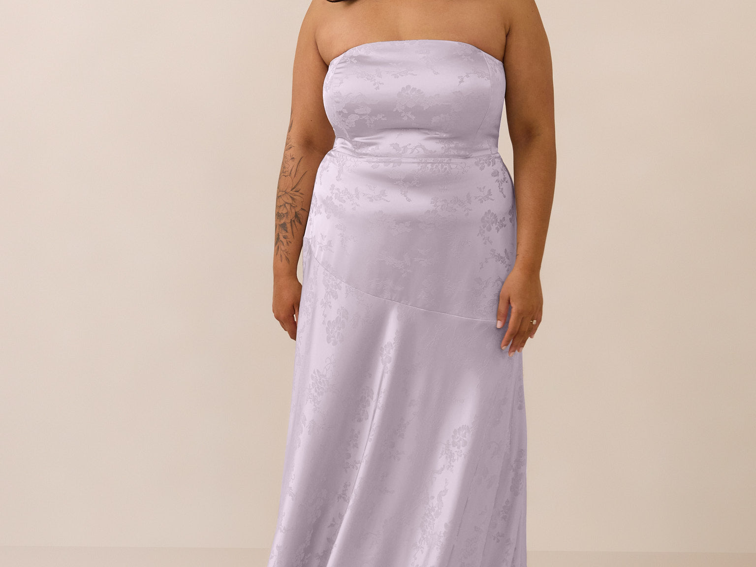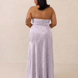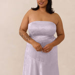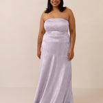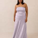 The Delaney is a full-length, strapless silhouette crafted from luxurious Jacquard satin. Clean lines and a smooth, sculpted bodice create a timeless look, while the sleek finish makes it an elevated choice for any bridal party.