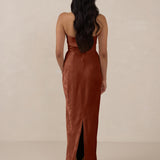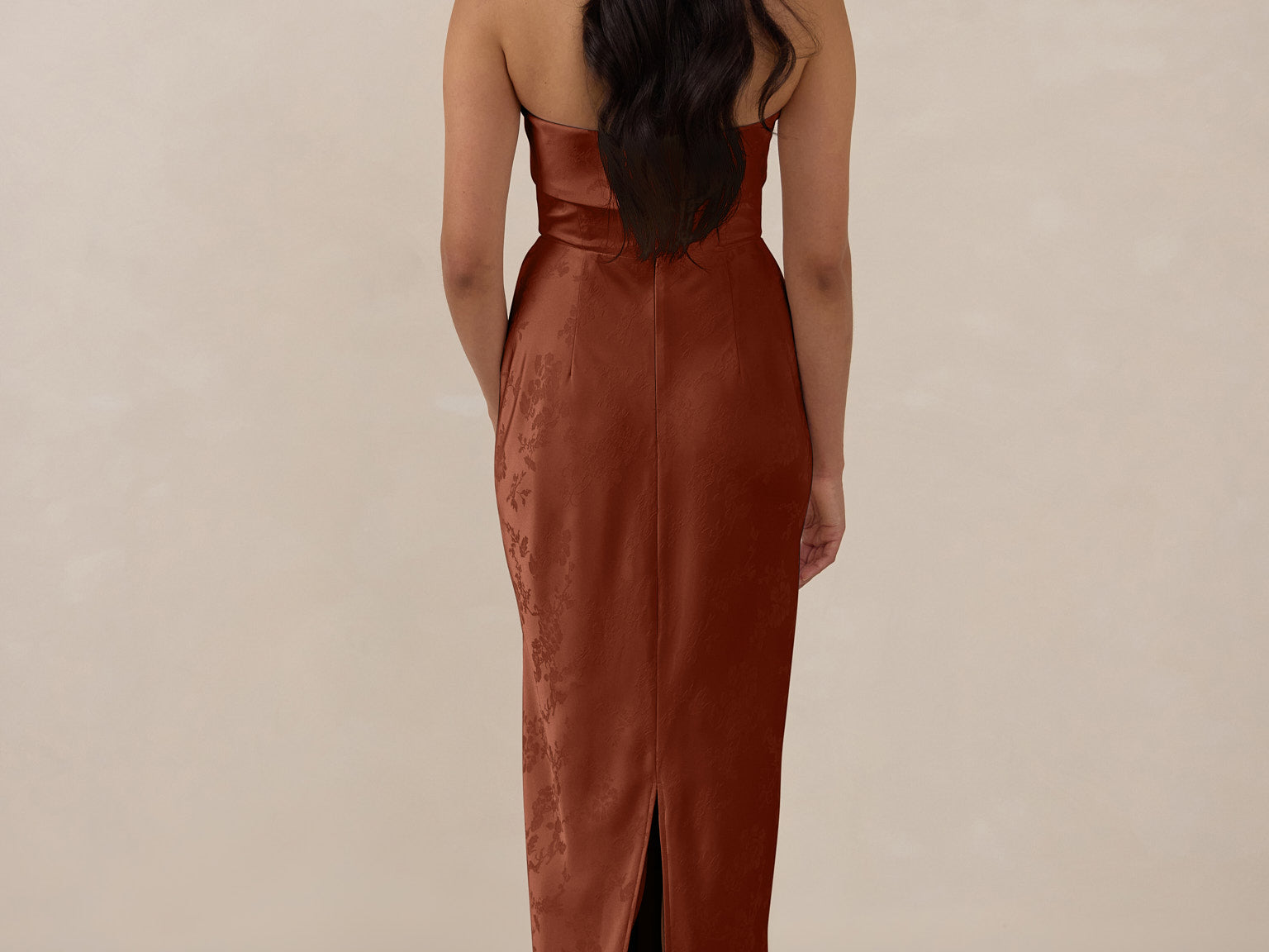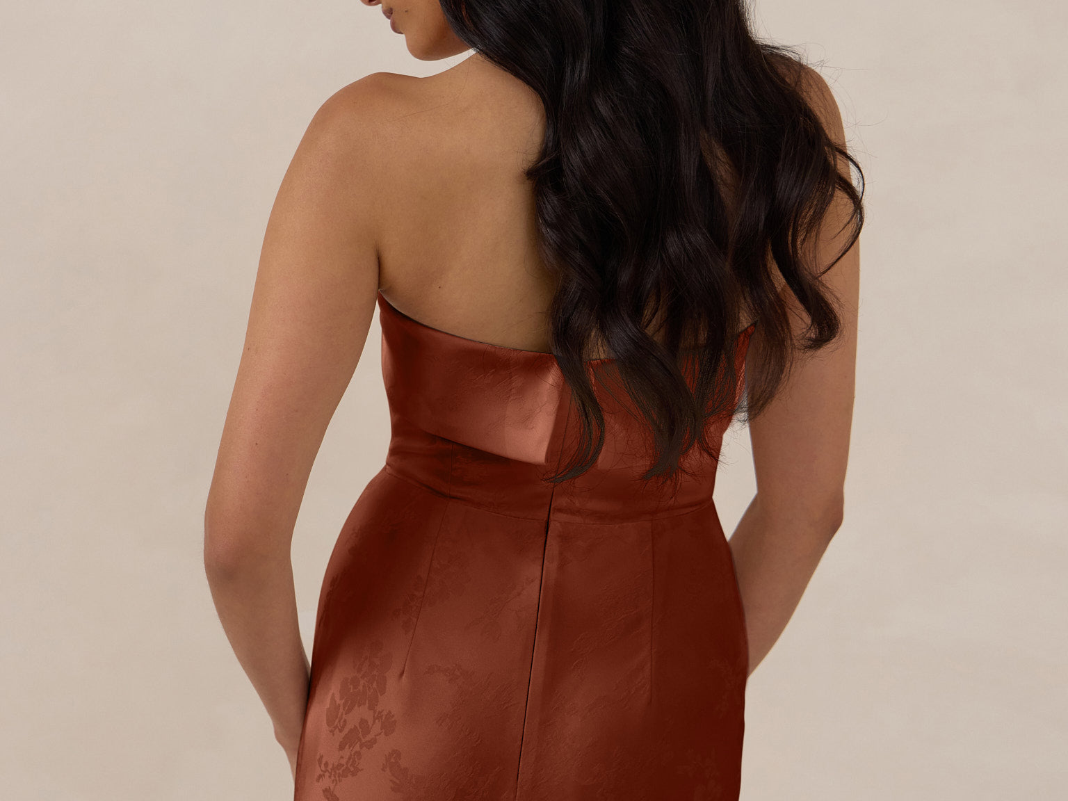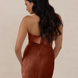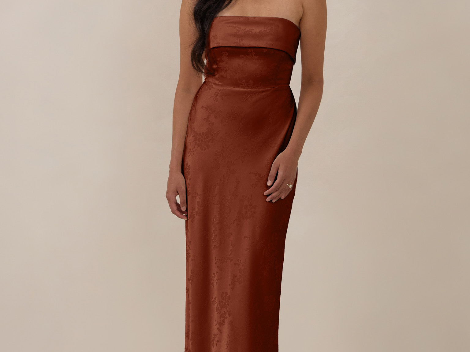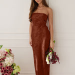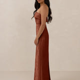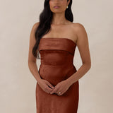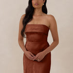 A timeless piece designed to captivate. Designed from luxe bubble satin fabric with a subtle sheen, this dress exudes understated glamour. The structured, folded strapless neckline adds a modern sculptural element, gracefully framing the shoulders.
