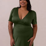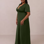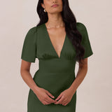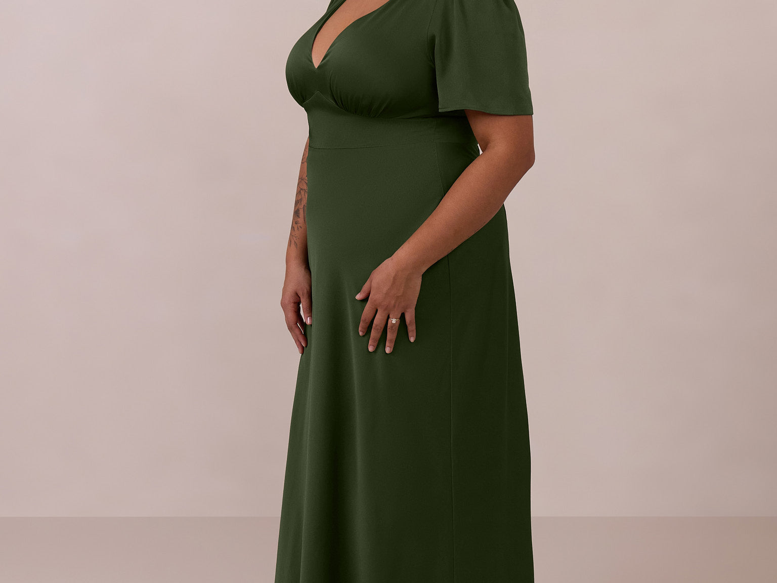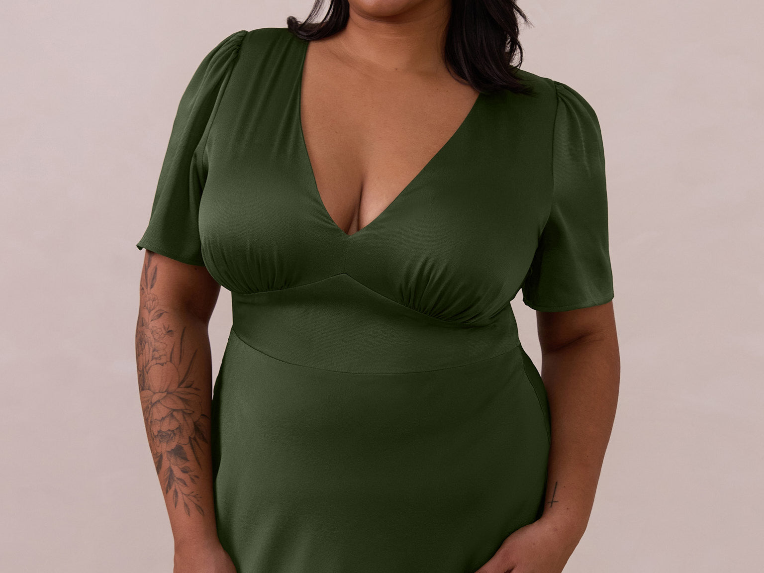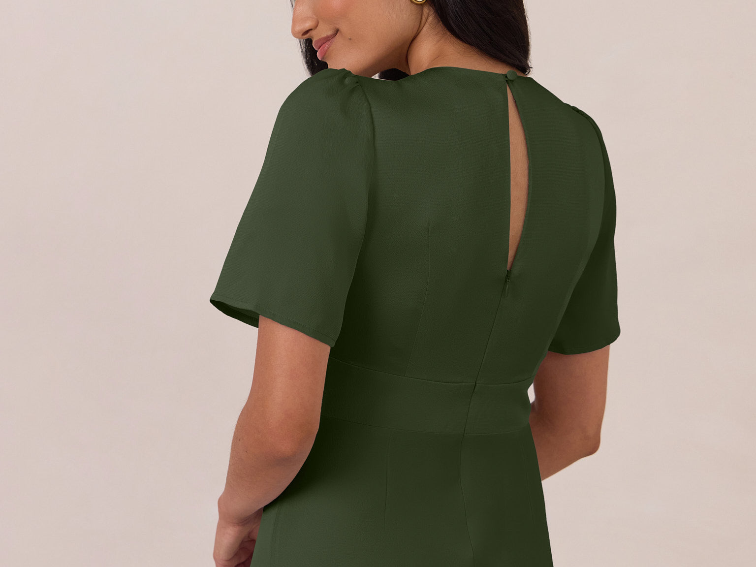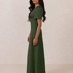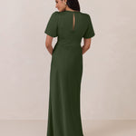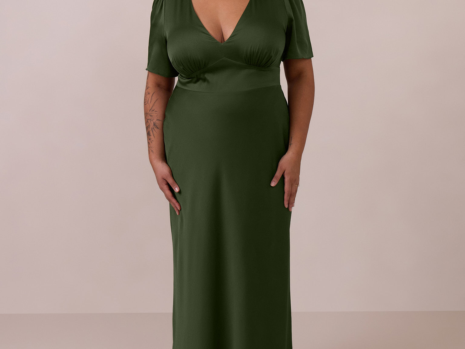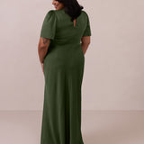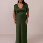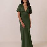 This full-length satin dress features a romantic V neckline, short sleeves, and a bias-cut skirt for an effortlessly feminine silhouette. A subtle keyhole back and delicate button closure add unexpected detail. Finished in silky satin with a soft, light-catching sheen.