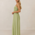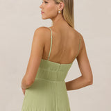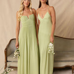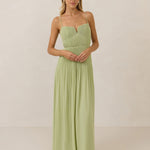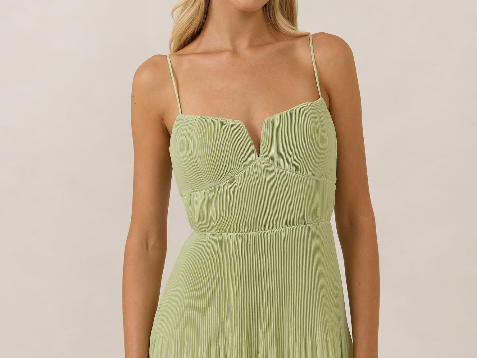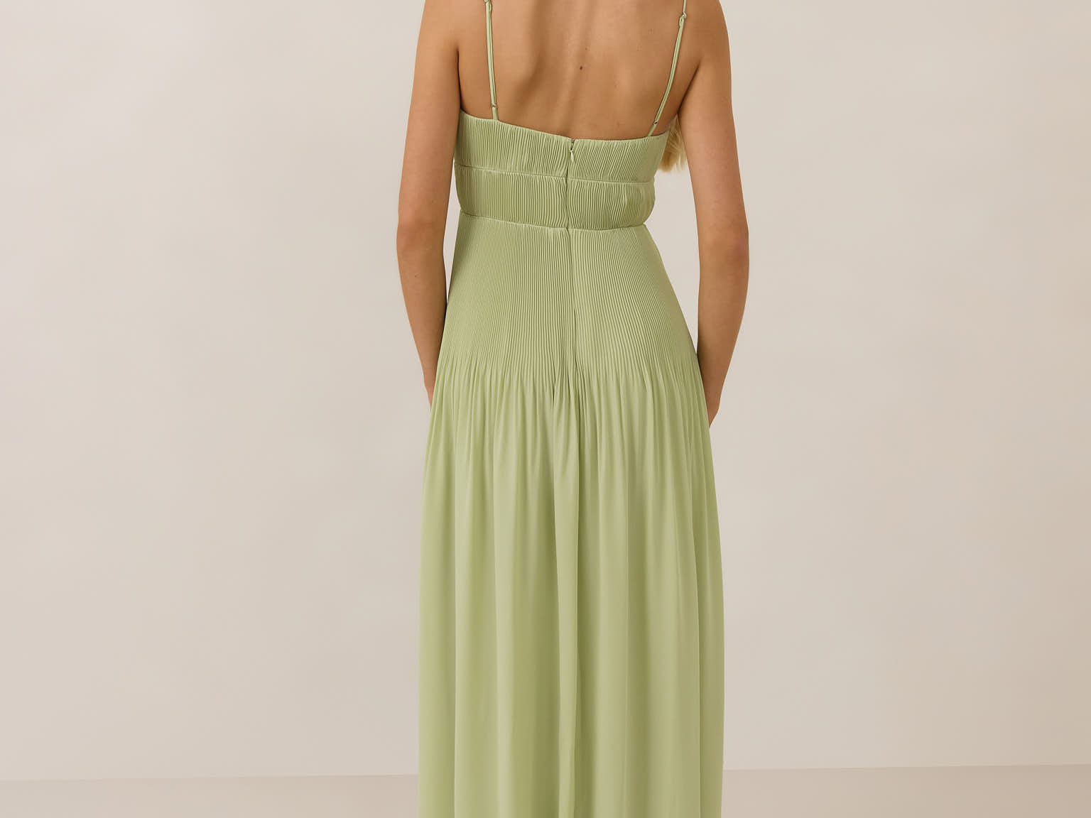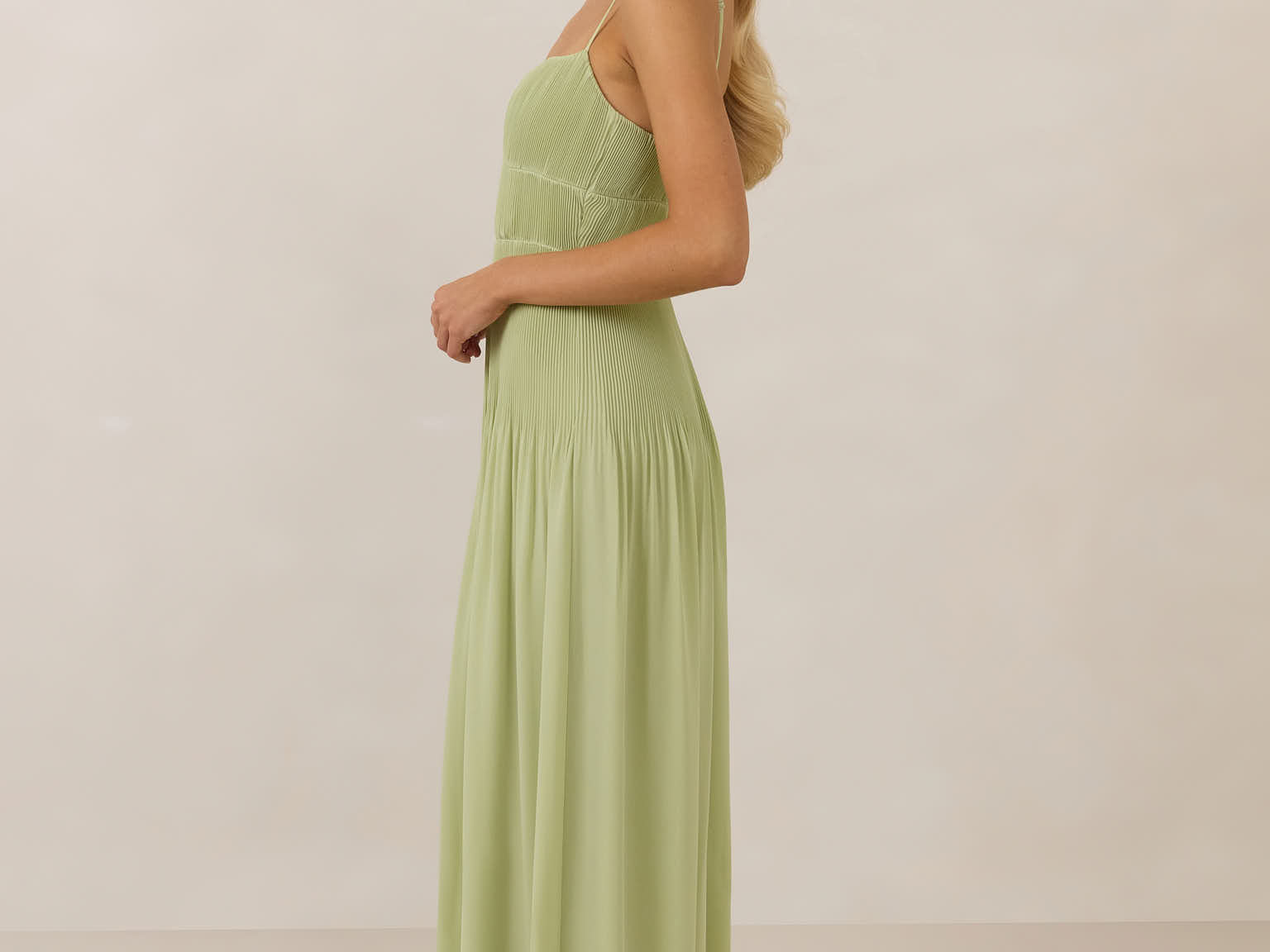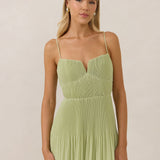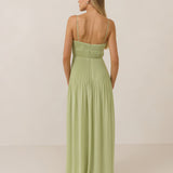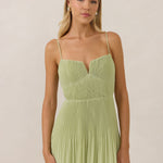 The Lena dress, crafted from airy chiffon, is a harmonious blend of elegance and movement. Its softly pleated skirt drapes gracefully, creating an ethereal flow with every stride. A modern touch is added by the structured V-wire neckline, which not only provides support but also subtly enhances the romantic silhouette.