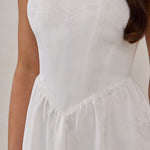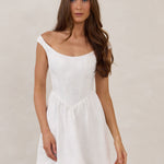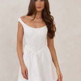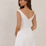 The Lennon Dress is crafted from jacquard satin with a subtle floral texture and a soft structured bodice. Featuring a flattering off-the-shoulder neckline and gently gathered skirt, it’s polished, playful, and made for all your white-dress moments.
