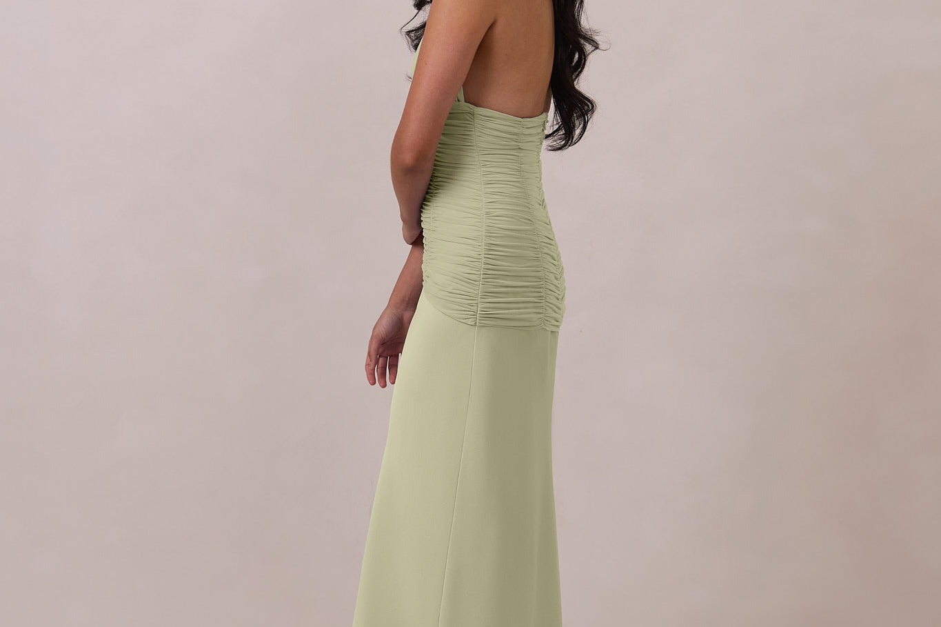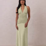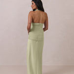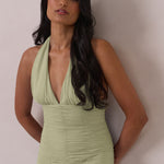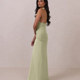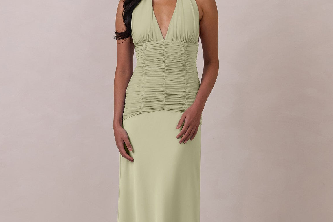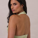 The Monroe is a modern halter dress cut in stretch chiffon and bubble satin for a balance of texture and structure. The bodice features a gathered chiffon overlay that contours the waist, while a bias-cut satin skirt drapes effortlessly for a smooth, flattering fit. Finished with a halter neckline secured by two buttons at the back and a discreet center-back zipper, this piece is designed for ease and movement while maintaining a polished silhouette.