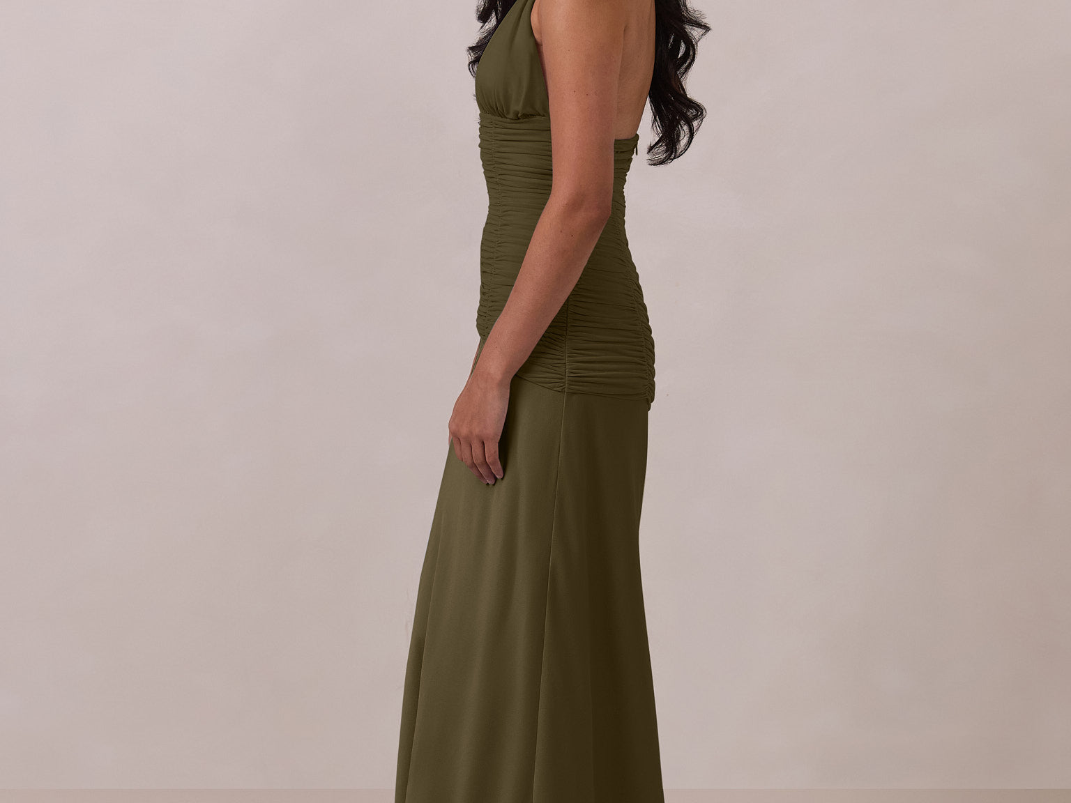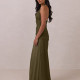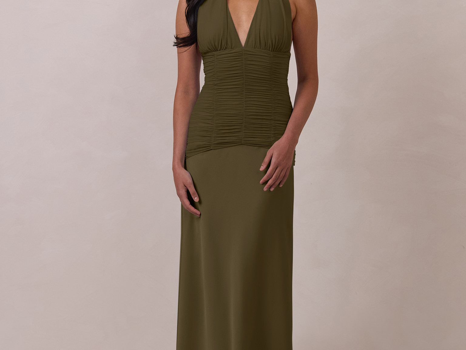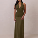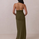 The Monroe is a modern halter dress cut in stretch chiffon and bubble satin for a balance of texture and structure. The bodice features a gathered chiffon overlay that contours the waist, while a bias-cut satin skirt drapes effortlessly for a smooth, flattering fit. Finished with a halter neckline secured by two buttons at the back and a discreet center-back zipper, this piece is designed for ease and movement while maintaining a polished silhouette.