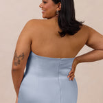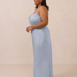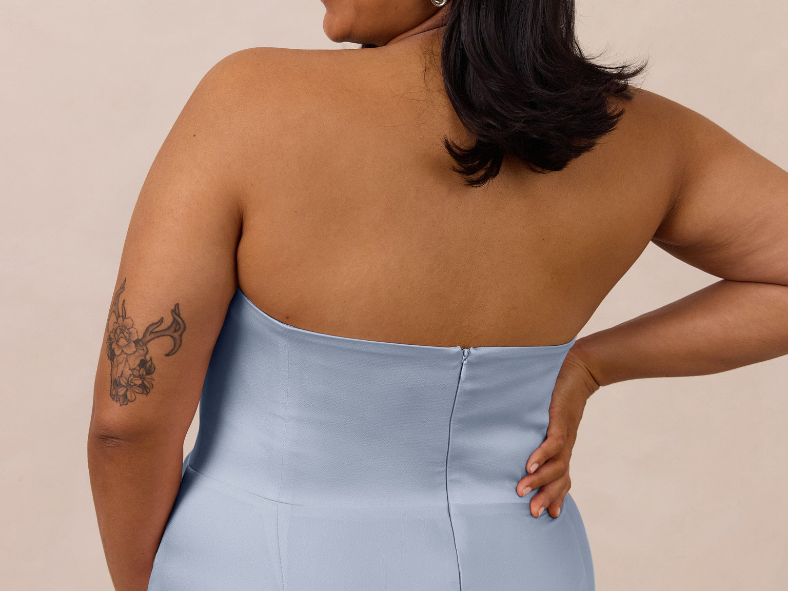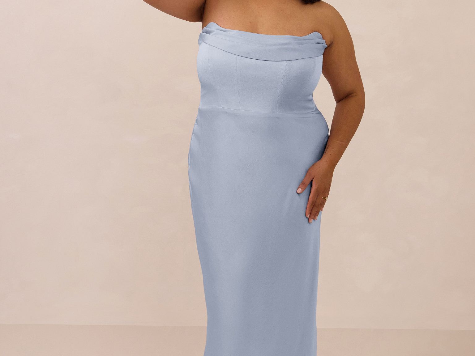 • Strapless with exaggerated point detail