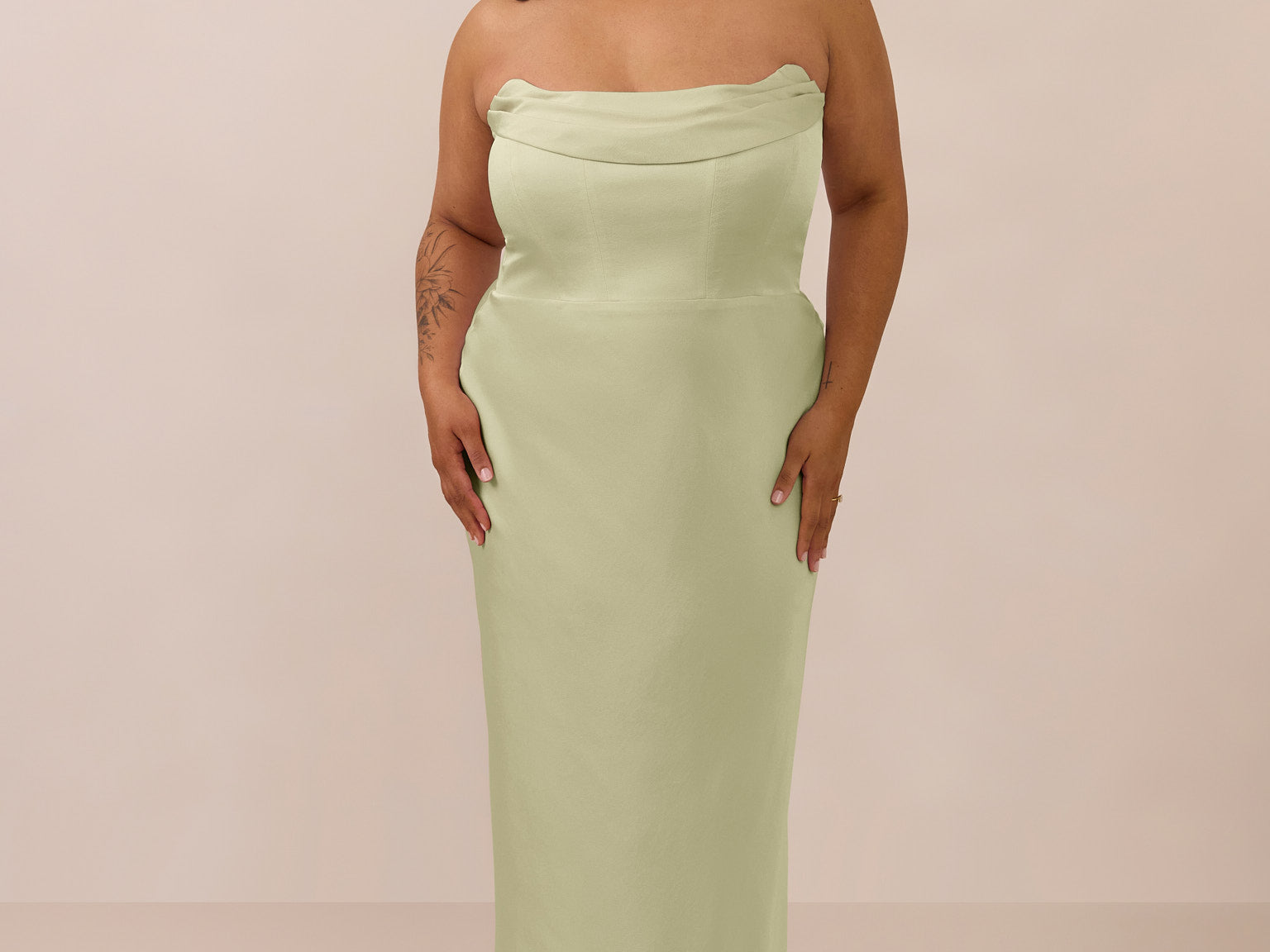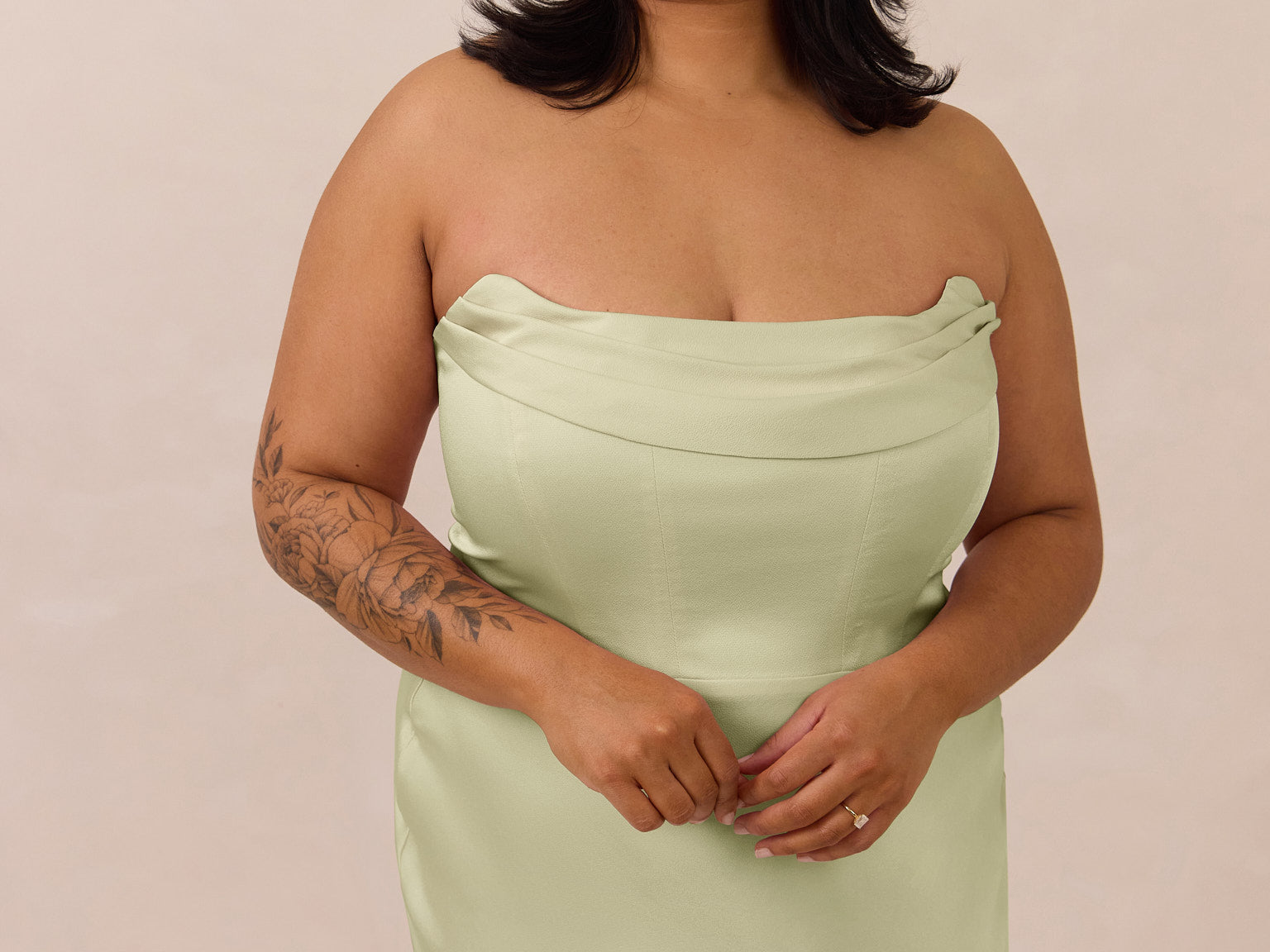 • Strapless with exaggerated point detail