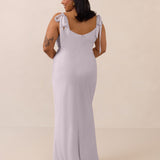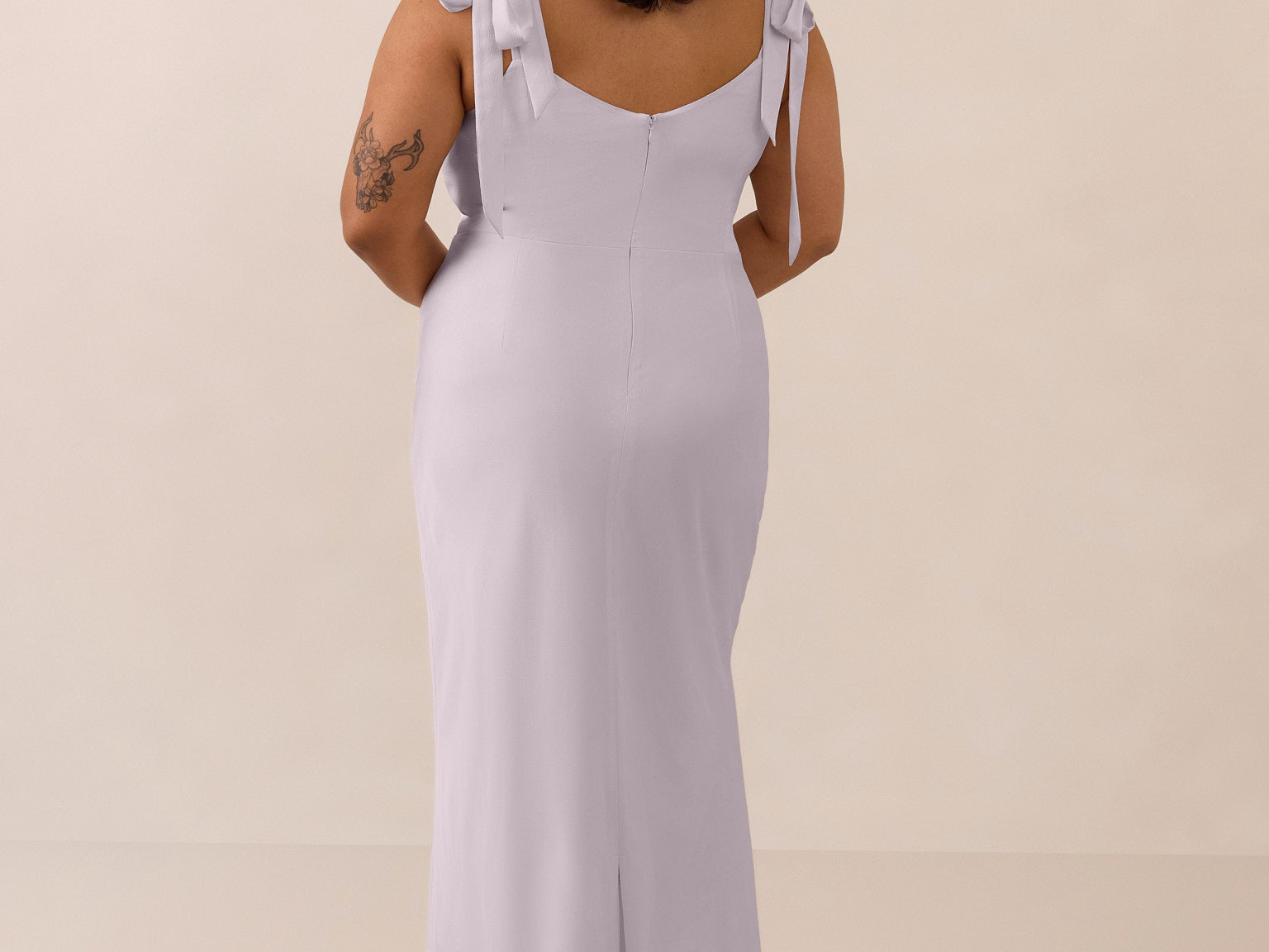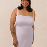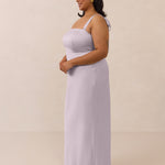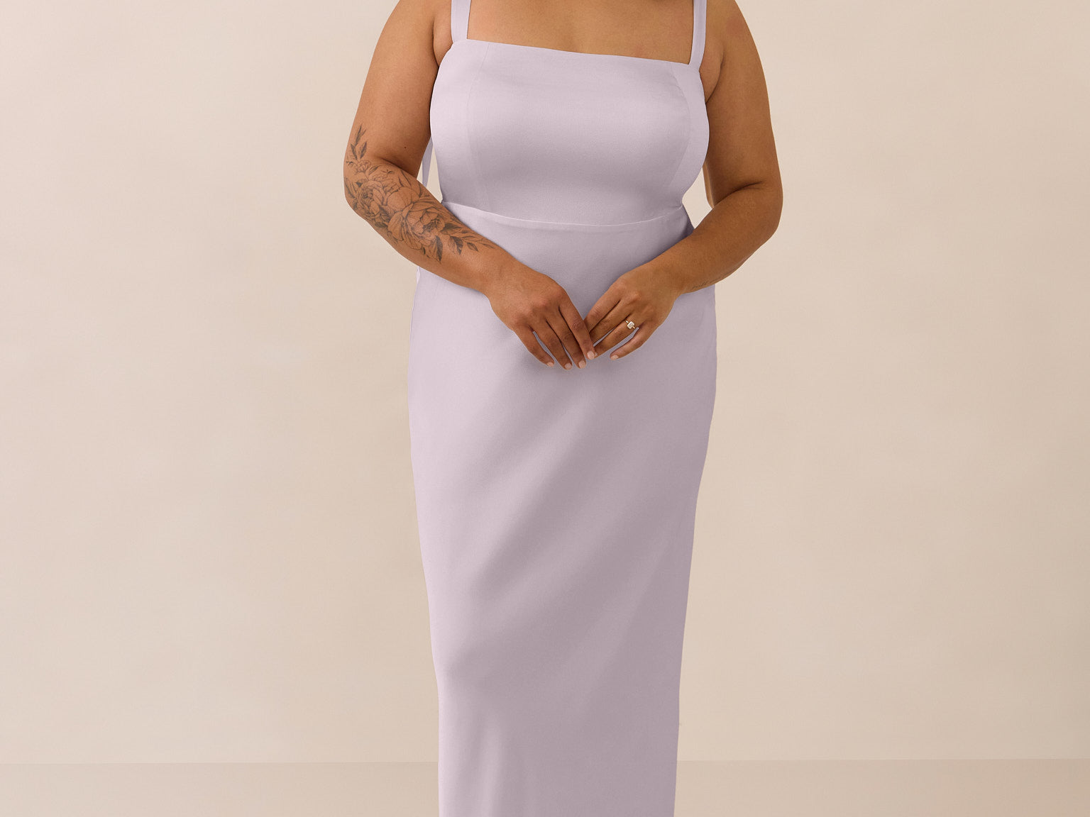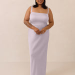 This full-length dress, made from luxurious satin, features a sleek square neckline and thick tie straps, offering a structured yet effortless aesthetic. The slim-fit skirt gently embraces the body, creating a smooth and elongated silhouette. An invisible back zipper ensures a seamless finish, making this dress ideal for sophisticated evening events.