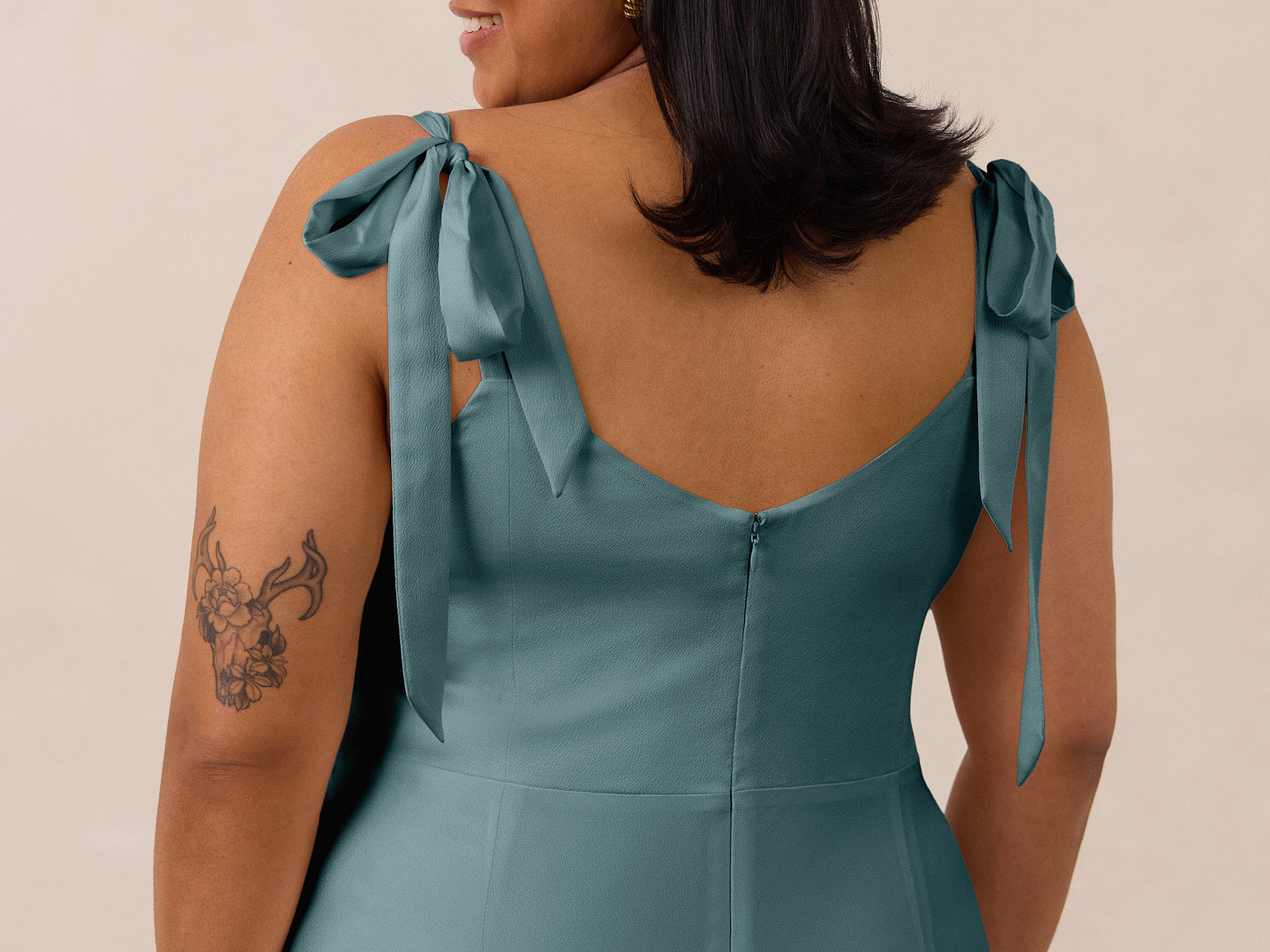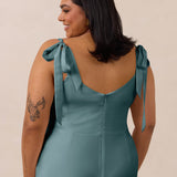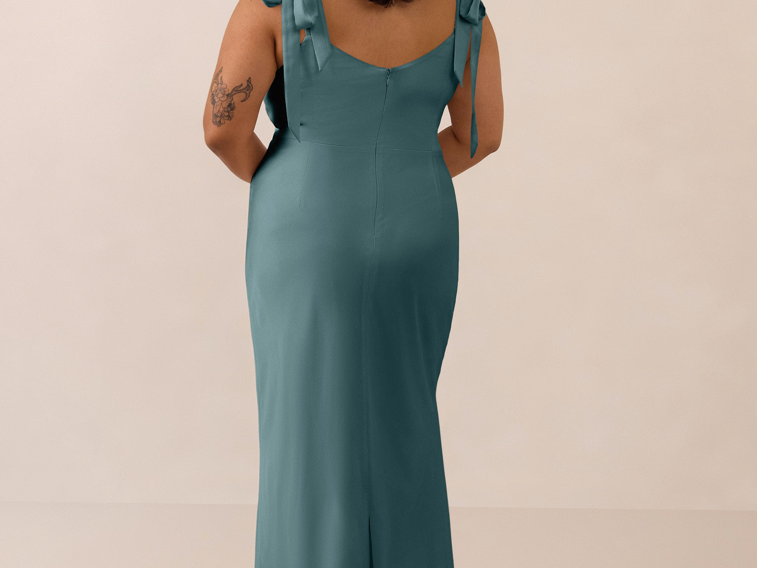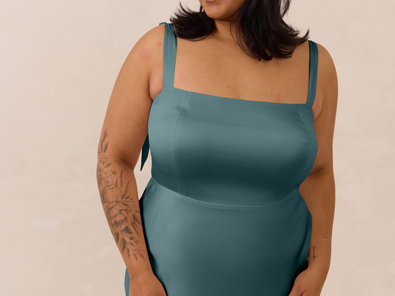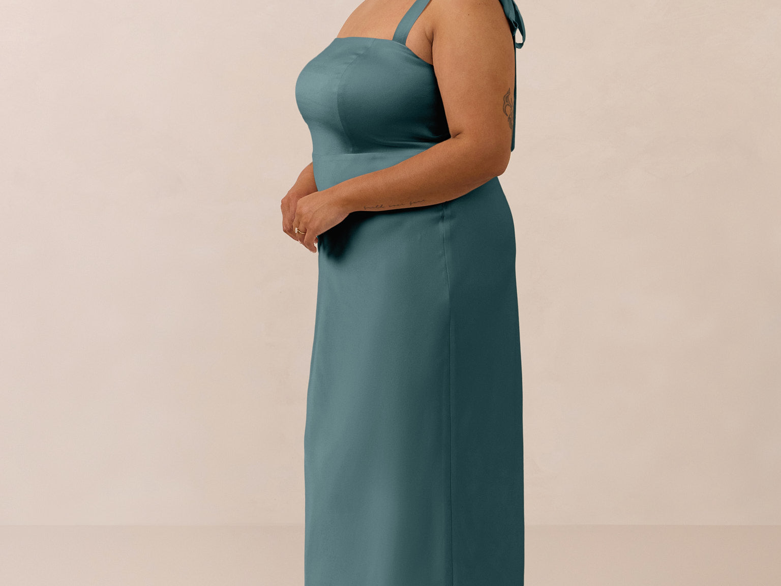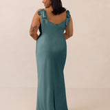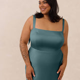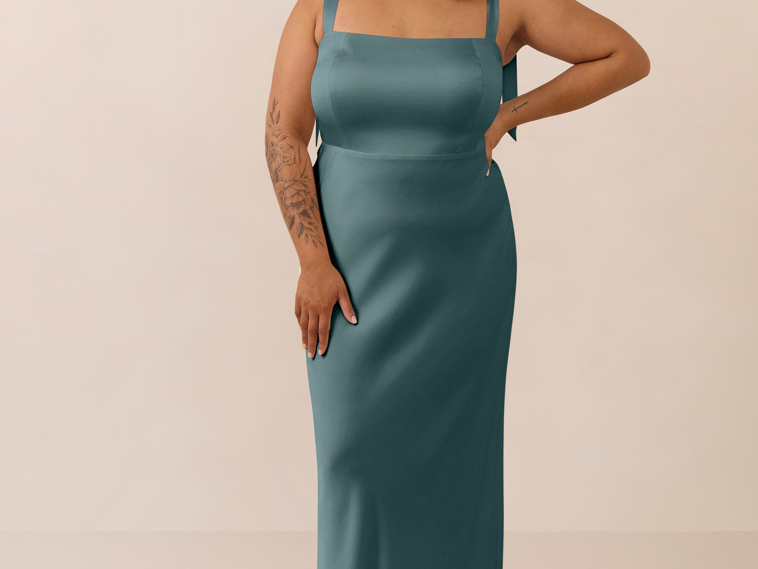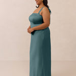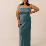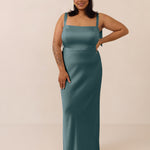 This full-length dress, made from luxurious satin, features a sleek square neckline and thick tie straps, offering a structured yet effortless aesthetic. The slim-fit skirt gently embraces the body, creating a smooth and elongated silhouette. An invisible back zipper ensures a seamless finish, making this dress ideal for sophisticated evening events.
