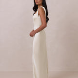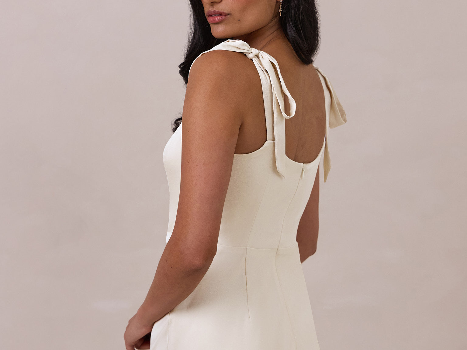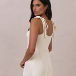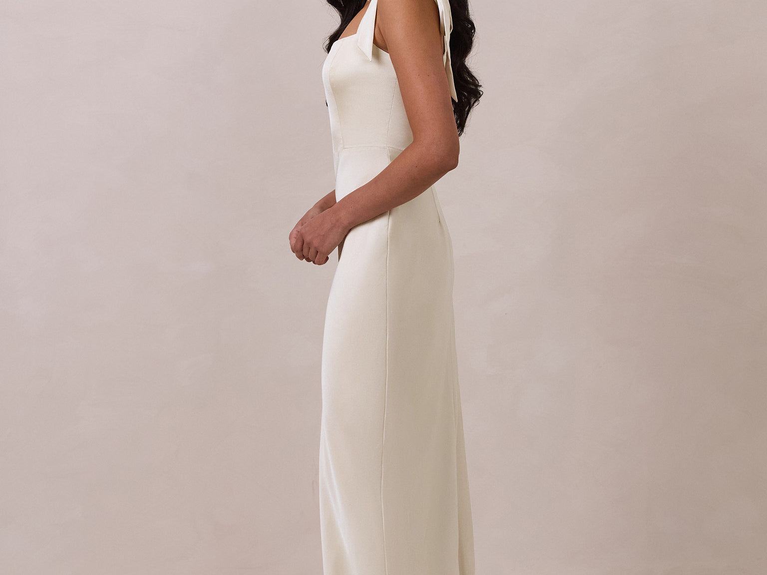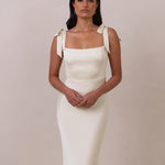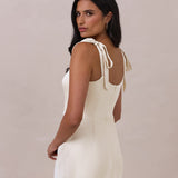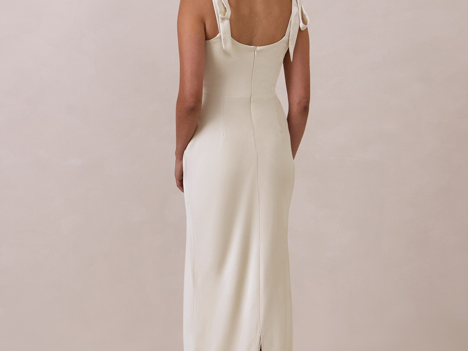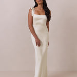 This full-length dress, made from luxurious satin, features a sleek square neckline and thick tie straps, offering a structured yet effortless aesthetic. The slim-fit skirt gently embraces the body, creating a smooth and elongated silhouette. An invisible back zipper ensures a seamless finish, making this dress ideal for sophisticated evening events.