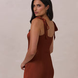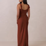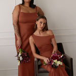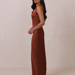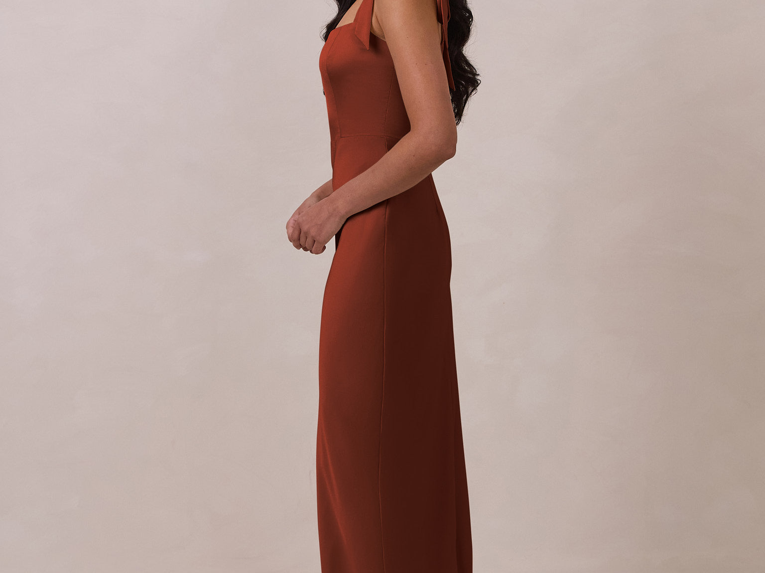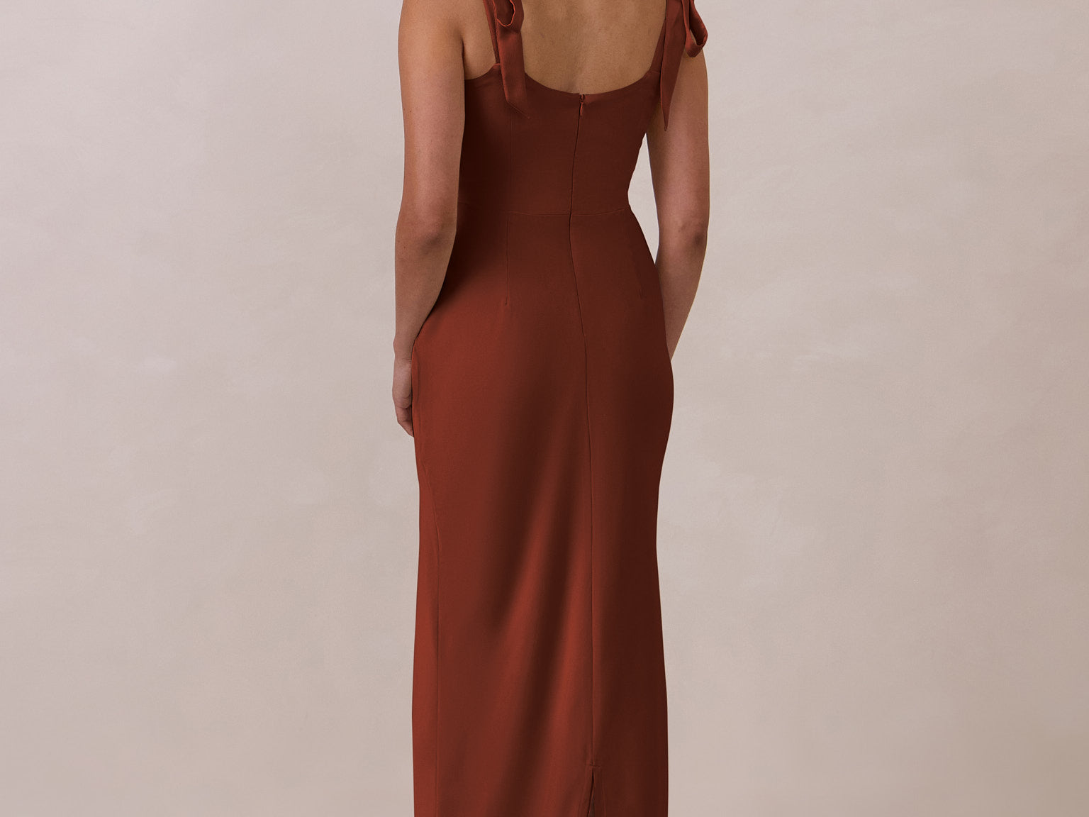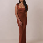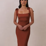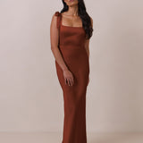 This full-length dress, made from luxurious satin, features a sleek square neckline and thick tie straps, offering a structured yet effortless aesthetic. The slim-fit skirt gently embraces the body, creating a smooth and elongated silhouette. An invisible back zipper ensures a seamless finish, making this dress ideal for sophisticated evening events.