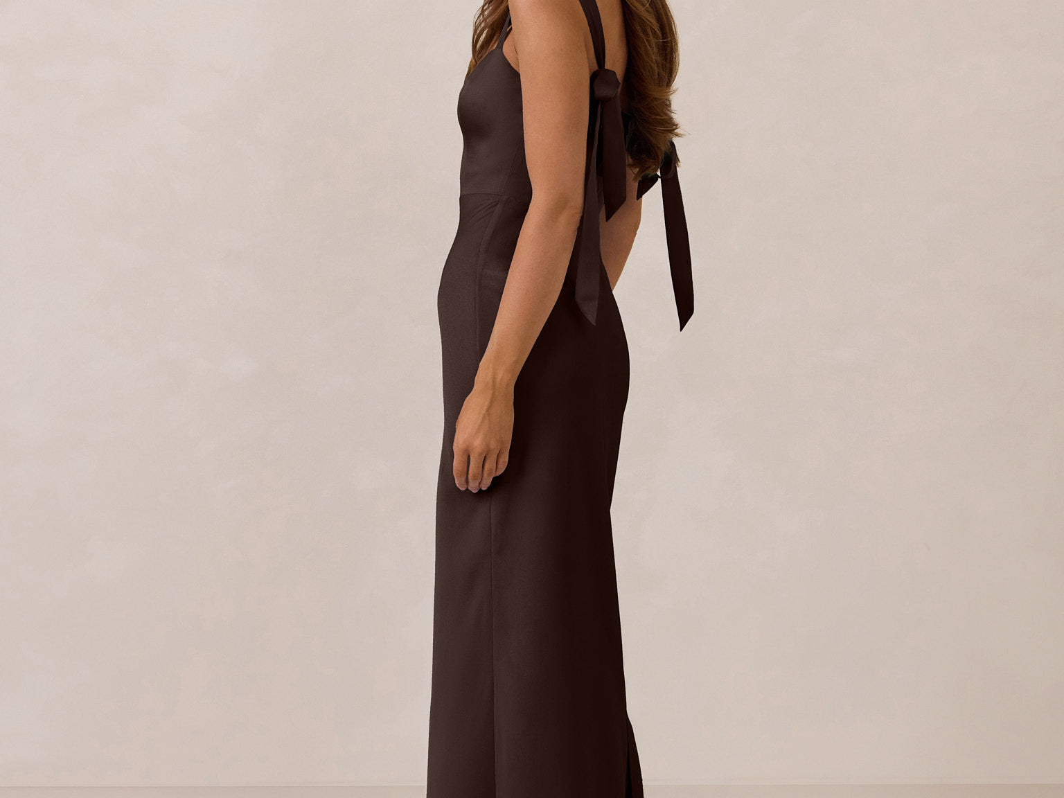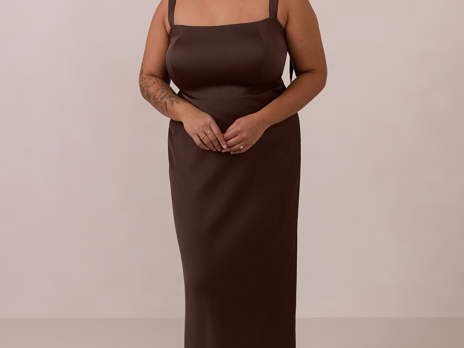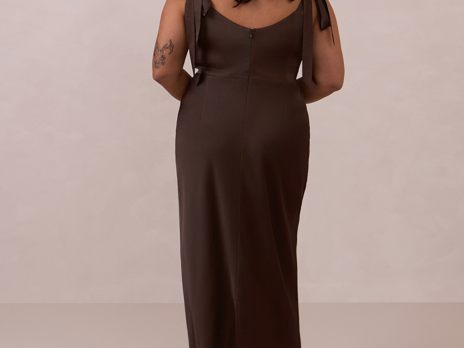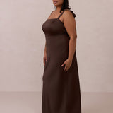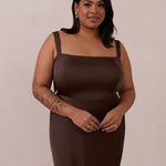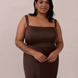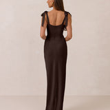 This full-length dress, made from luxurious satin, features a sleek square neckline and thick tie straps, offering a structured yet effortless aesthetic. The slim-fit skirt gently embraces the body, creating a smooth and elongated silhouette. An invisible back zipper ensures a seamless finish, making this dress ideal for sophisticated evening events.