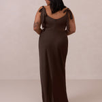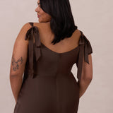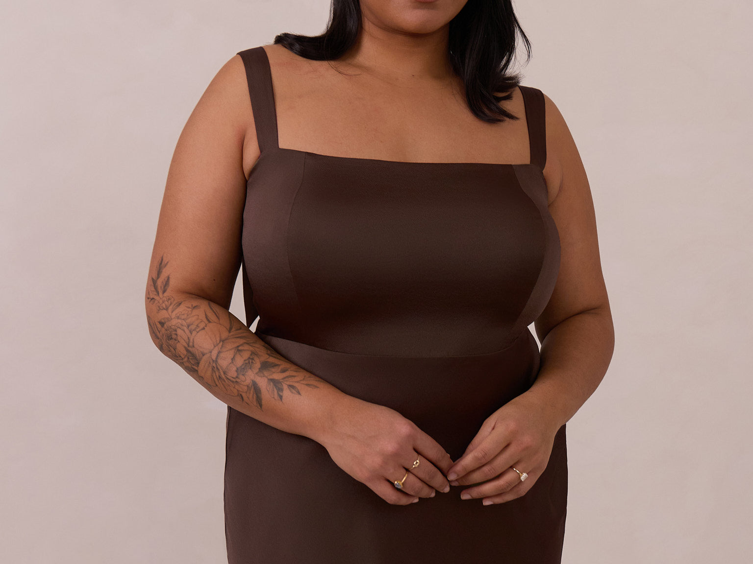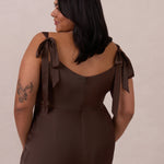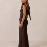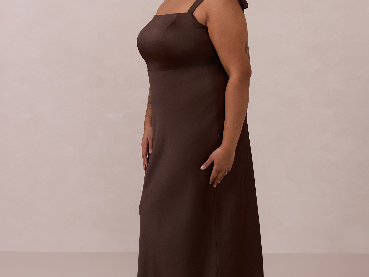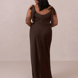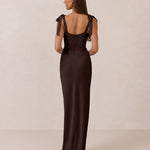 This full-length dress, made from luxurious satin, features a sleek square neckline and thick tie straps, offering a structured yet effortless aesthetic. The slim-fit skirt gently embraces the body, creating a smooth and elongated silhouette. An invisible back zipper ensures a seamless finish, making this dress ideal for sophisticated evening events.