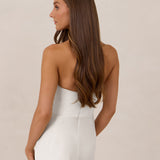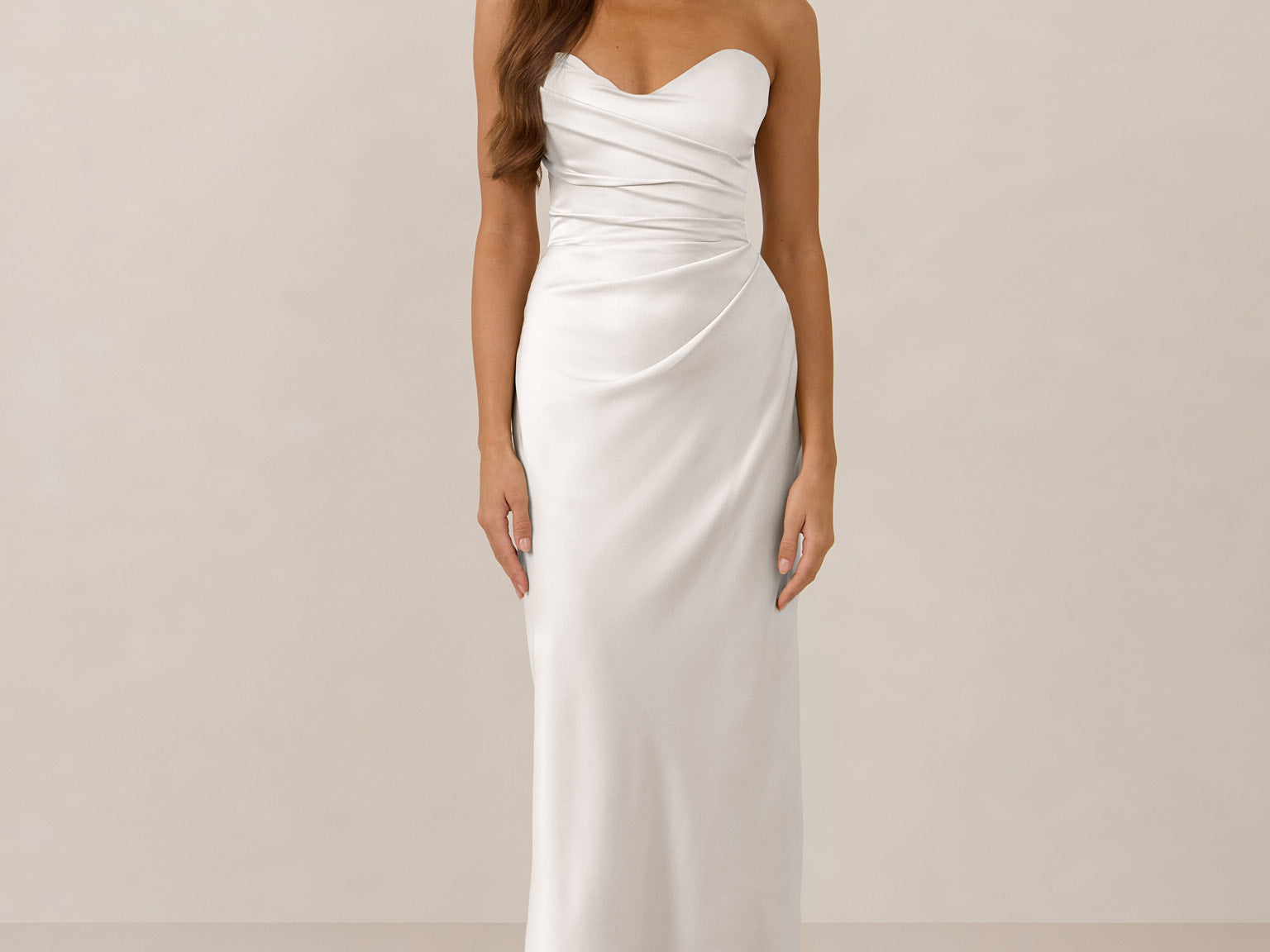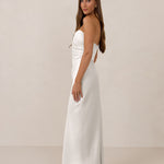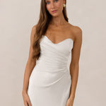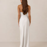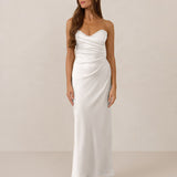 Designed with a scoop sweetheart neckline and soft pleating through the boned bodice and skirt, this dress creates a sleek, feminine silhouette. Elegant and timeless, it’s an ideal choice for weddings, receptions, or any formal occasion.